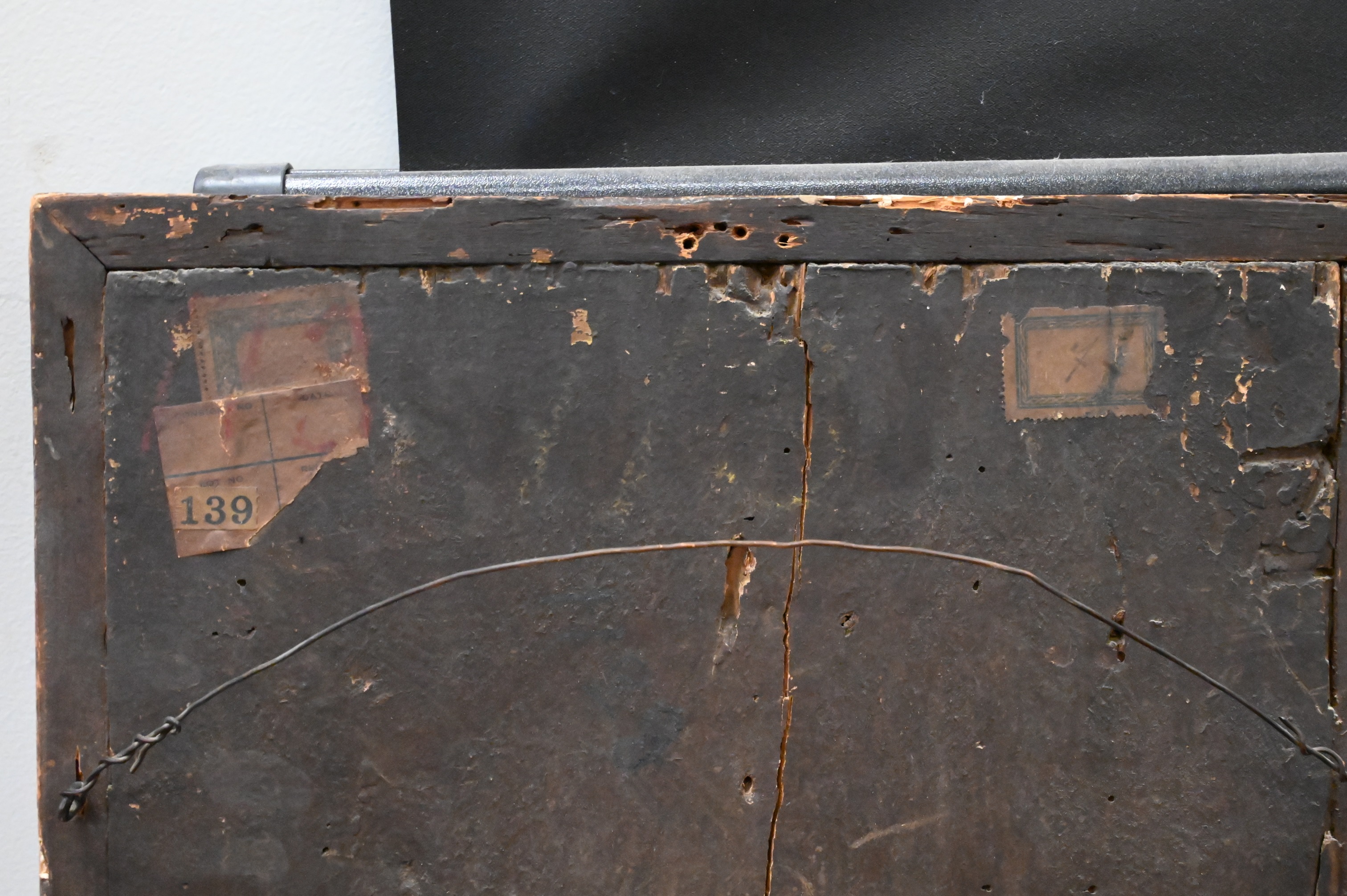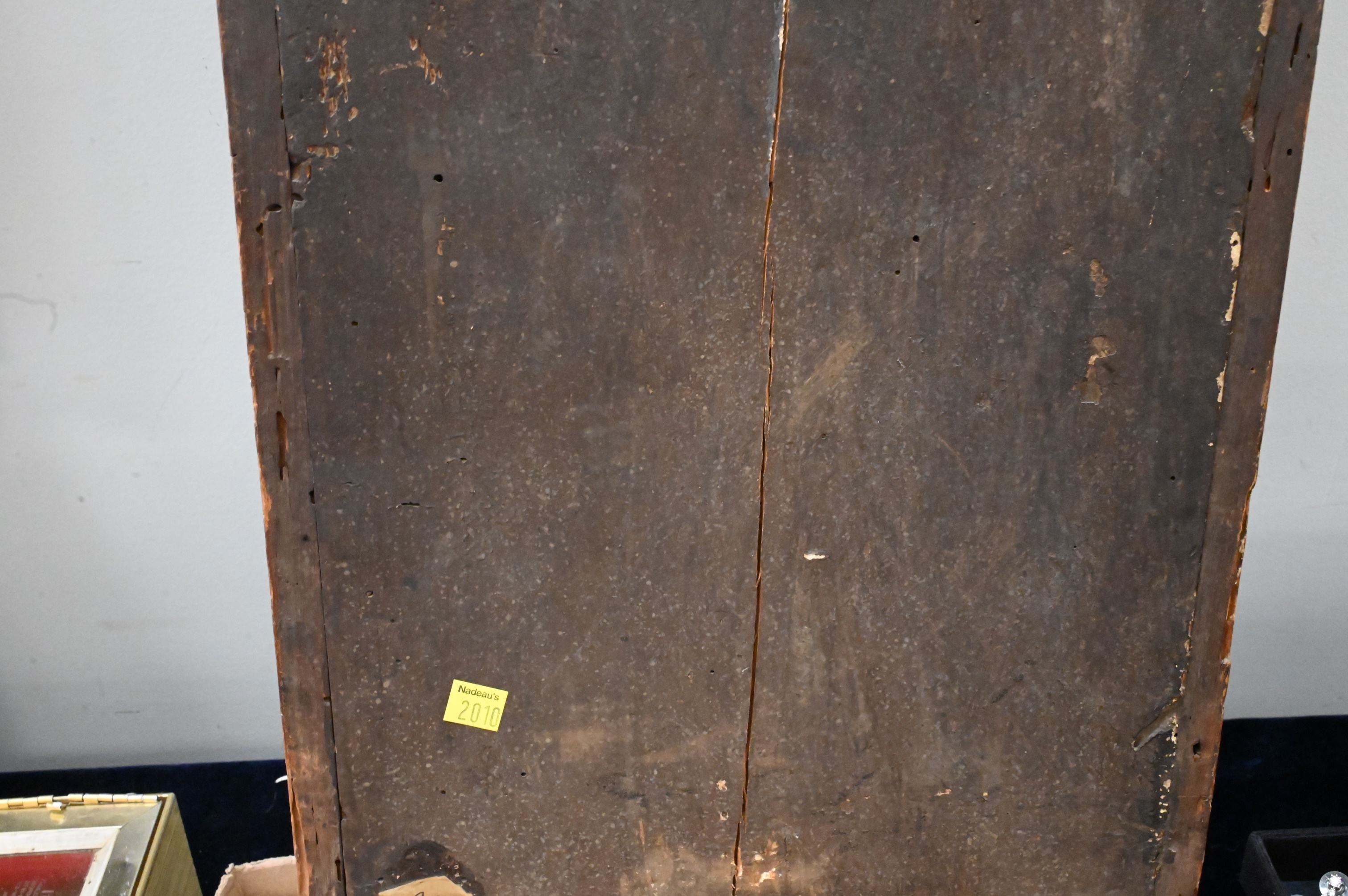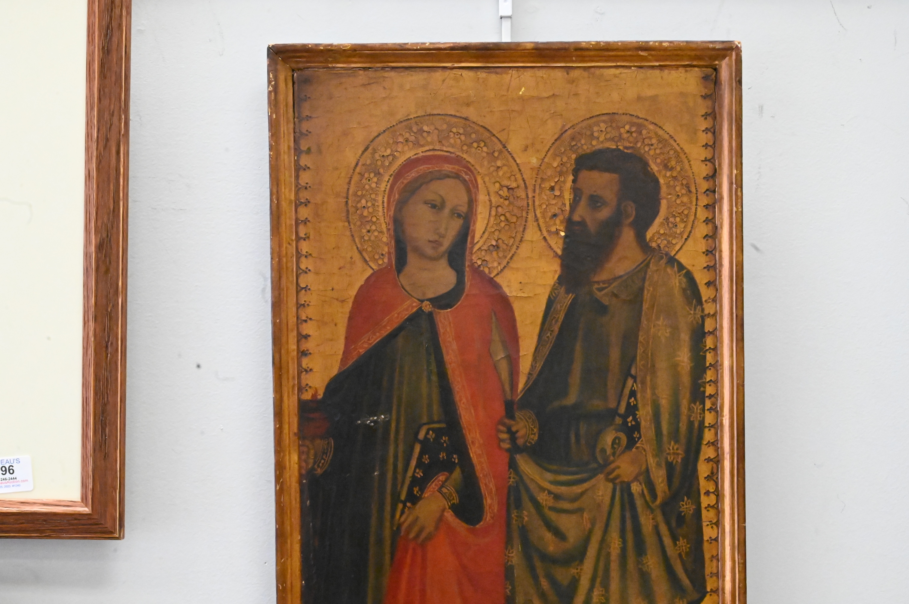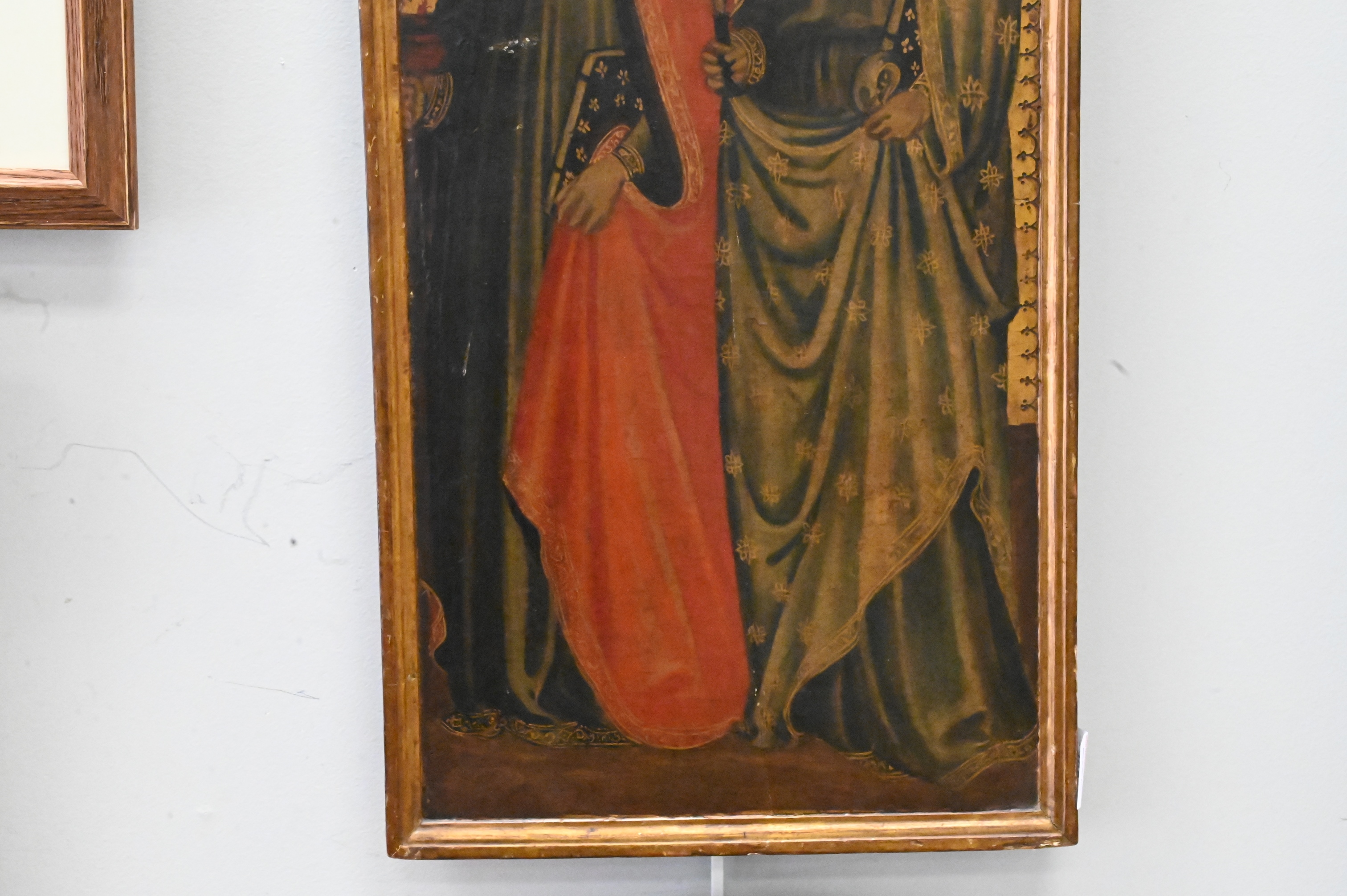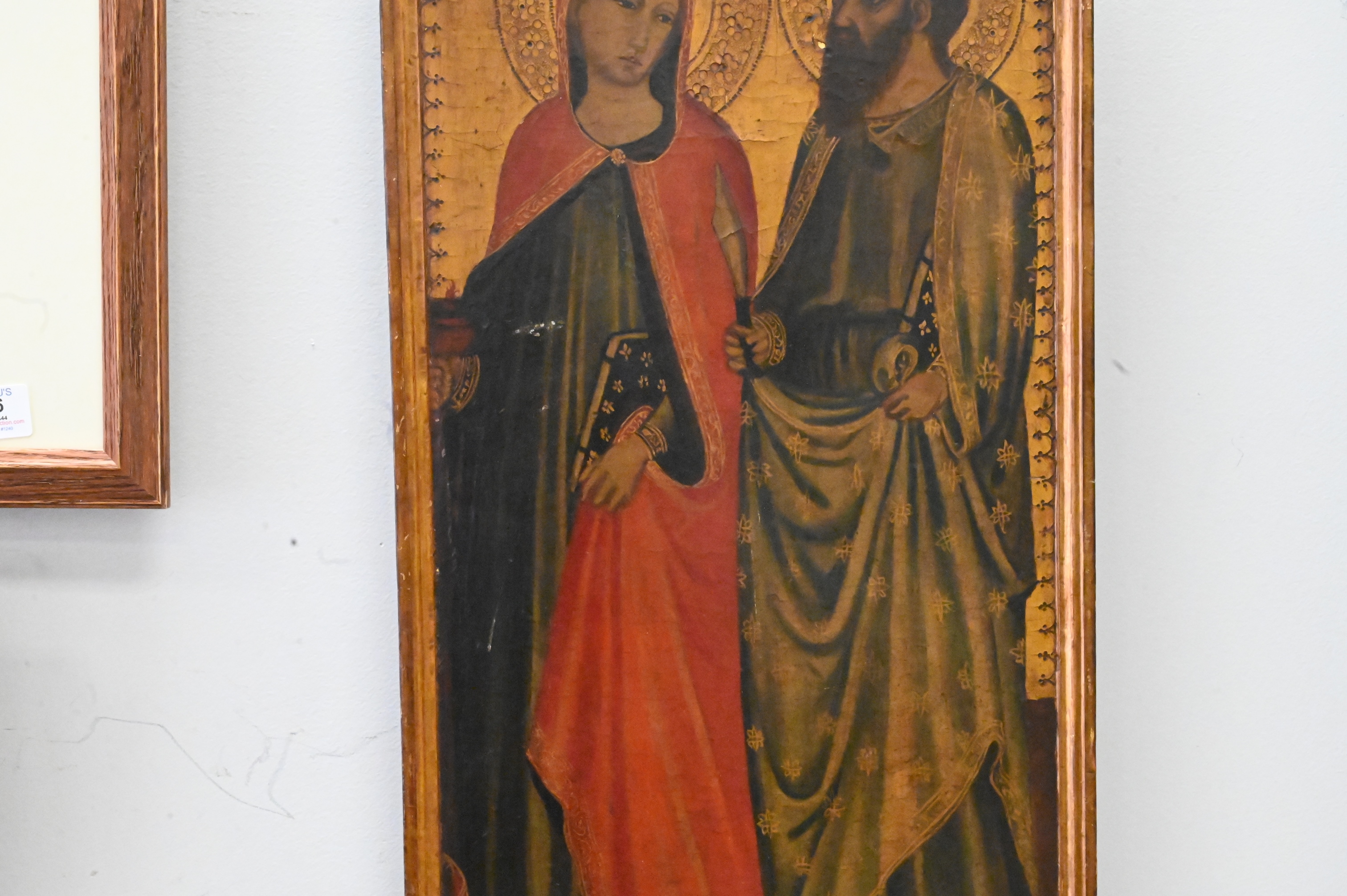 Religious Icon, full length of saints, 19th century or earlier, bearing old paper labels on the back, 26 1/2″ x 13 1/2″.