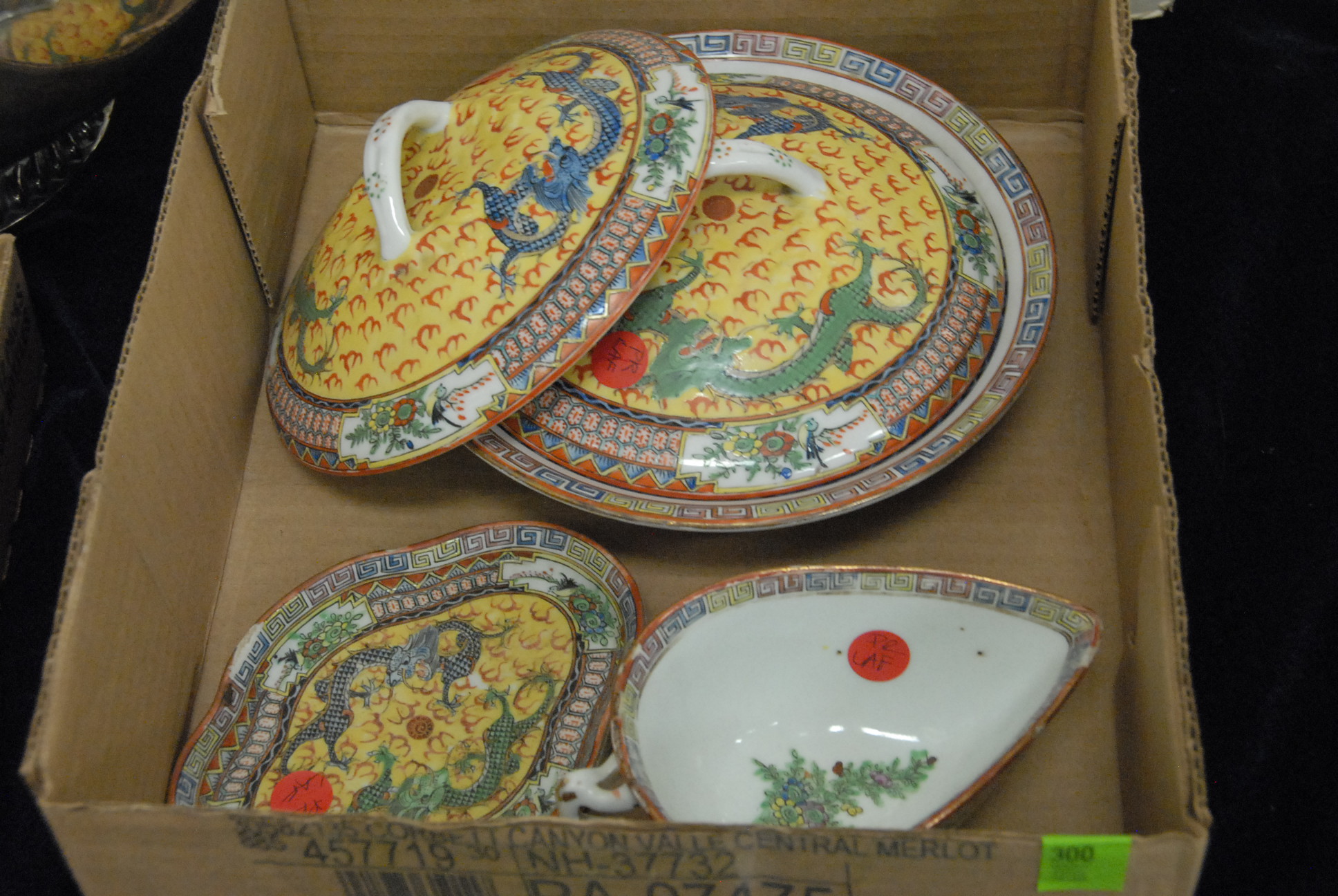 Rose Famille lot including a covered dish, small shaped platter, large platter, gravy boat, and an extra cover.
