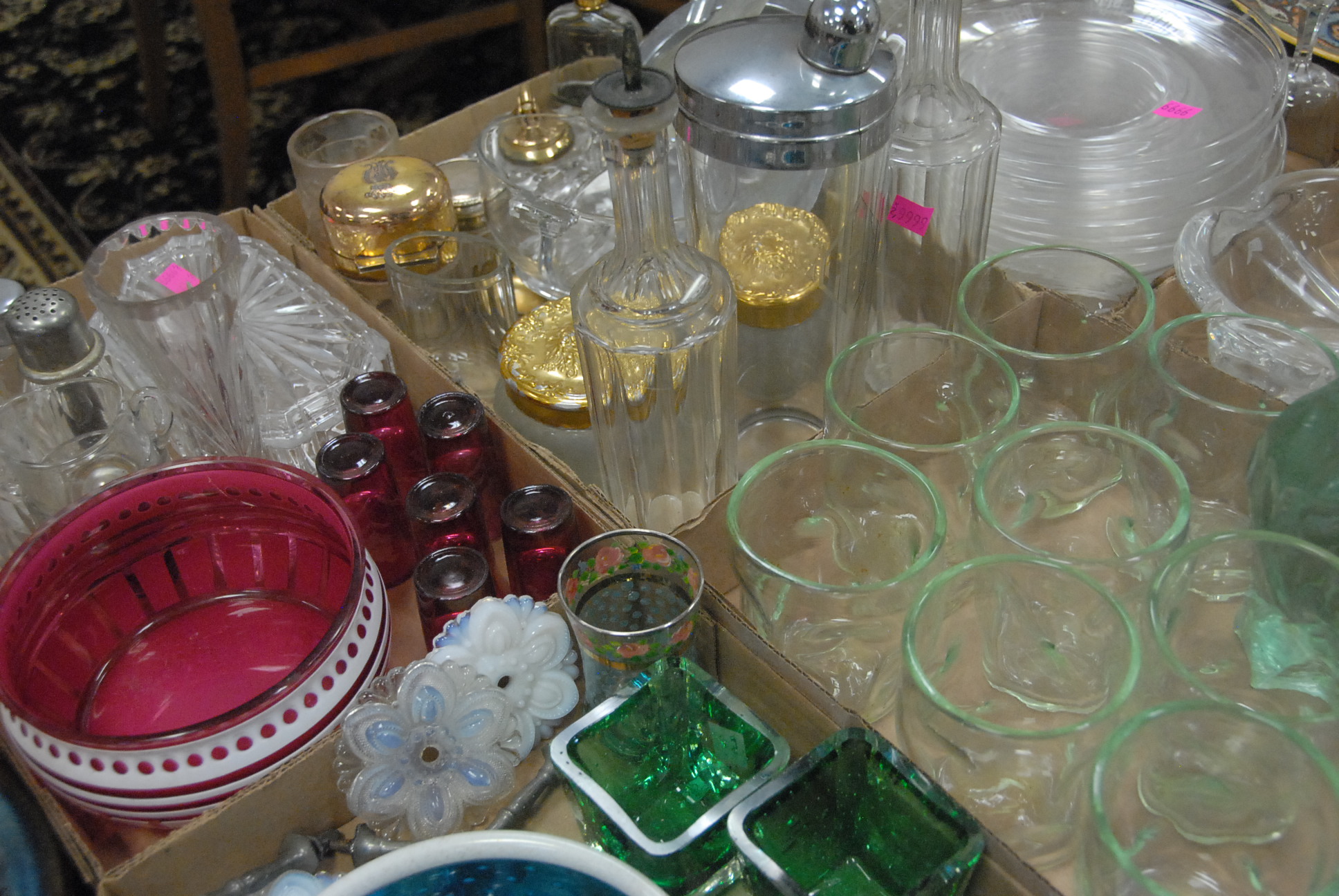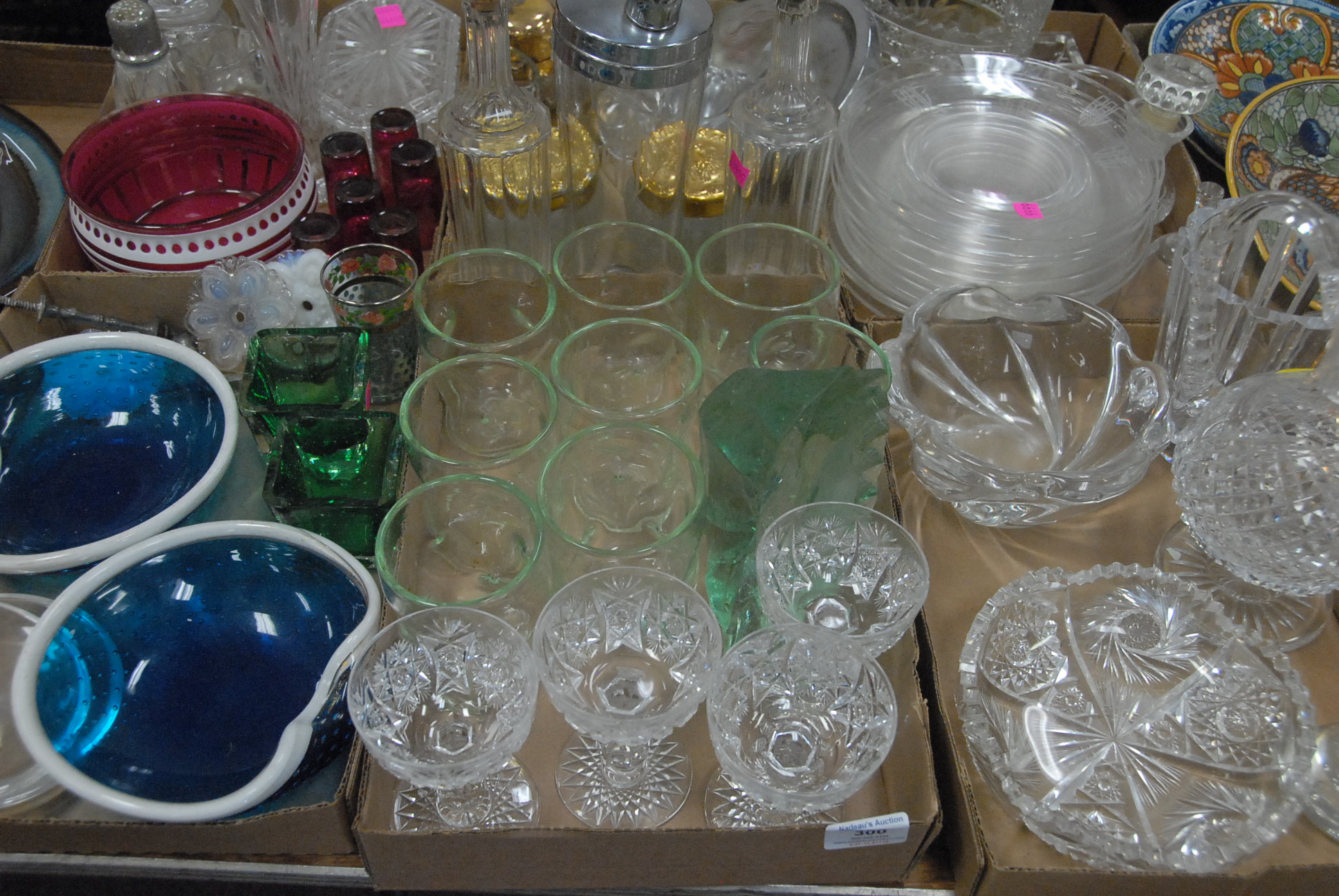 Lot 300: Six boxes of glass and artglass to include cut glass stems, Murano glass bowls, set of 8 pinch glass tumblers, Libby plates, cut gla…