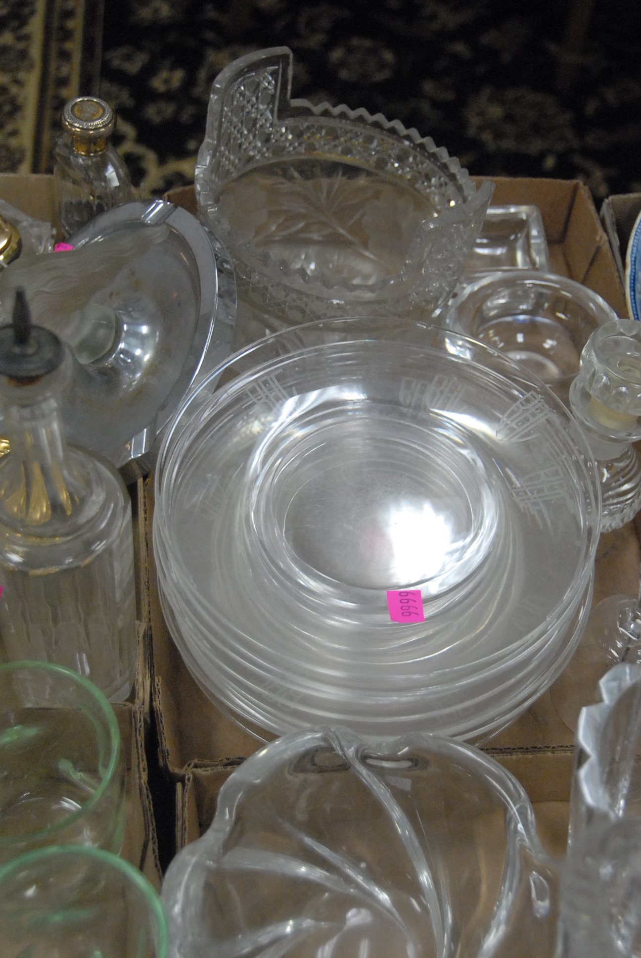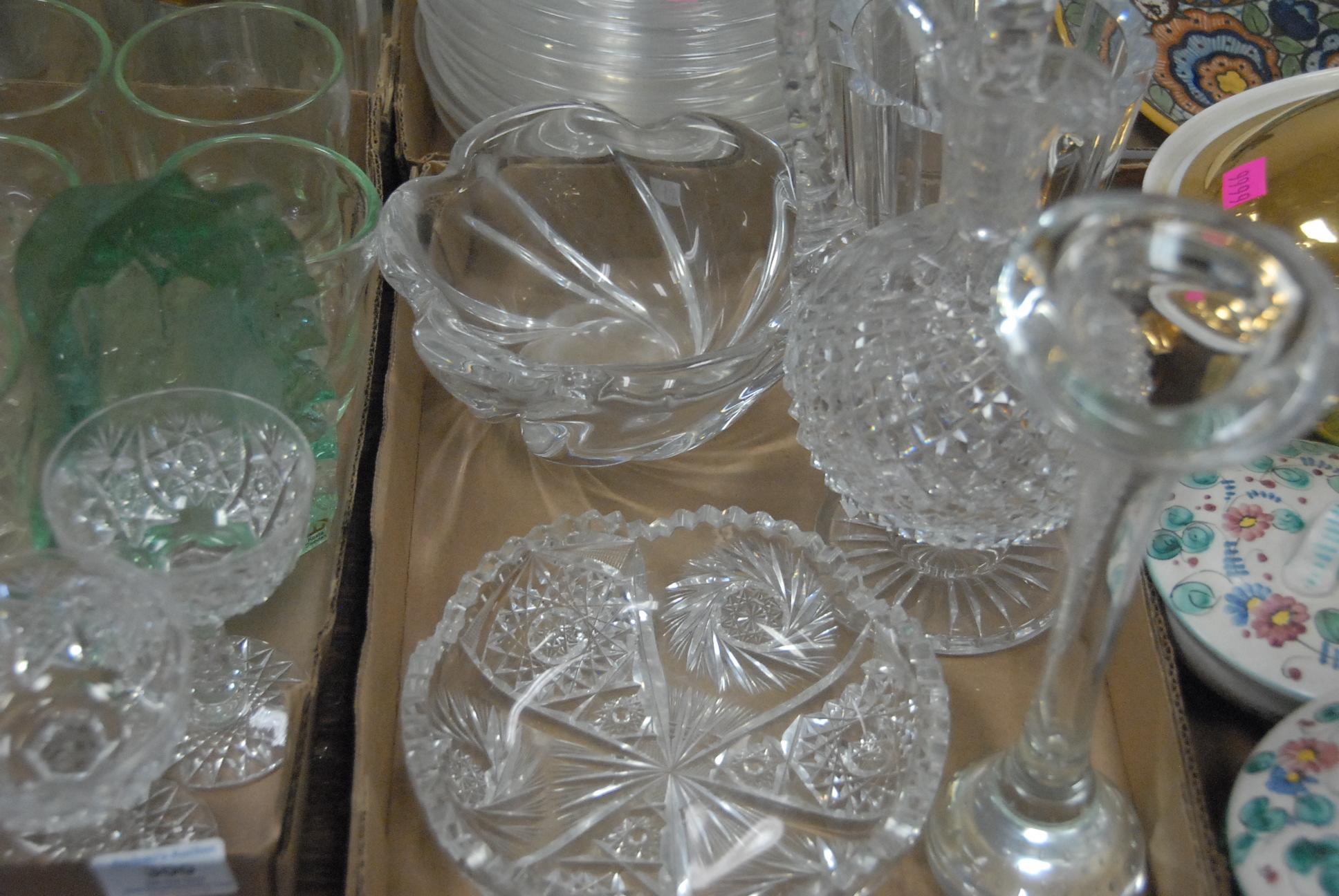 Six boxes of glass and artglass to include cut glass stems, Murano glass bowls, set of 8 pinch glass tumblers, Libby plates, cut glass bowls, Orrefors vases, etc.
