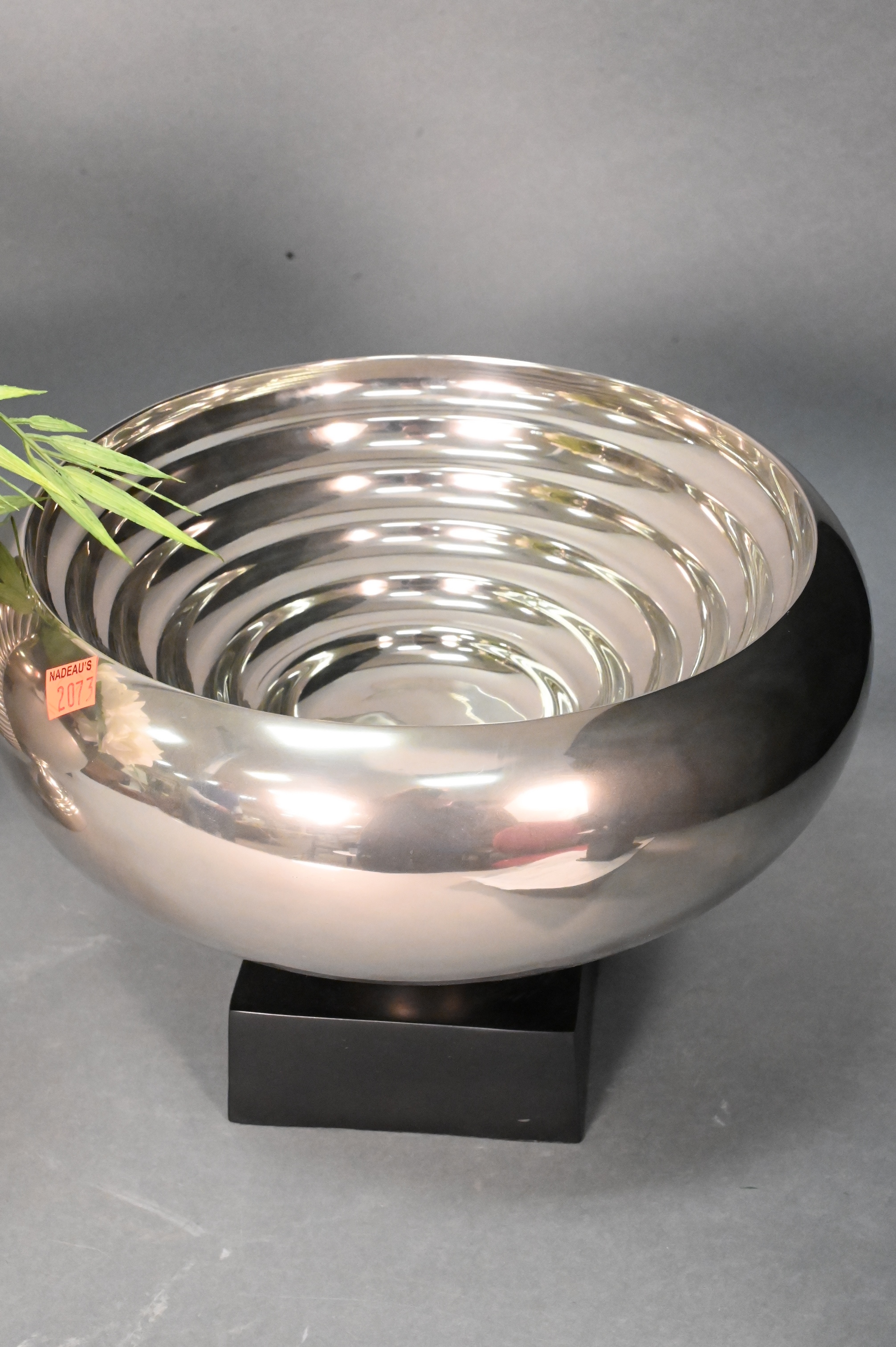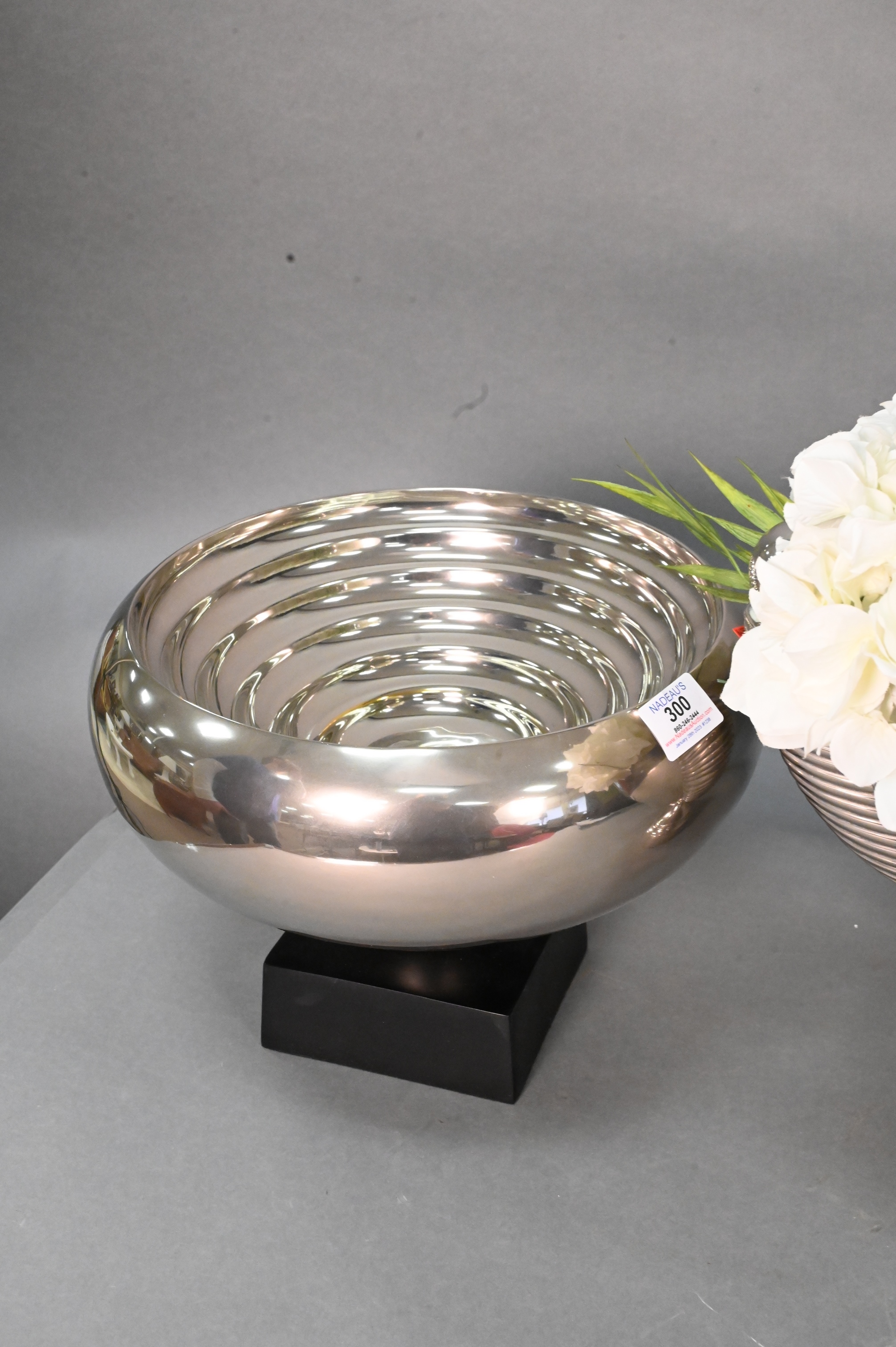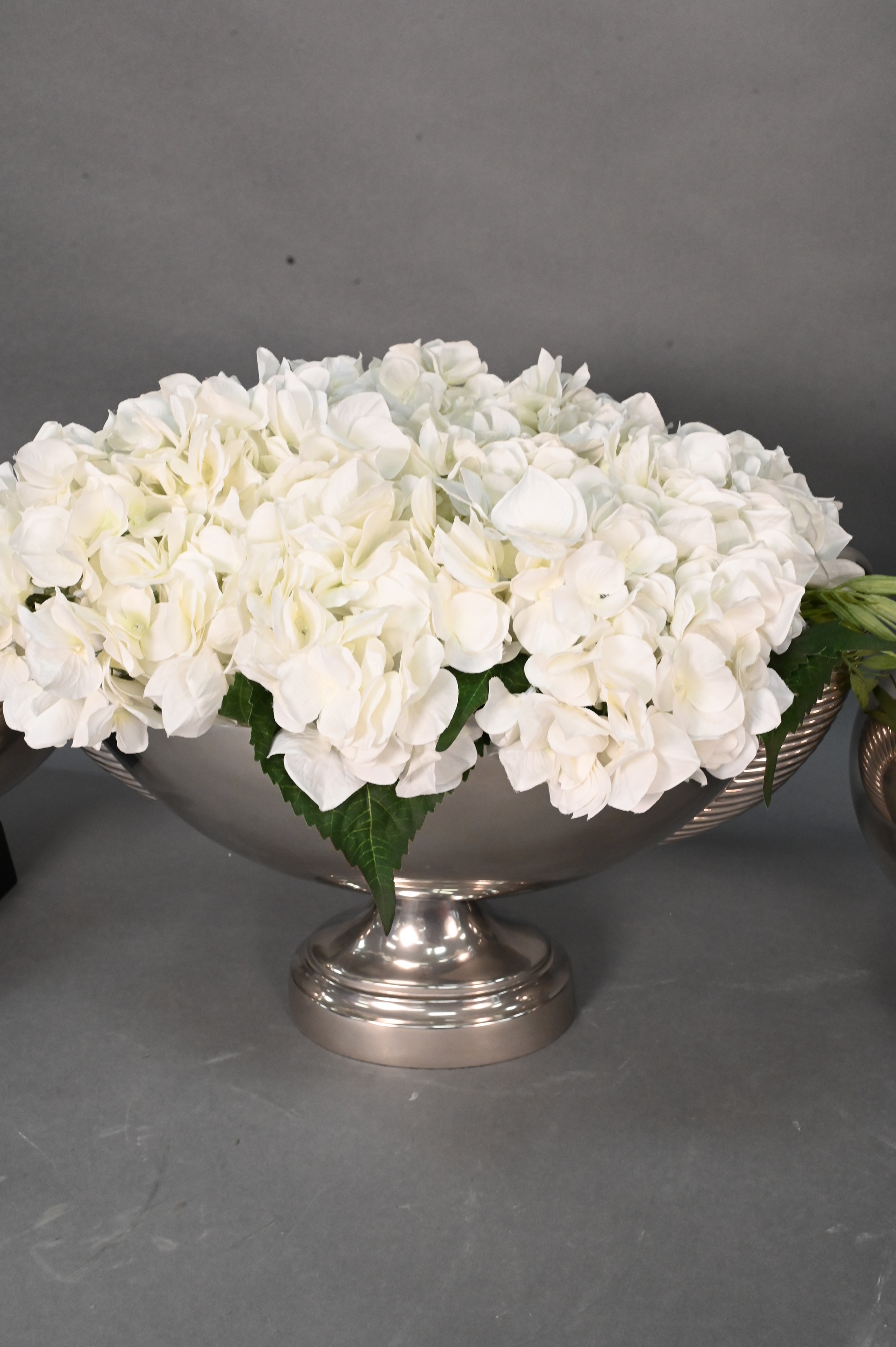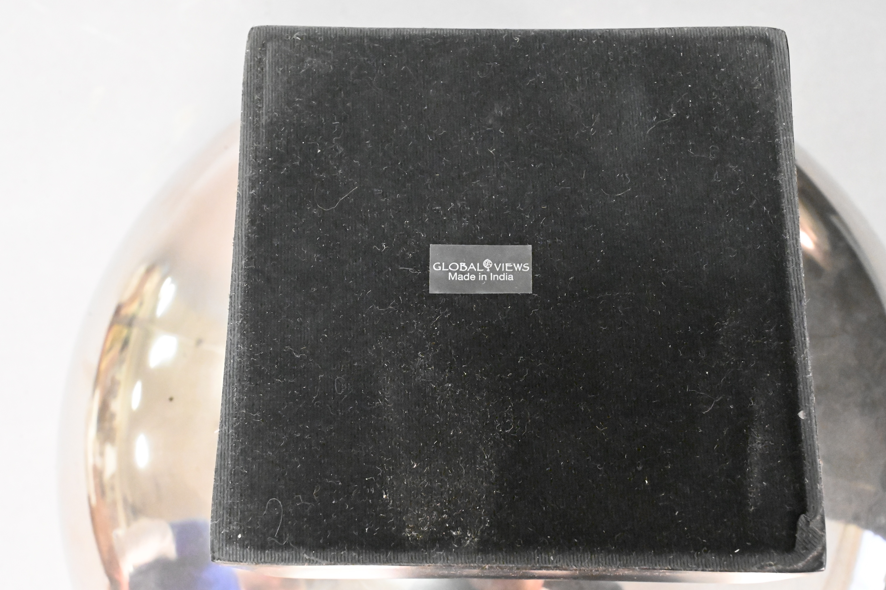Three Piece Global Views Group, to include a pair of silvered metal contemporary compotes, height 9 inches; along with a matching oblong center bowl with flowers, height 10 inches.
