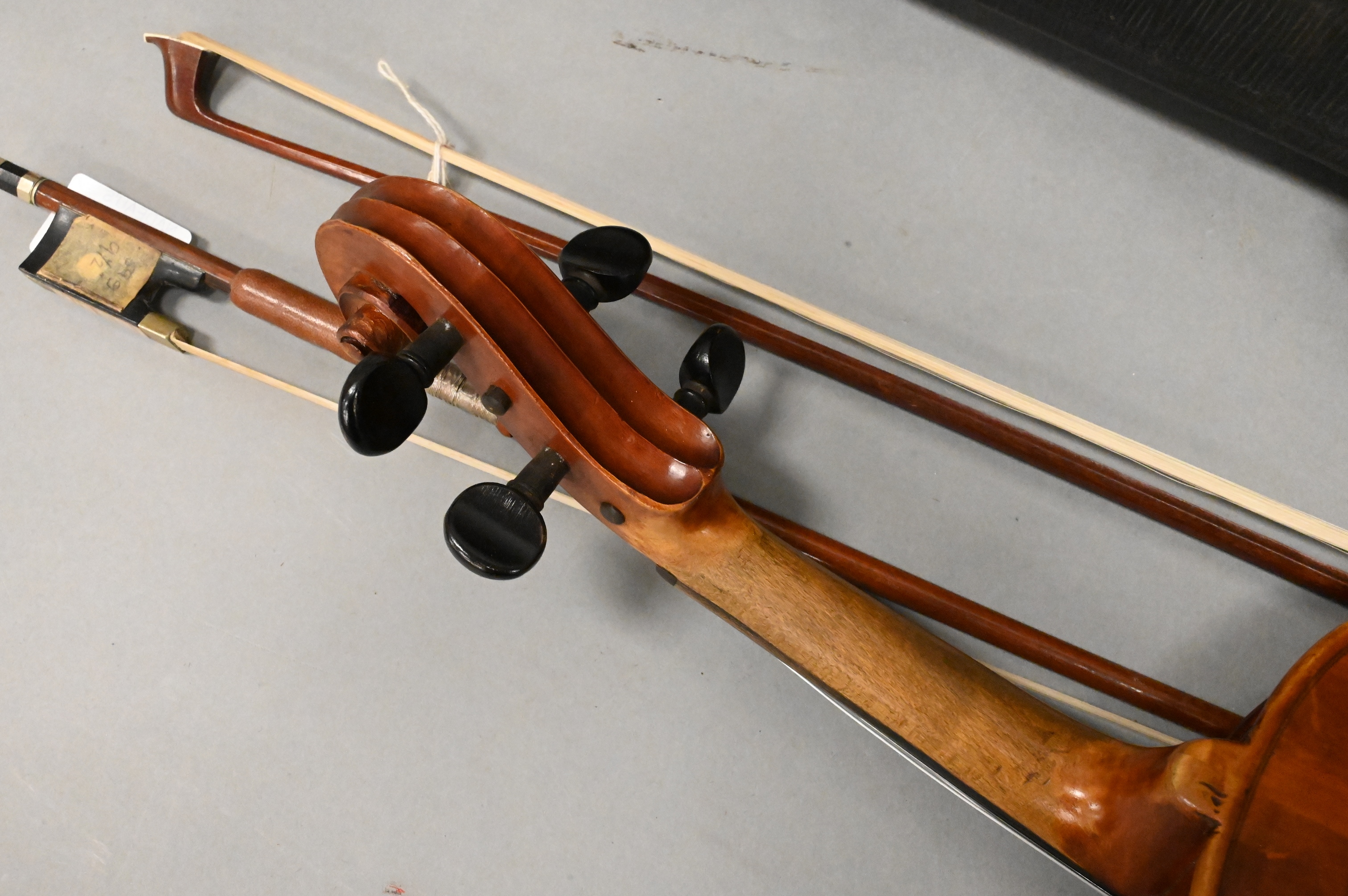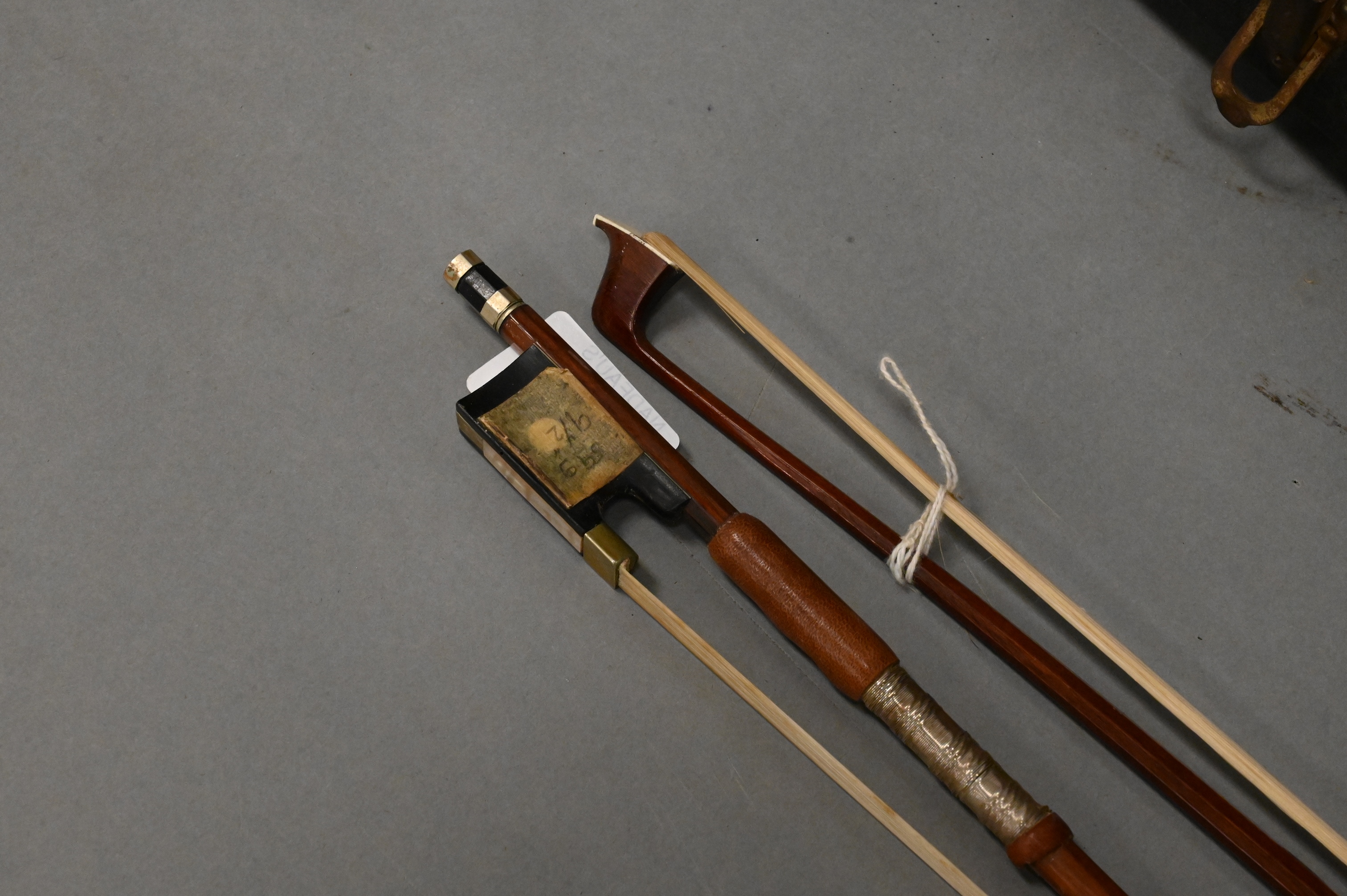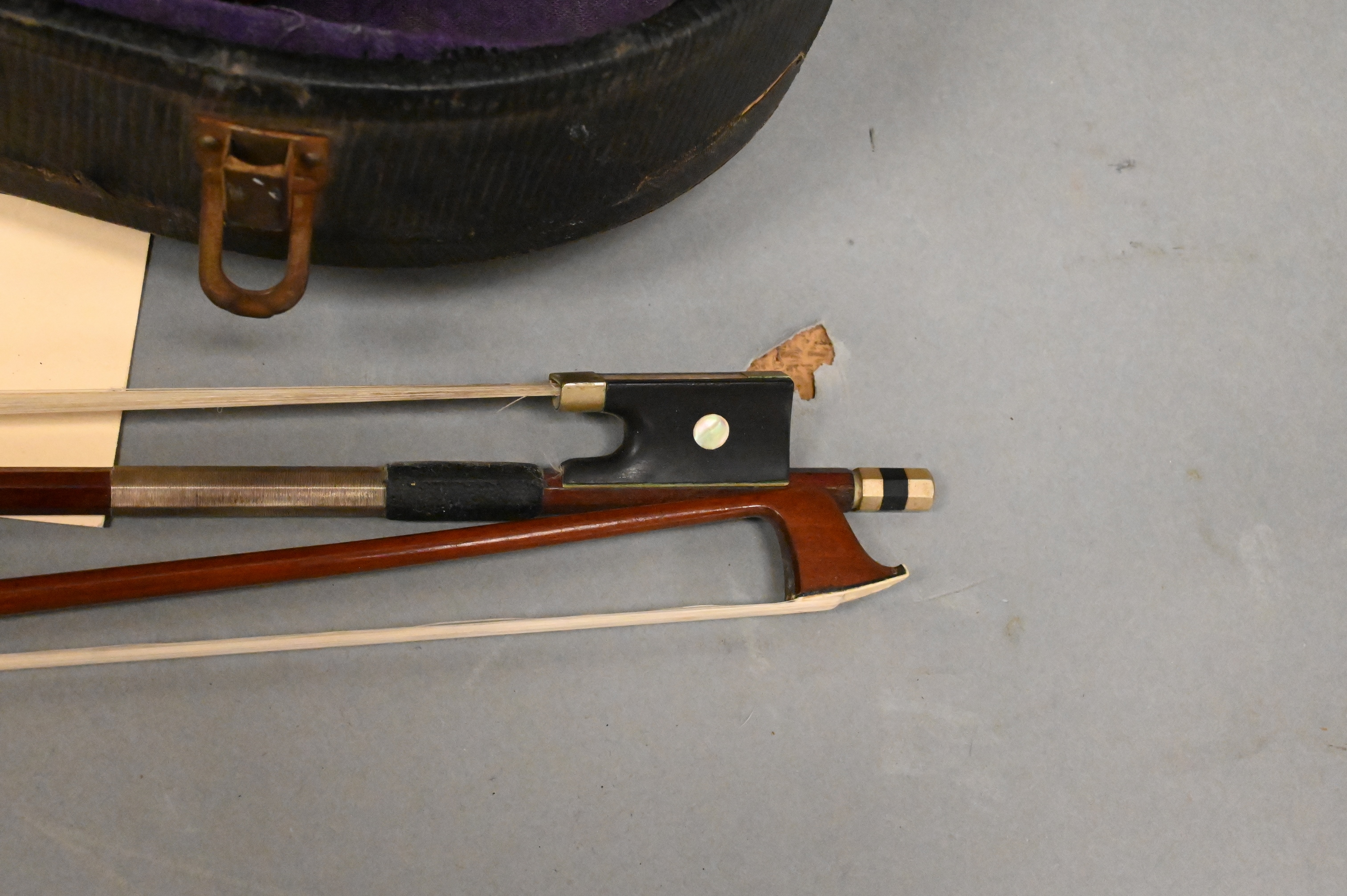 to include two violin bows along with violin, bows marked “Tourte” both with Mother of Pearl inlay and silver wrap