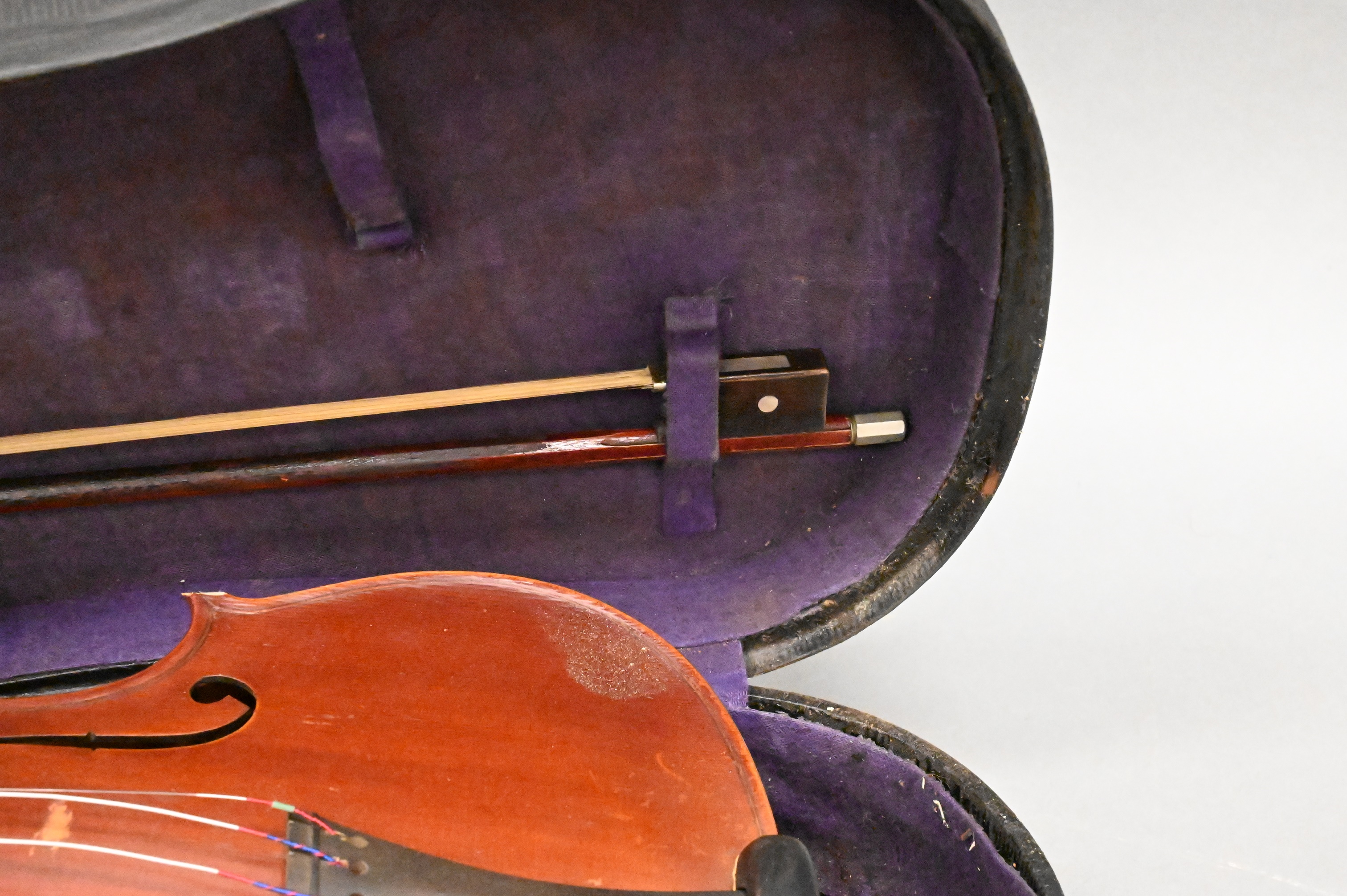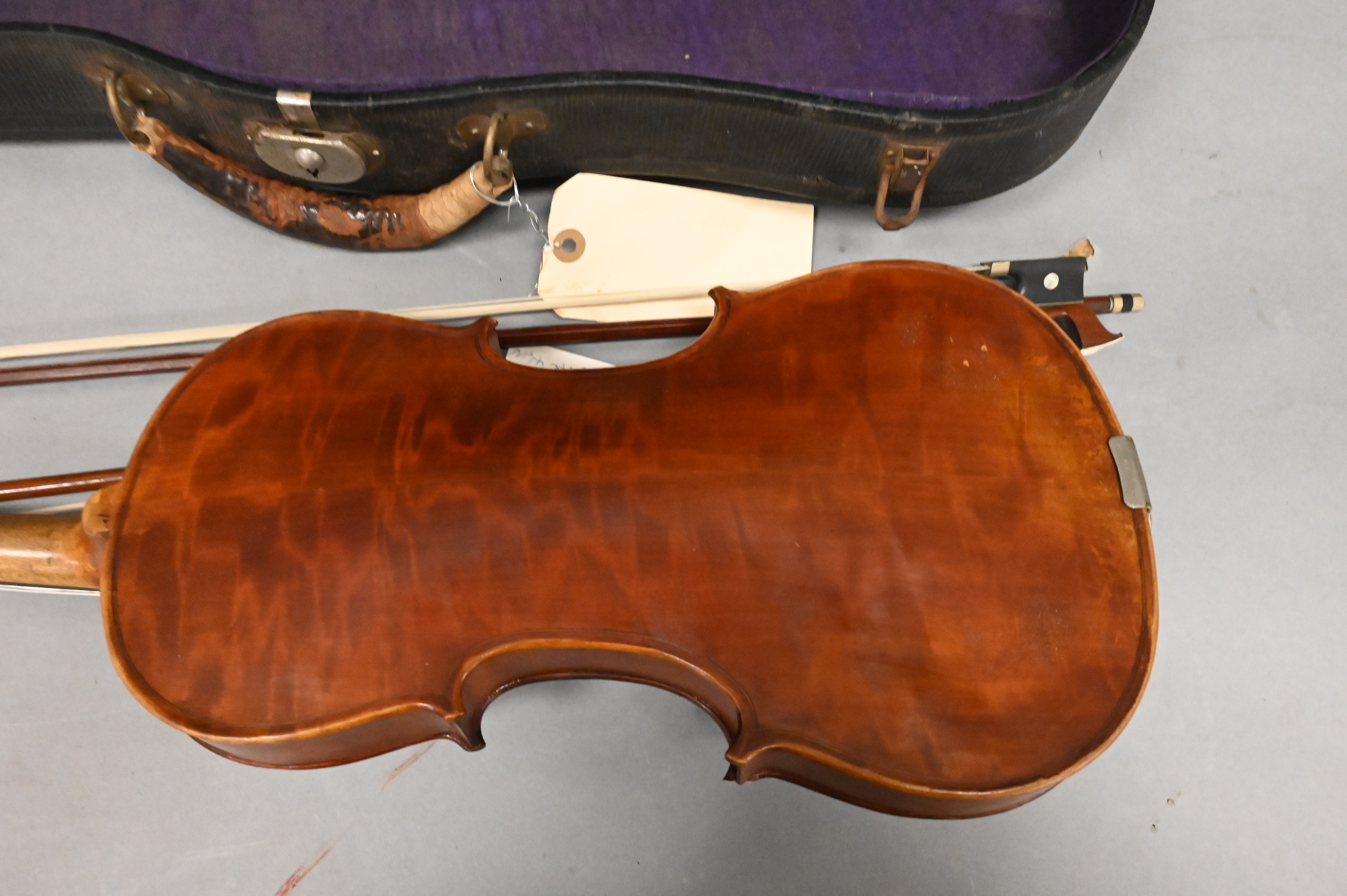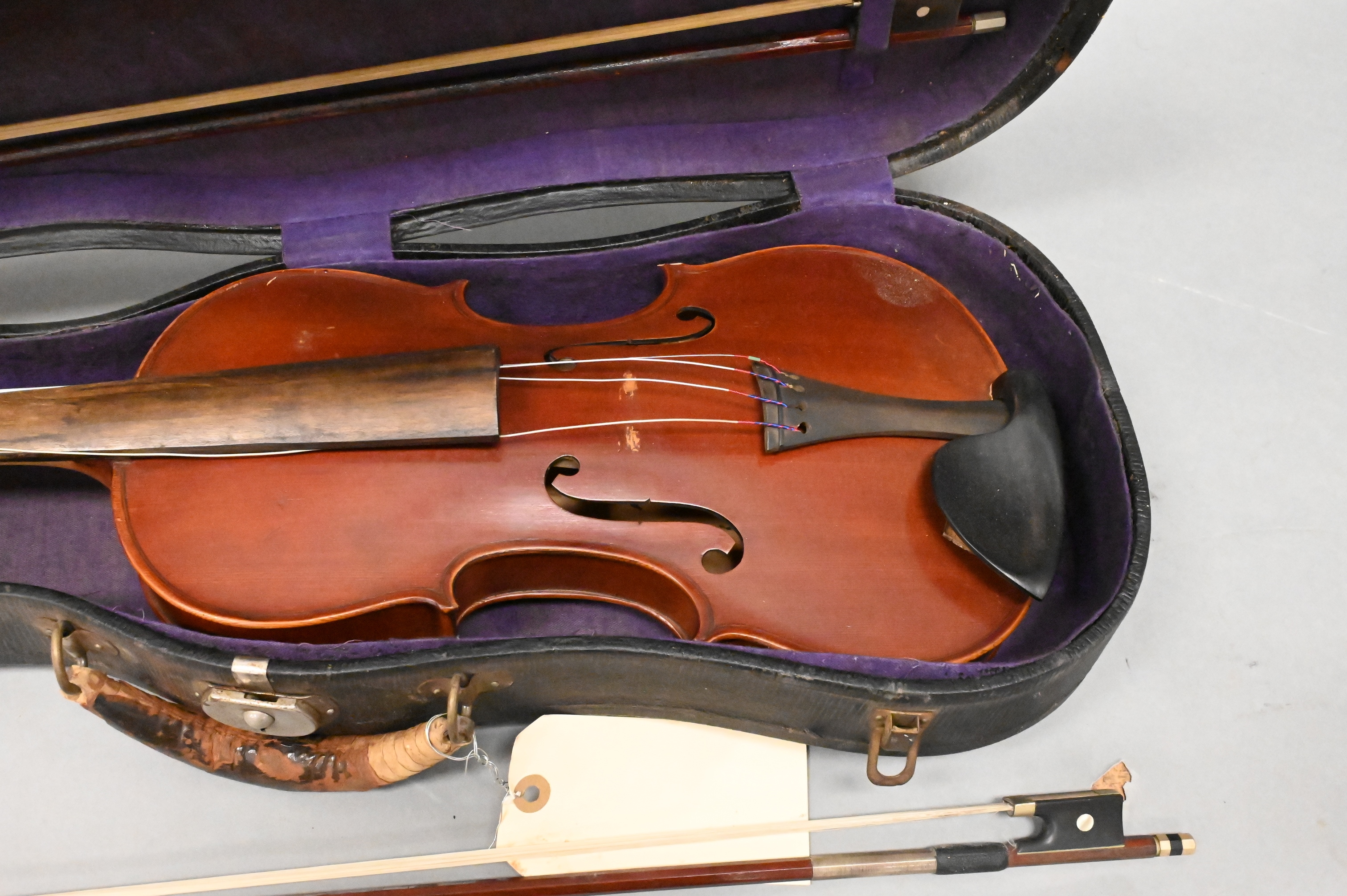 to include two violin bows along with violin, bows marked “Tourte” both with Mother of Pearl inlay and silver wrap