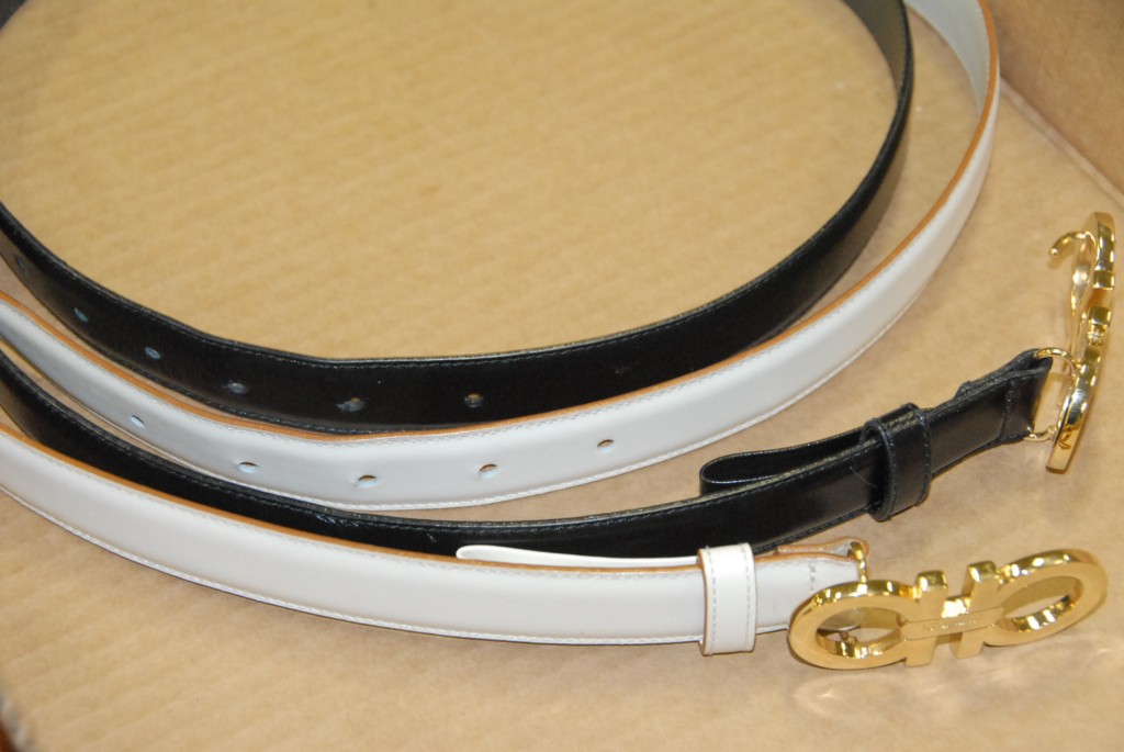 Two Ferragamo leather belts, white and a black.