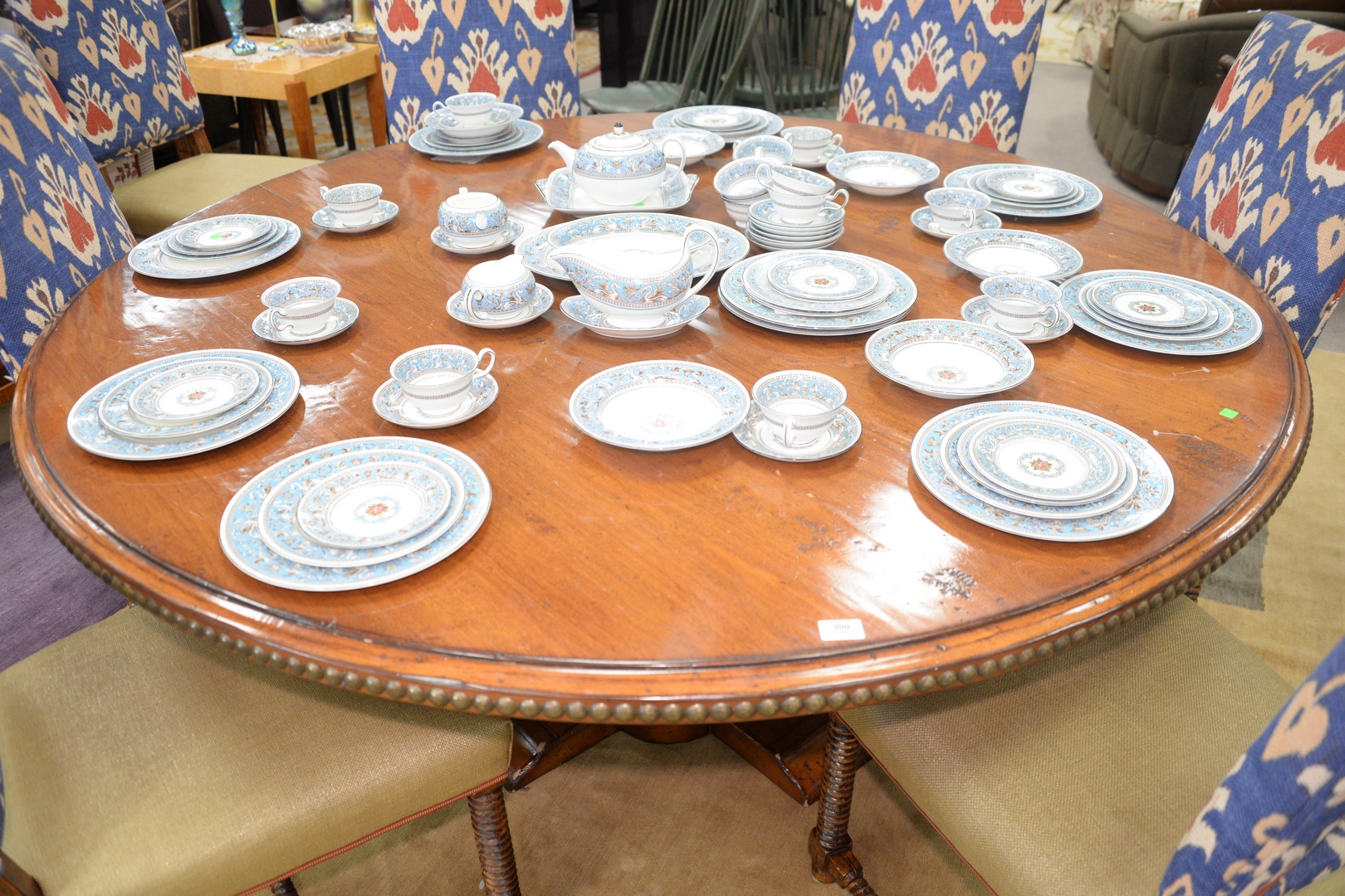 Woodland Round Dining Table, on pedestal base, along with eight upholstered side chairs, top with hand-planed appearance, and brass tack edge, height 30 inches, diameter 72 inches. Provenance: David and Cynthia Kim, 22 Stoney Wylde Lane, Greenwich, Connecticut. View home by visiting: https://www.zillow.com/homedetails/22-Stoney-Wylde-Ln-Greenwich-CT-06830/177238281_zpid/