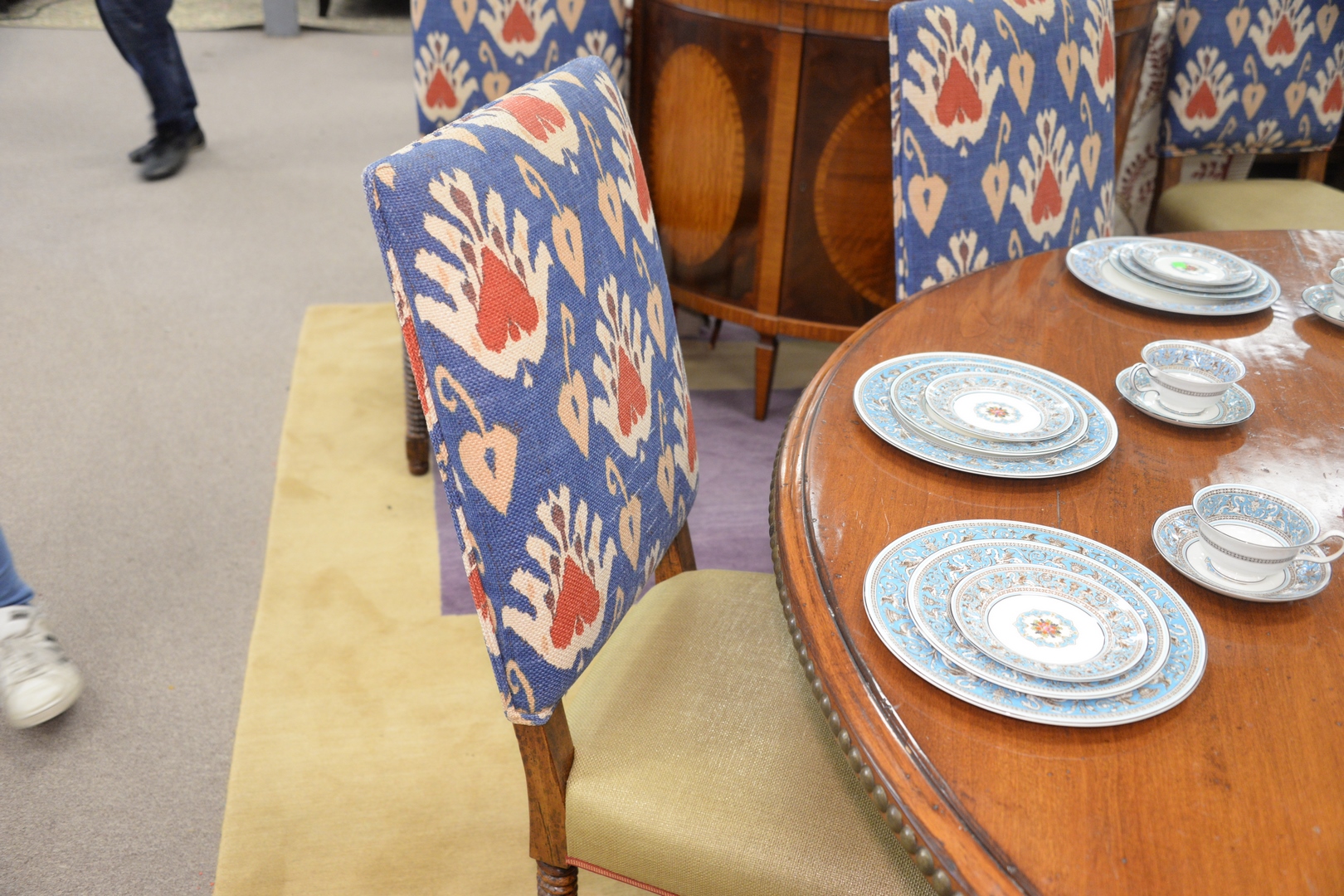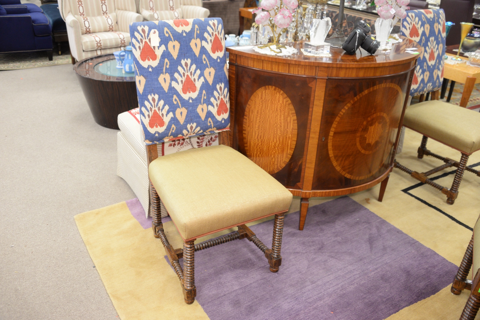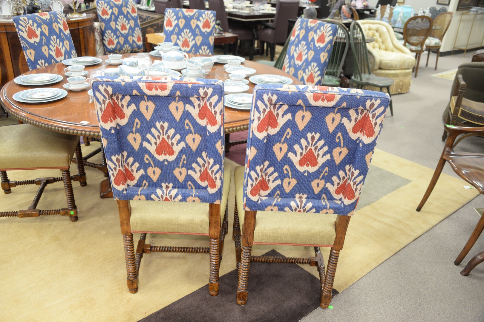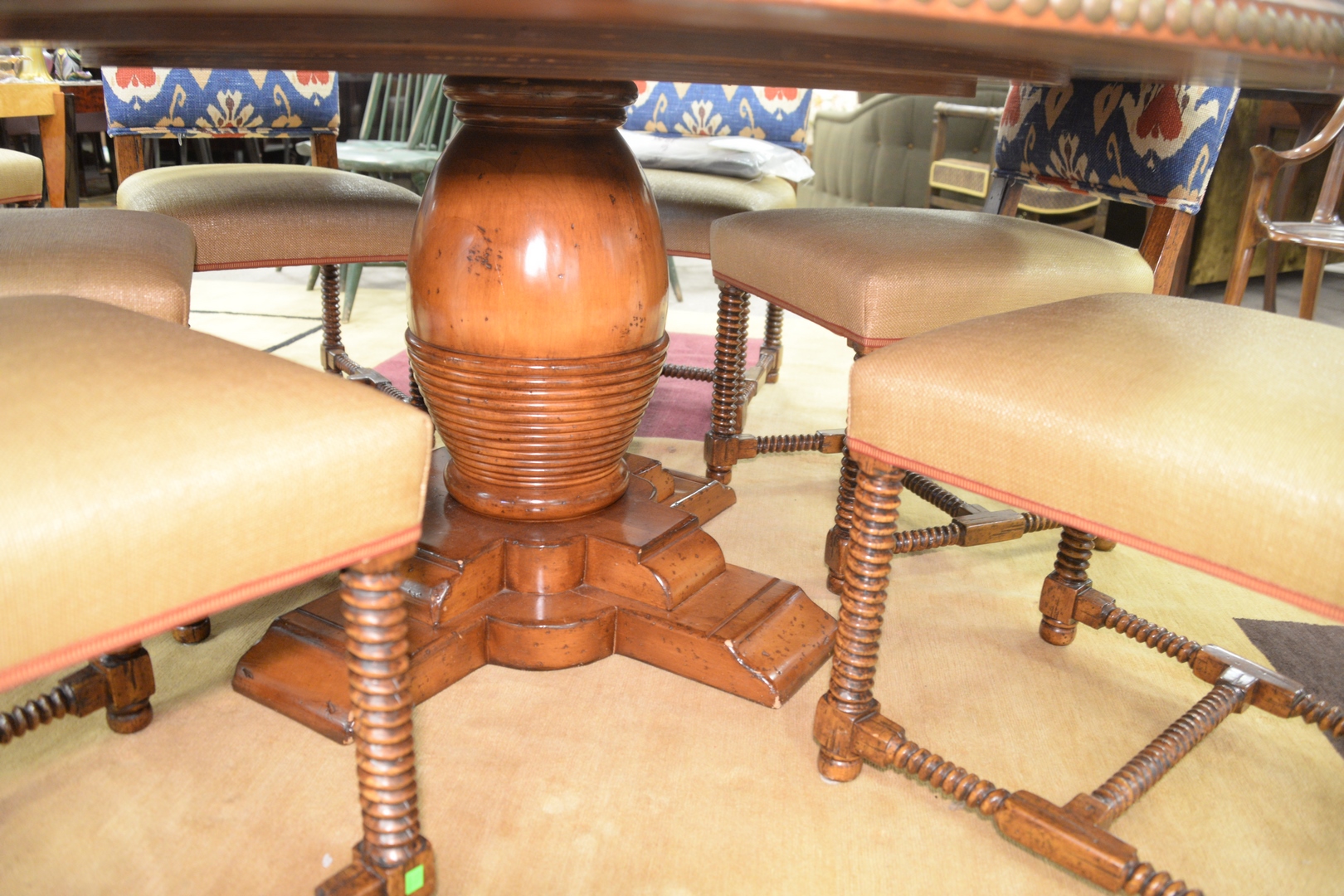 Lot 300: Woodland Round Dining Table, on pedestal base, along with eight upholstered side chairs, top with hand-planed appearance, and brass tack edge, height 30 inches, diameter 72 inches. Provenance: David and Cynthia Kim, 22 Stoney Wylde Lane, Greenwich, Connecticut. View home by visiting: https://www.zillow.com/homedetails/22-Stoney-Wylde-Ln-Greenwich-CT-06830/177238281_zpid/
