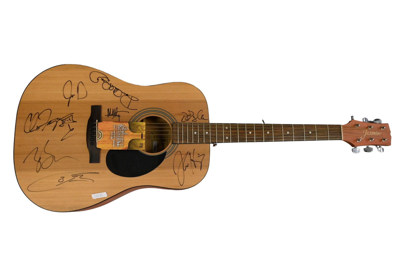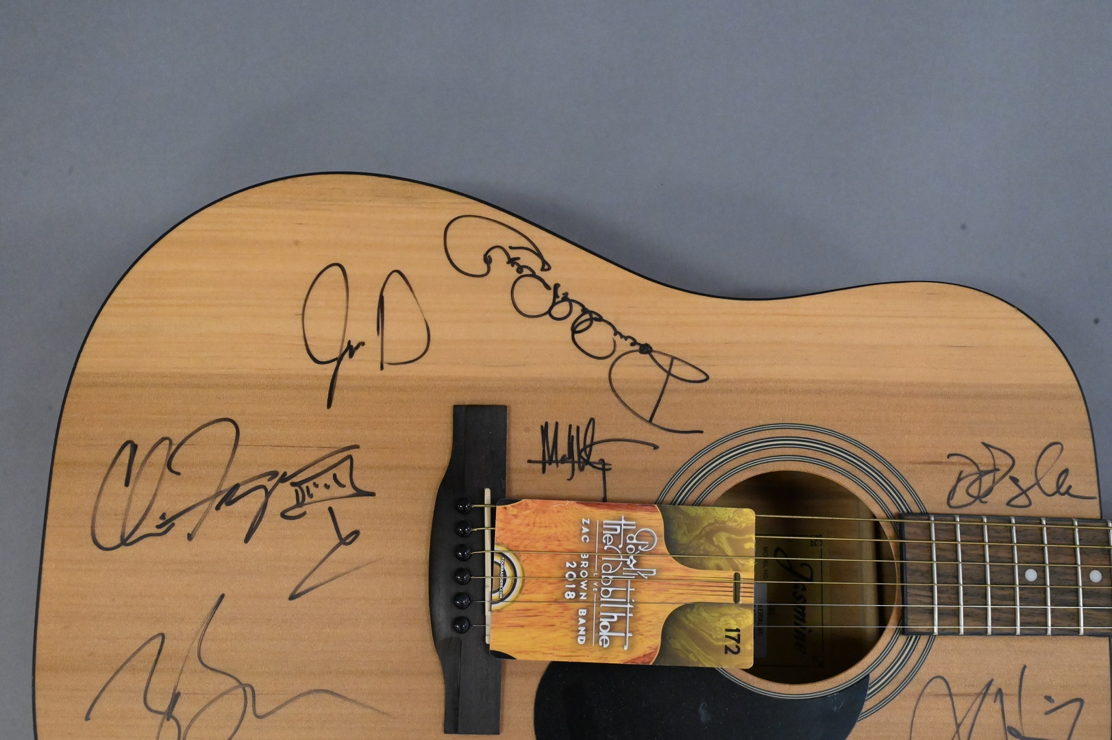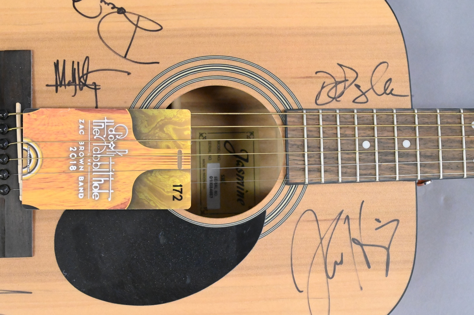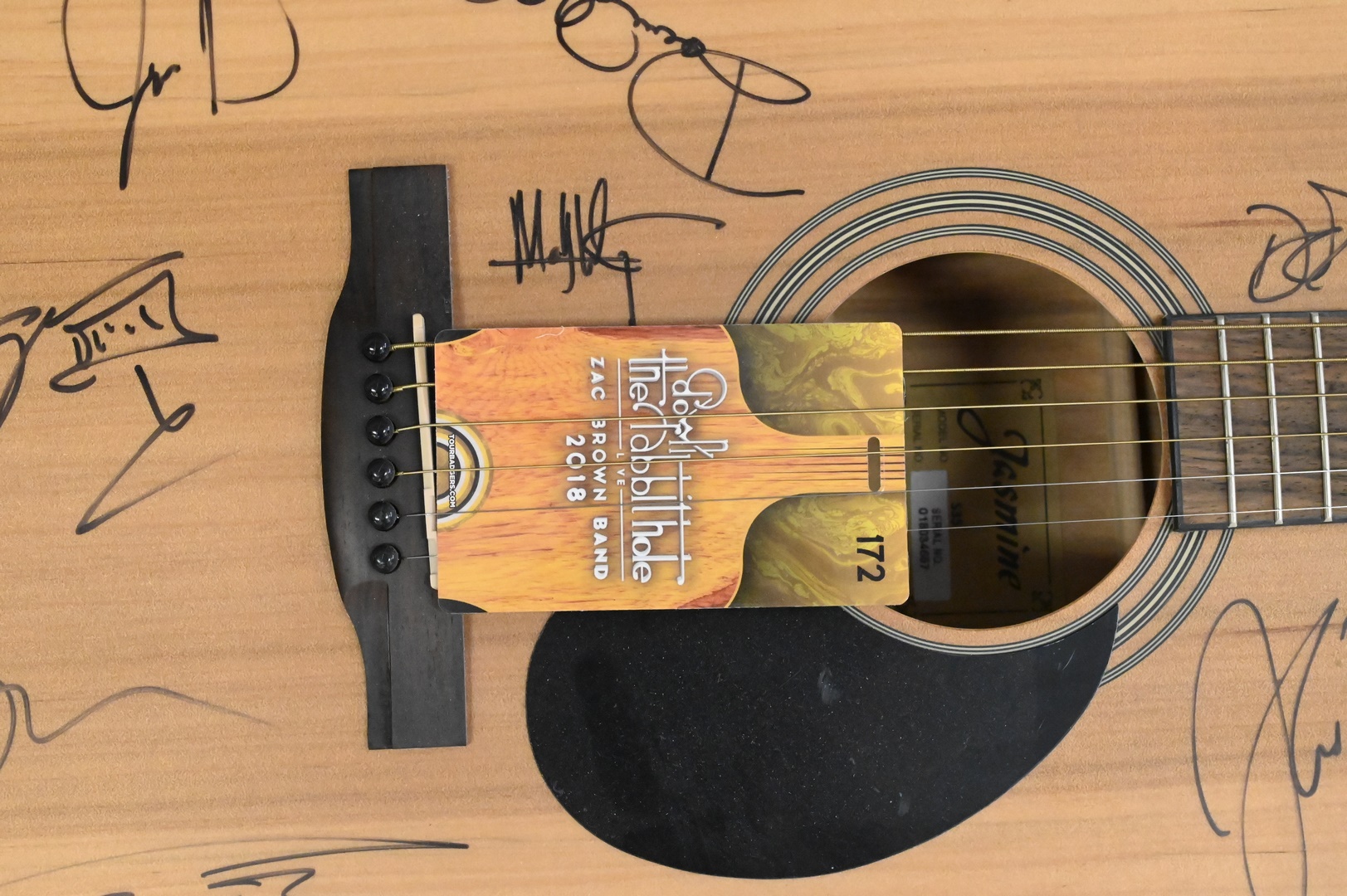 Zac Brown Band Jasmine Acoustic Guitar, 535, signed by Zac Brown Band, 2018, along with backstage pass.
