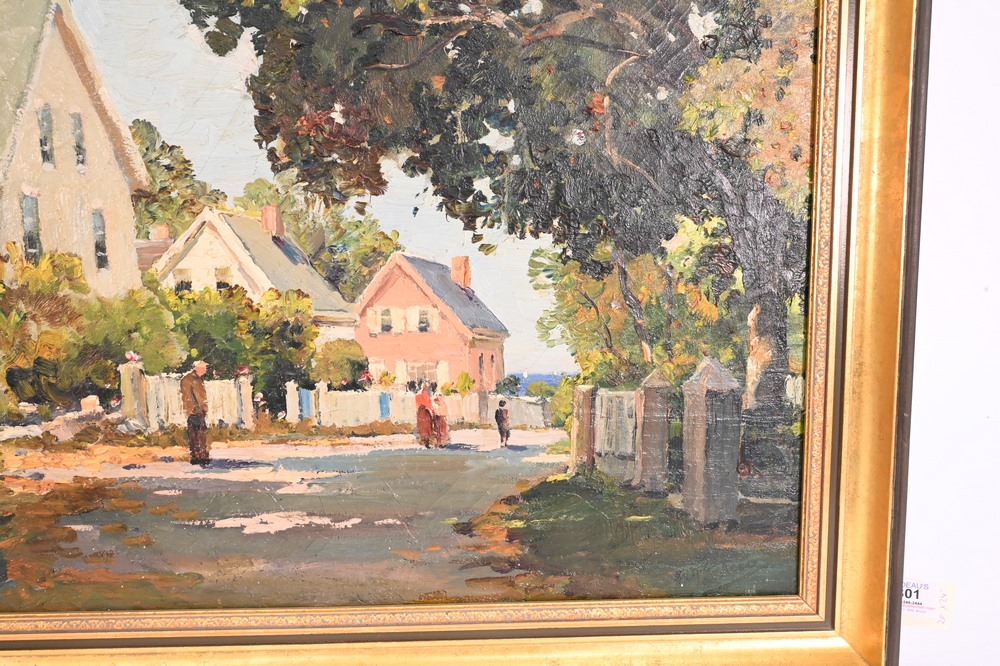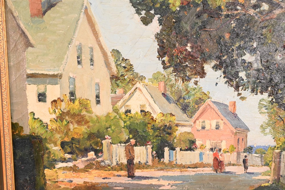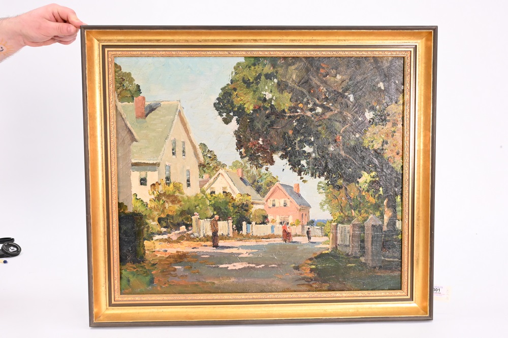Anthony Thieme (American, 1888 – 1954), Rockport street scene, oil on canvas, signed lower right “A. Thieme”, 20″ x 24″. Provenance: J.J. Gillespie Gallery, Pittsburgh, Pennsylvania. Private collection acquired from the above.; Private Connecticut collection inherited form the above, circa 2000. Condition: Canvas: good, original, minor crazing in foreground and left sky area consistent with ageing; original frame in good condition.