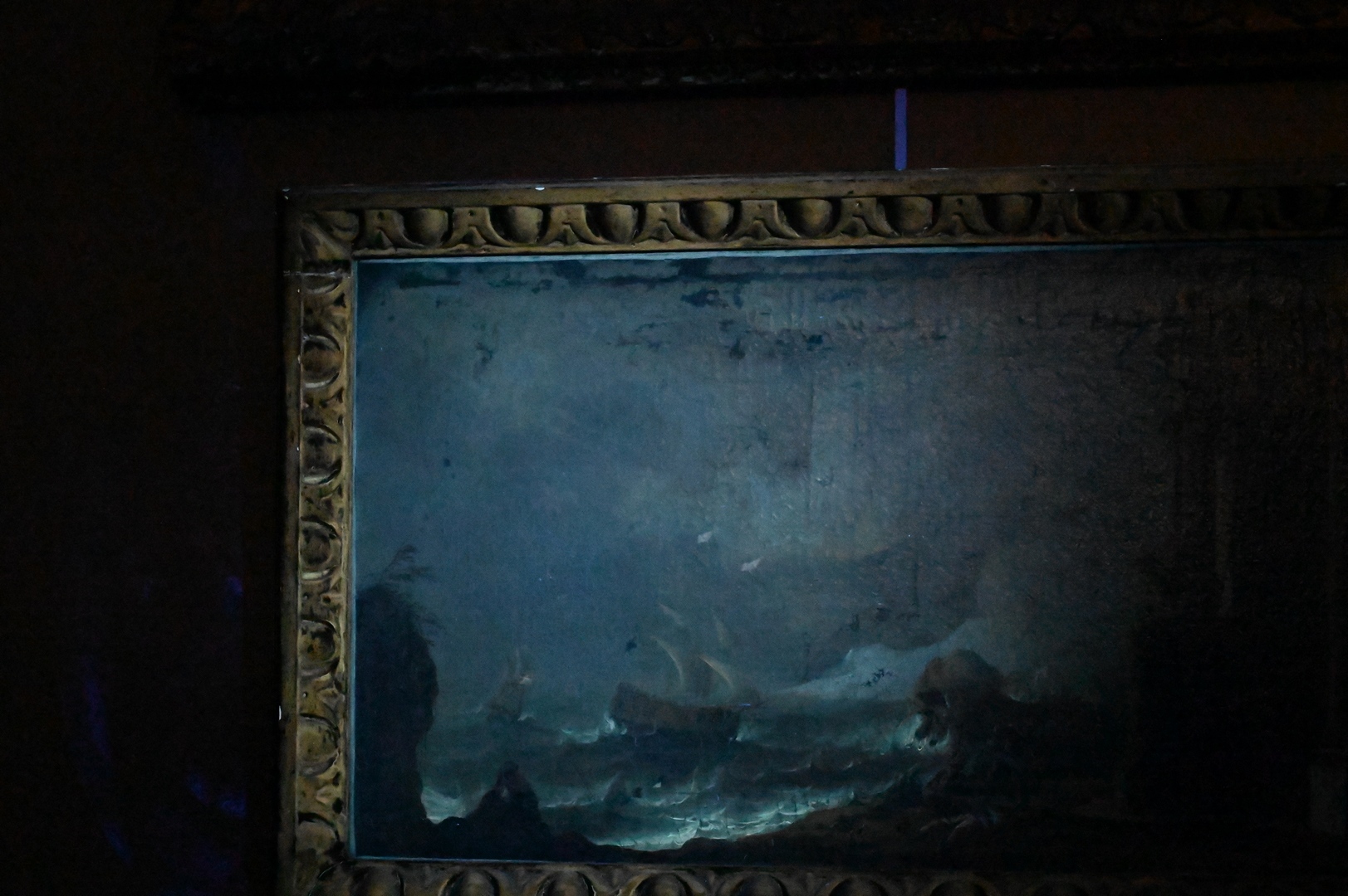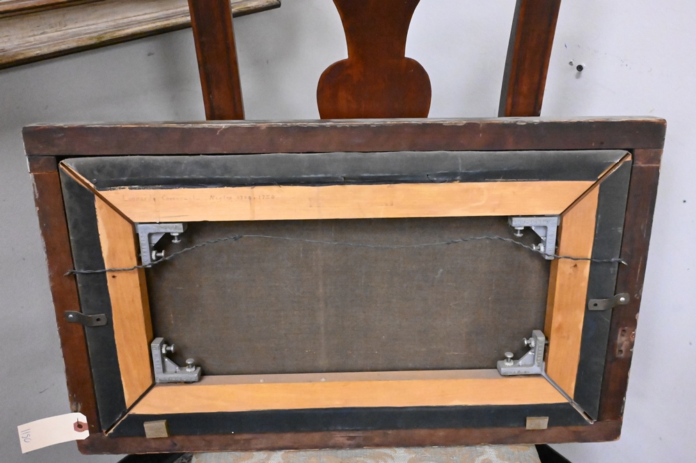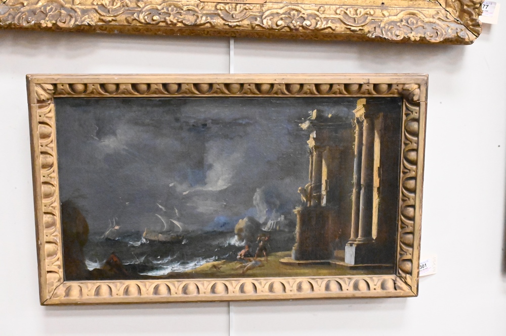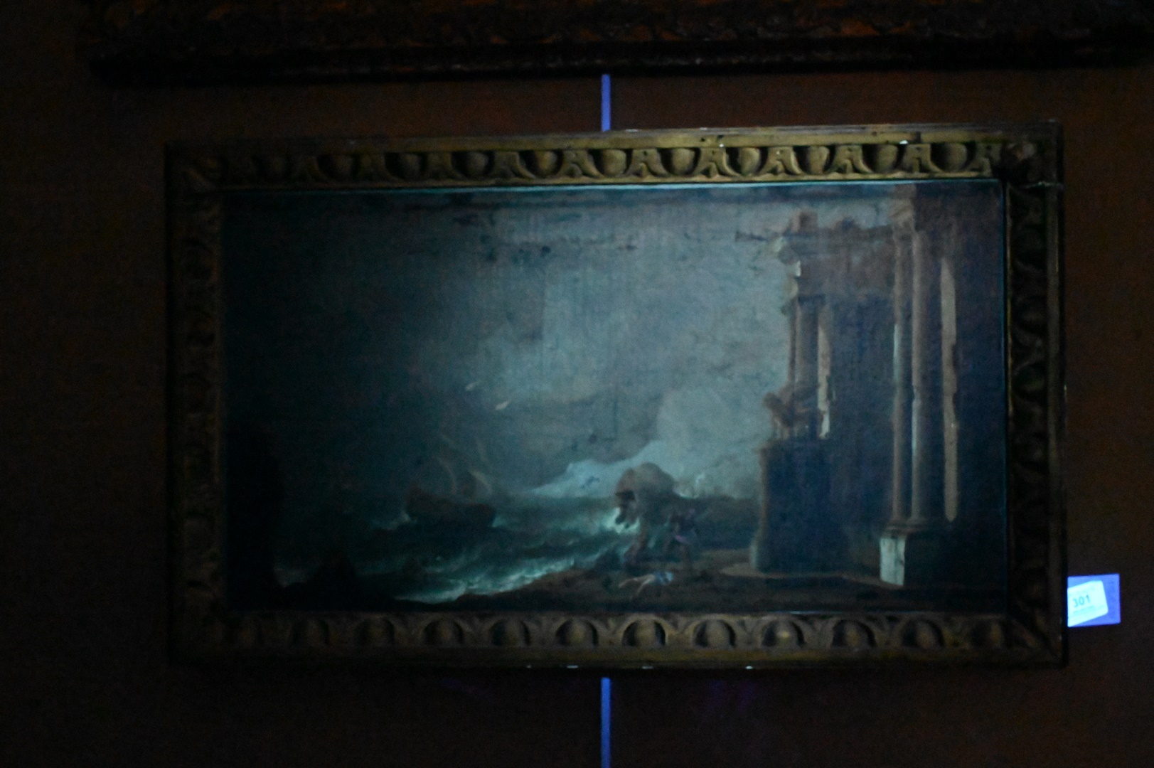 Lot 301: Attributed To Leonardo Coccorante (Italian, 1680 – 1750), oil on canvas, ships in distress under a stormy, night sky with an ancient, columned building in right foreground, 12 1/2″ x 22 3/4″. Provenance: Purchased by Charles Buckley, Mount Vernon, New Hampshire, July 5, 1976, no receipt available. Estate of Wallace Bradway, New Haven, CT.