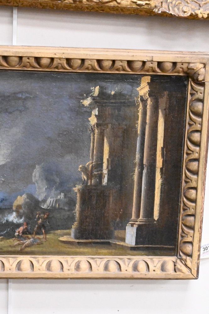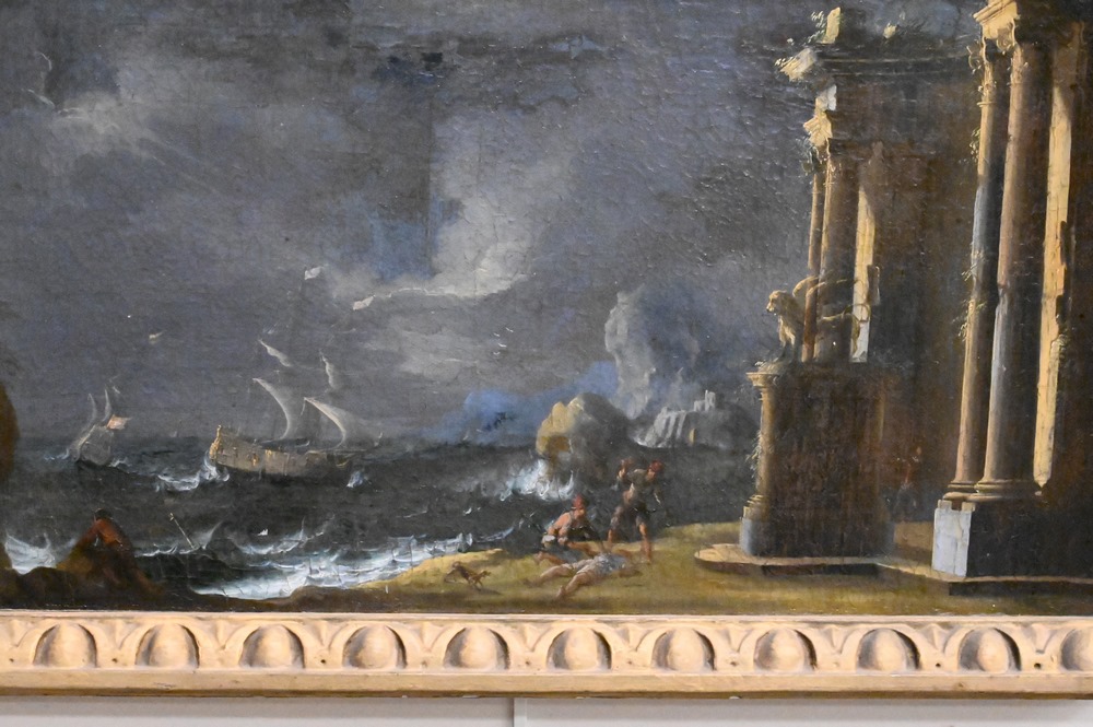 Attributed To Leonardo Coccorante (Italian, 1680 – 1750), oil on canvas, ships in distress under a stormy, night sky with an ancient, columned building in right foreground, 12 1/2″ x 22 3/4″. Provenance: Purchased by Charles Buckley, Mount Vernon, New Hampshire, July 5, 1976, no receipt available. Estate of Wallace Bradway, New Haven, CT.