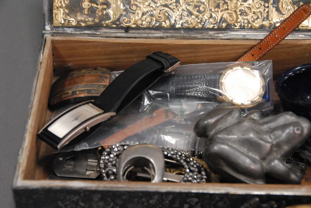 Box lot of costume jewelry with silver and frog figure.