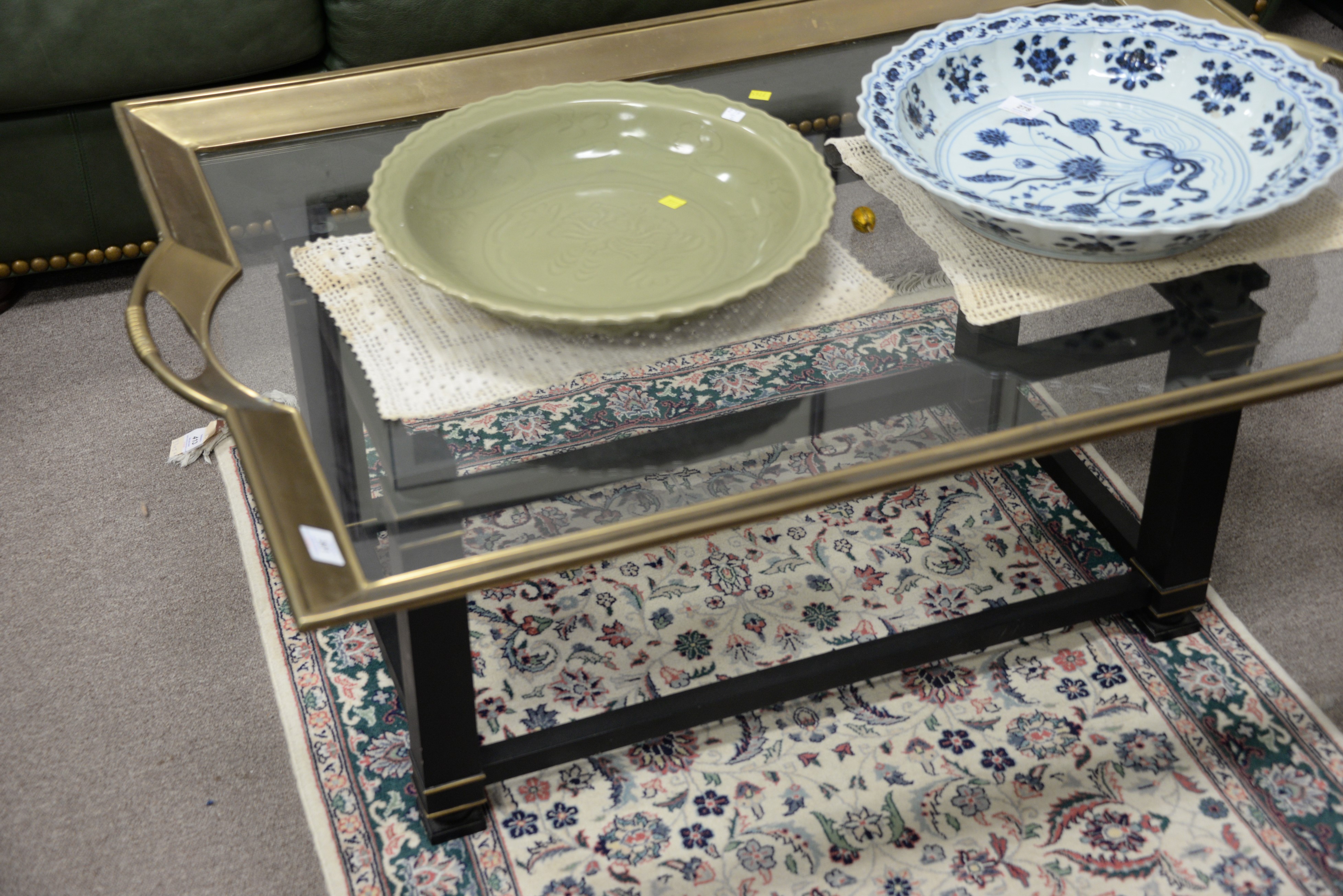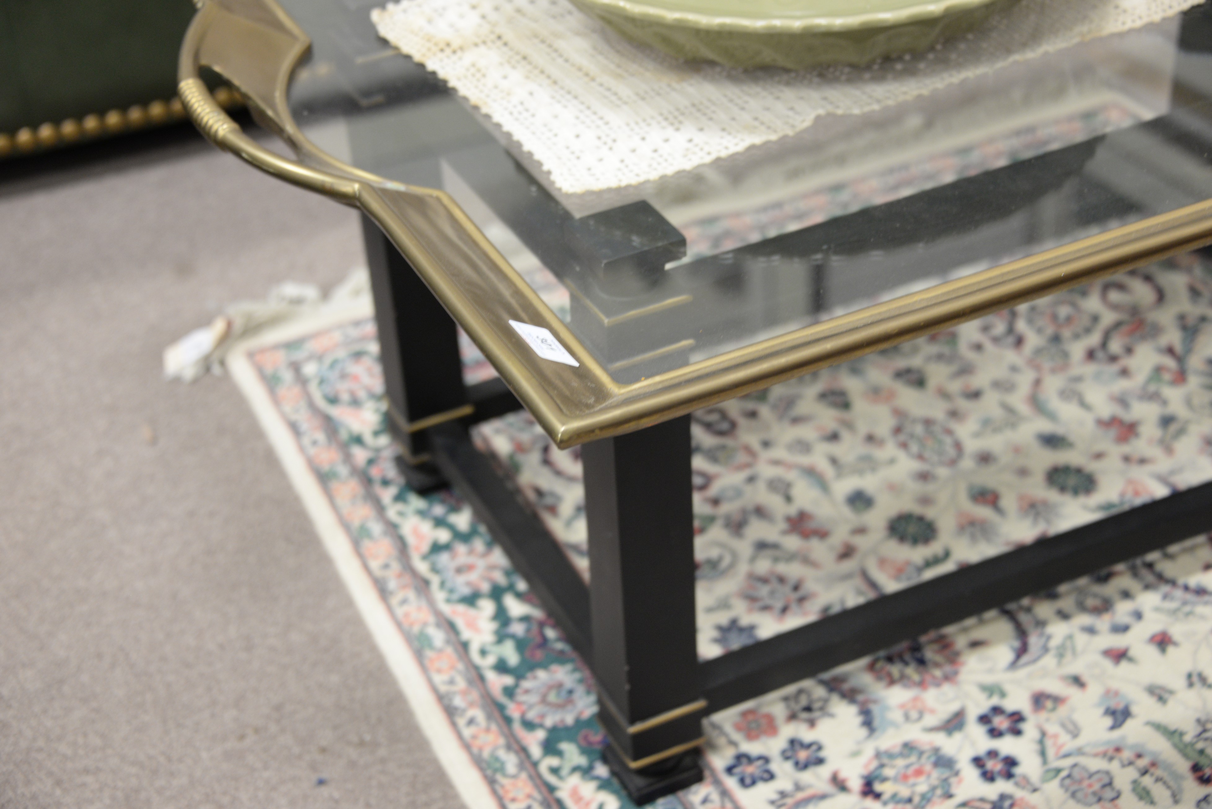 Lot 301: Brass trimmed tray top coffee table. ht. 18 in. wd. 47 1/2 in. dp. 31 1/2 in.