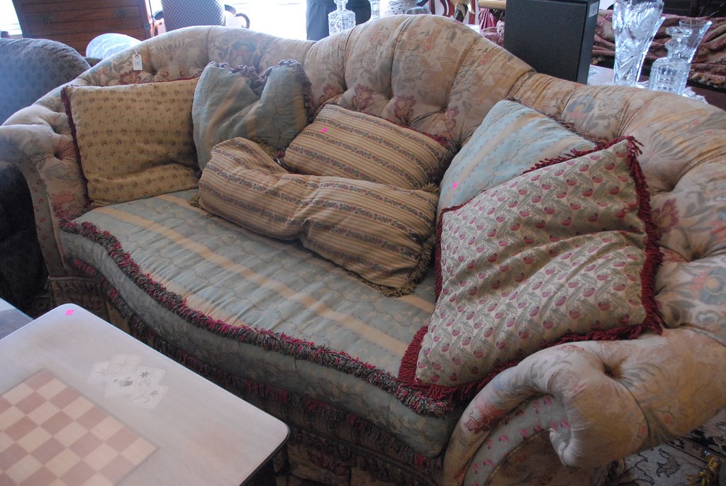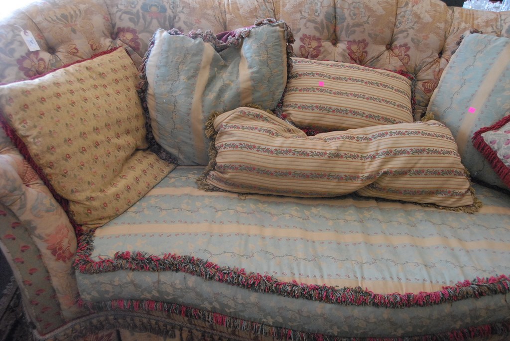 Lot 301: Carol Hicks Bolton and E.J. Victor decorative upholstered sofa and seven pillows, lg. 101in.