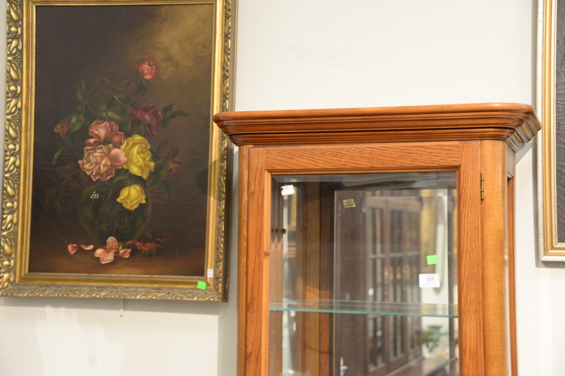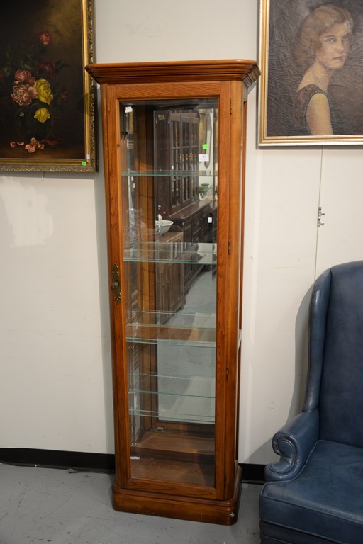 Contemporary oak curio cabinet with glass shelves. ht. 76 in. wd. 22 in. dp. 13 in.