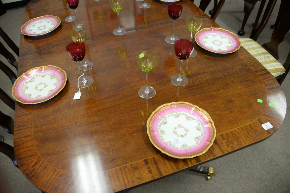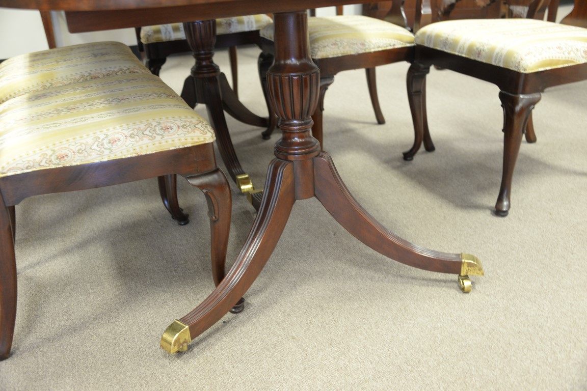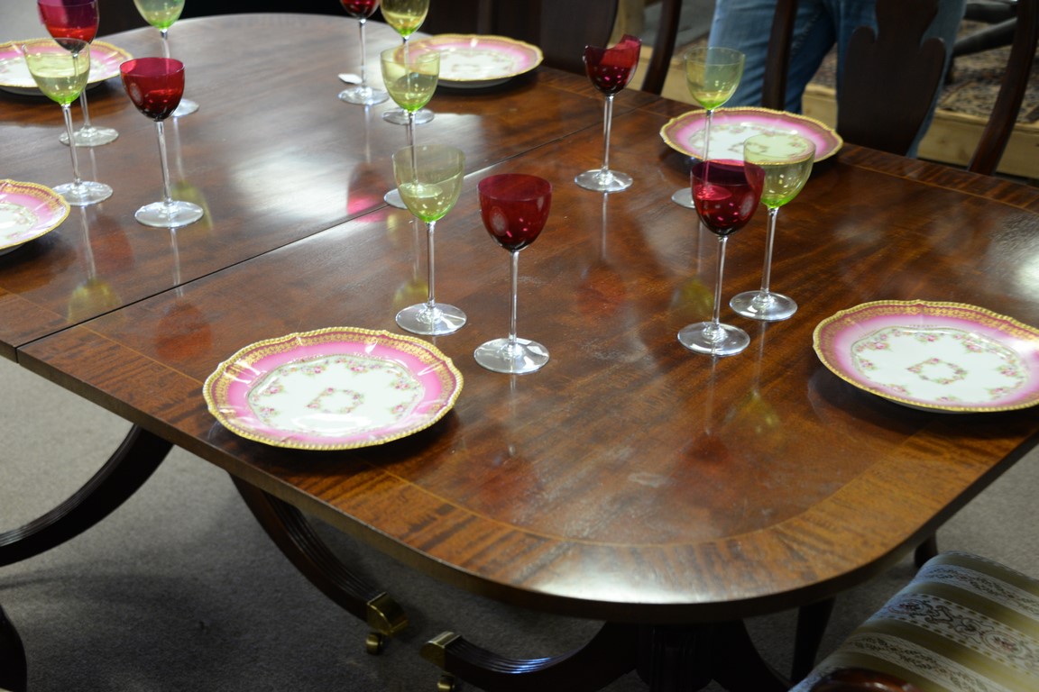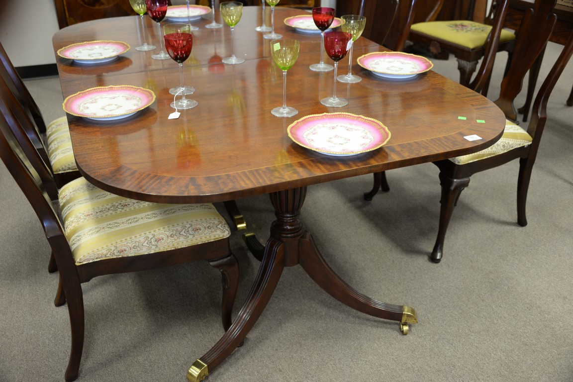 Lot 301: Custom mahogany dining table with banded inlaid top on double pedestal base having three 20 leaves. ht. 29 1/2in., top closed: 45 …