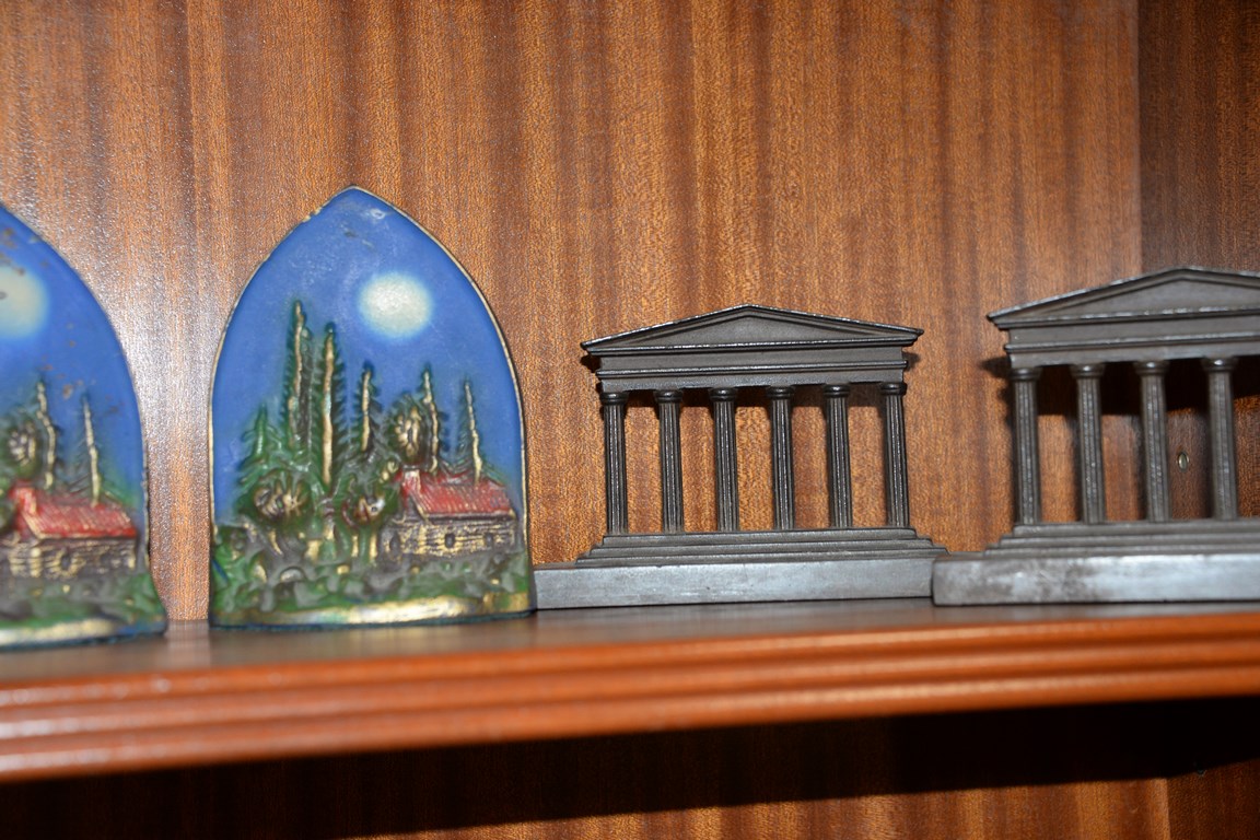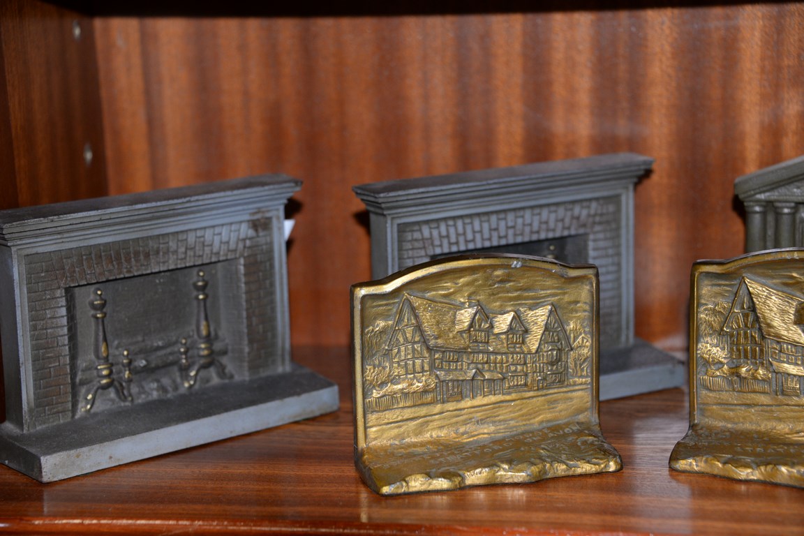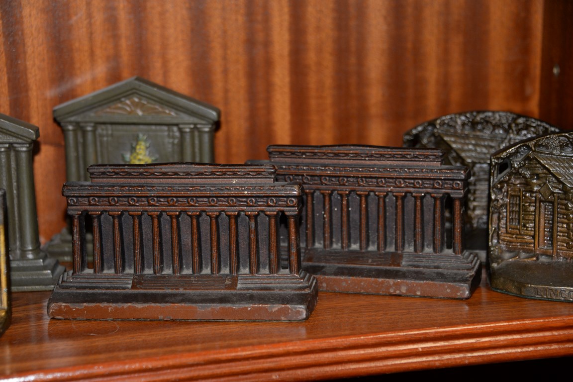 Eight pairs of bookends including two pairs of column bookends, pair of Lincoln Memorial bookends, pair of painted solid column bookends, pair Bradley & Hubbard painted hearth fireplace mantle bookends, Pair of Judd Lincoln cabin bookends, pair of Shakespeare’s house bookends, and pair of moonlit cabin bookends. ht. 3 in. to 6 in.