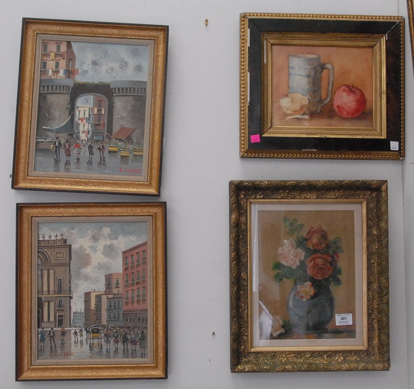 Lot 301: Five piece lot still of flowers, still life of fruit with mug, and two paintings of street scenes signed Ciappa.