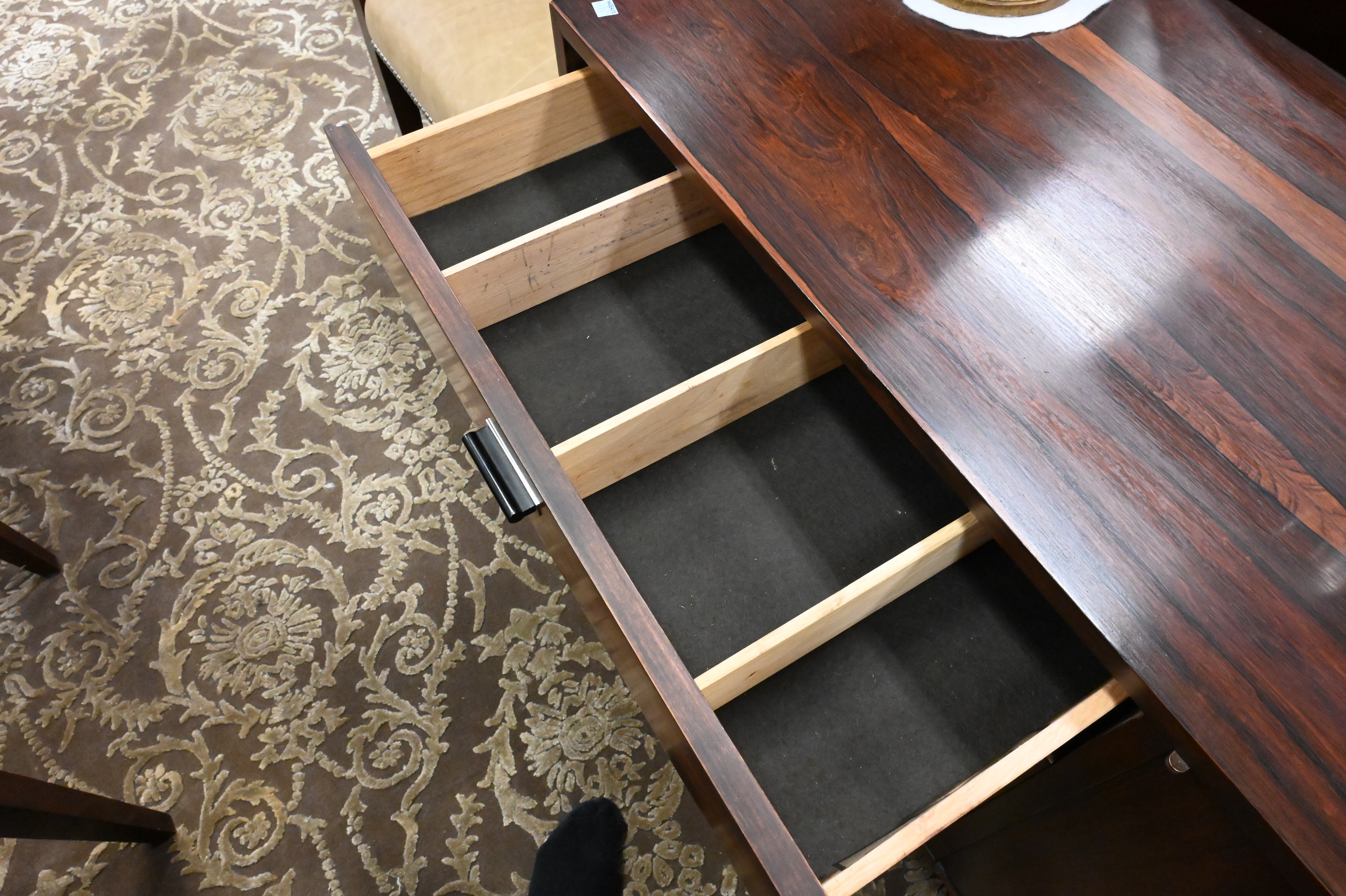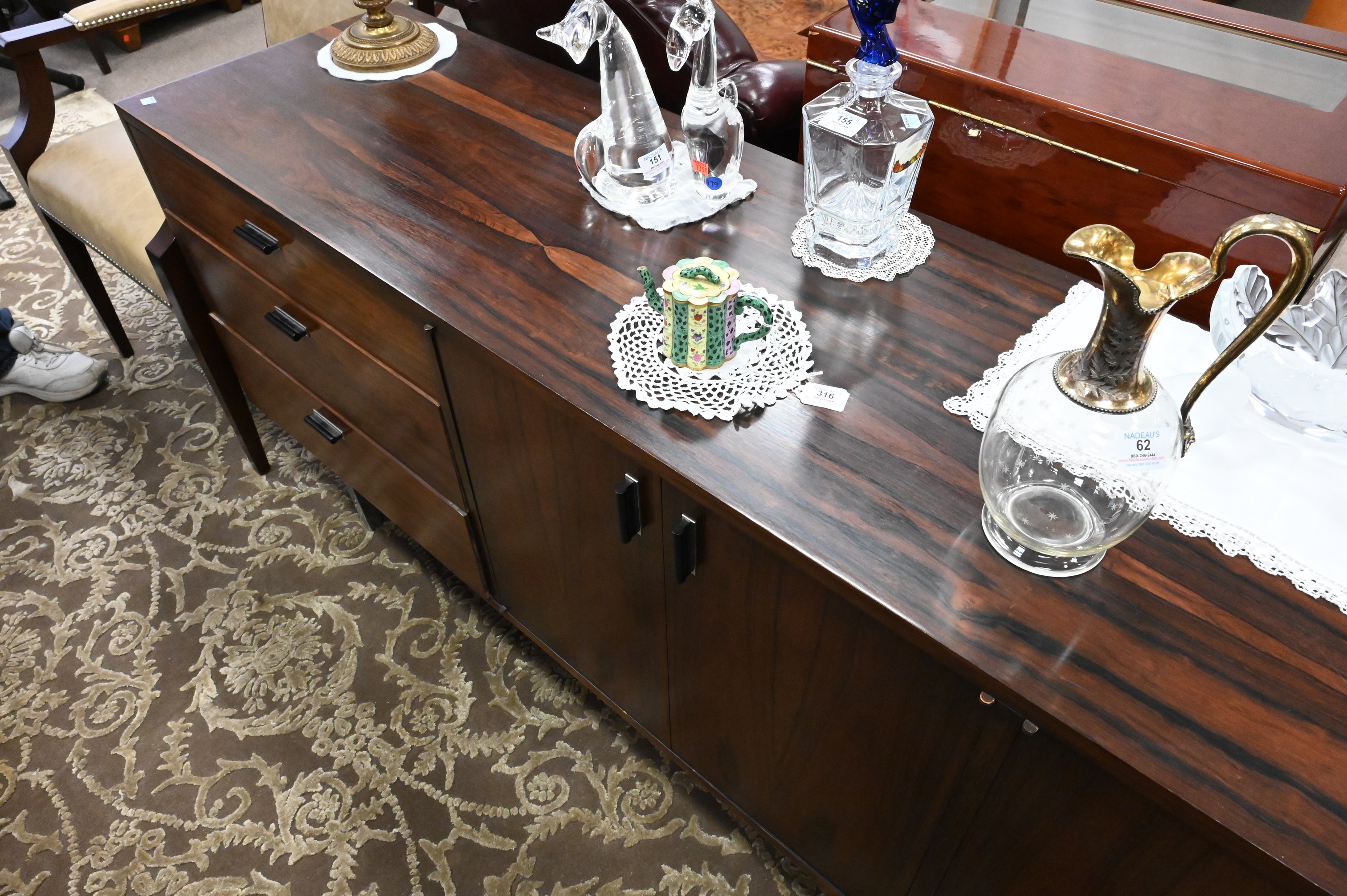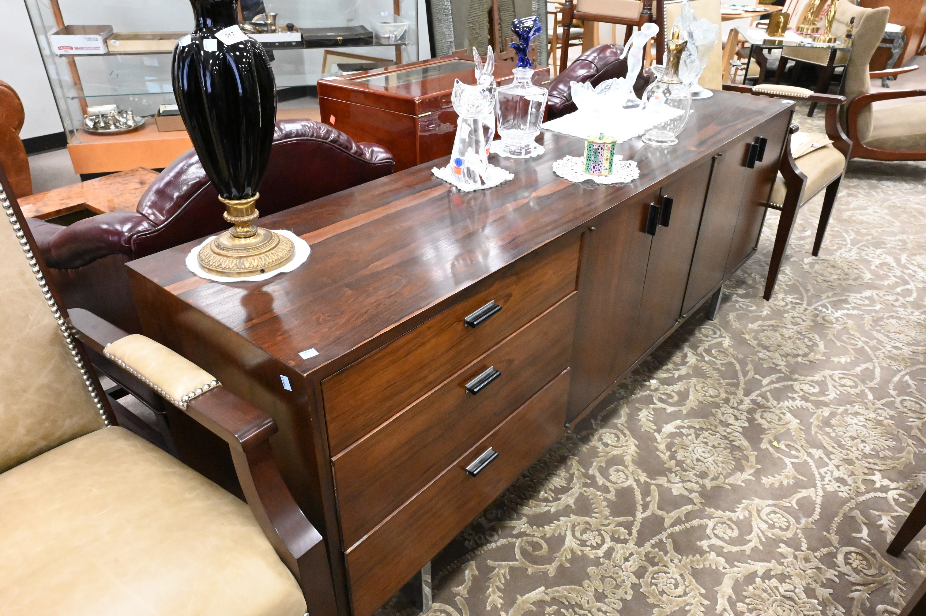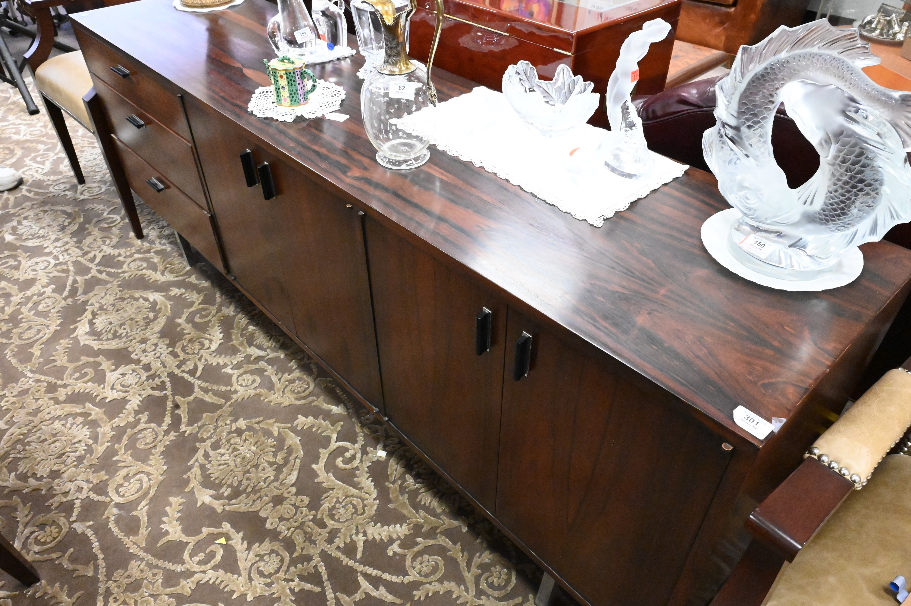 Founders Rosewood Credenza, Jack Cartwright design, having four drawers and three drawers set on chrome legs, height 28 1/2 inches, top 18″ x 77 1/2″.