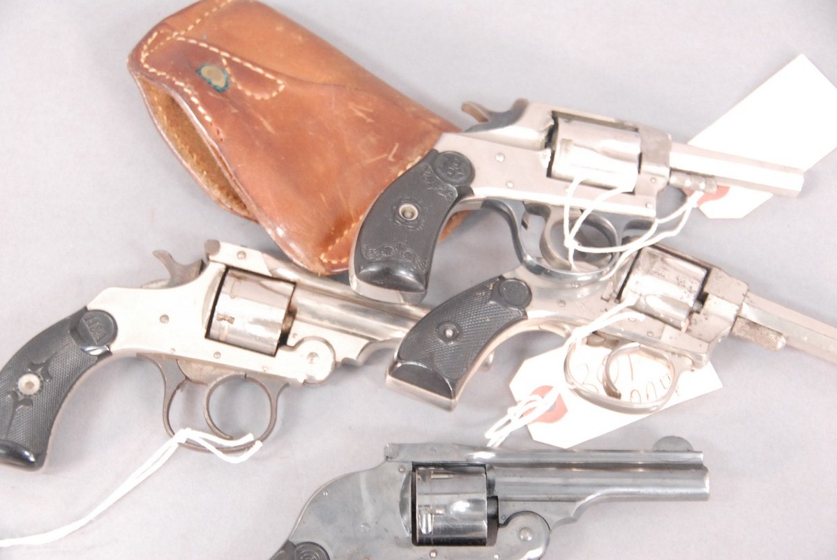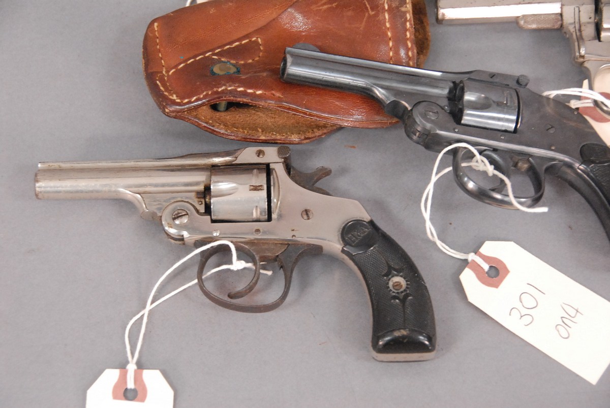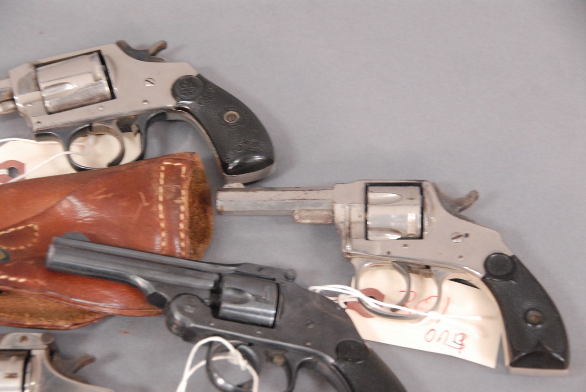 Four revolvers: 1 Hopkins & Allen Arms Forehand model 1901, revolver, .38 caliber, five shot nickel finish. 279 SN-780, 2 Hopkins & Allen Arms XL8, revolver, .32 caliber, nickel finish. 280, 3 H & A double action model 1900 revolver, .38 caliber nickel finish. 281 SN-None, and 4 Harrington Richardson & Arms, revolver .32 caliber S & W c.t.g.e. 282 SN-251486