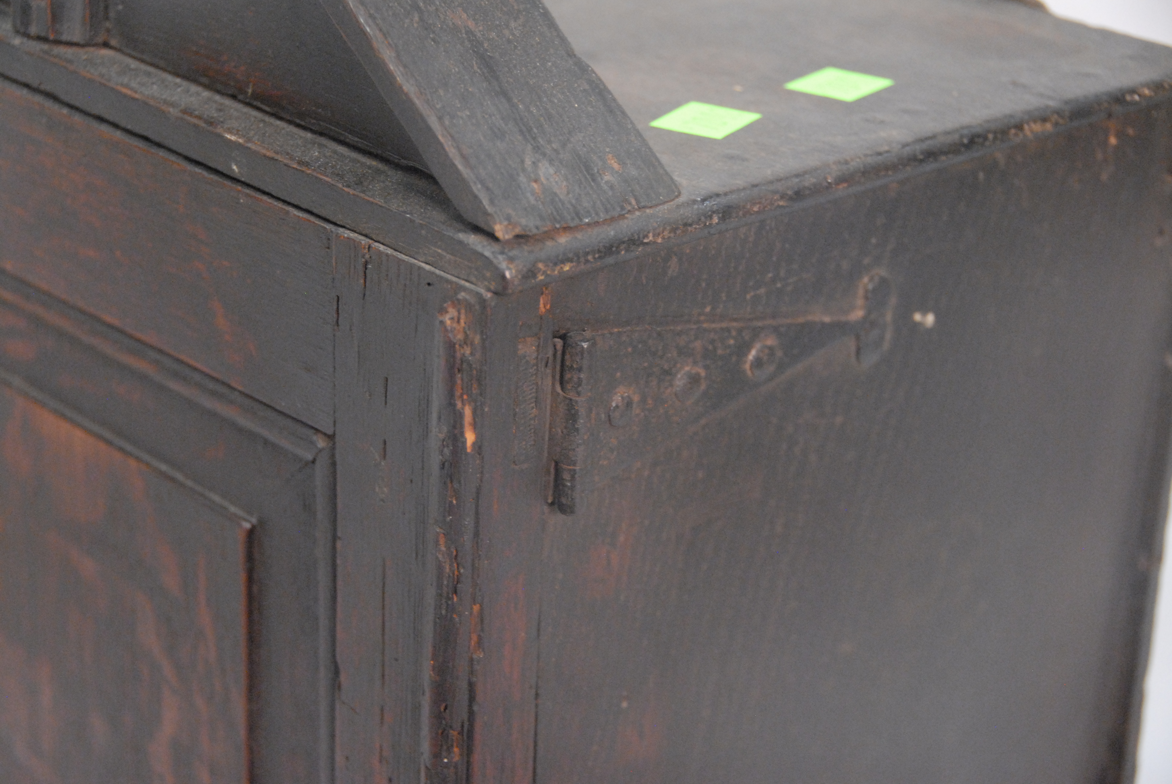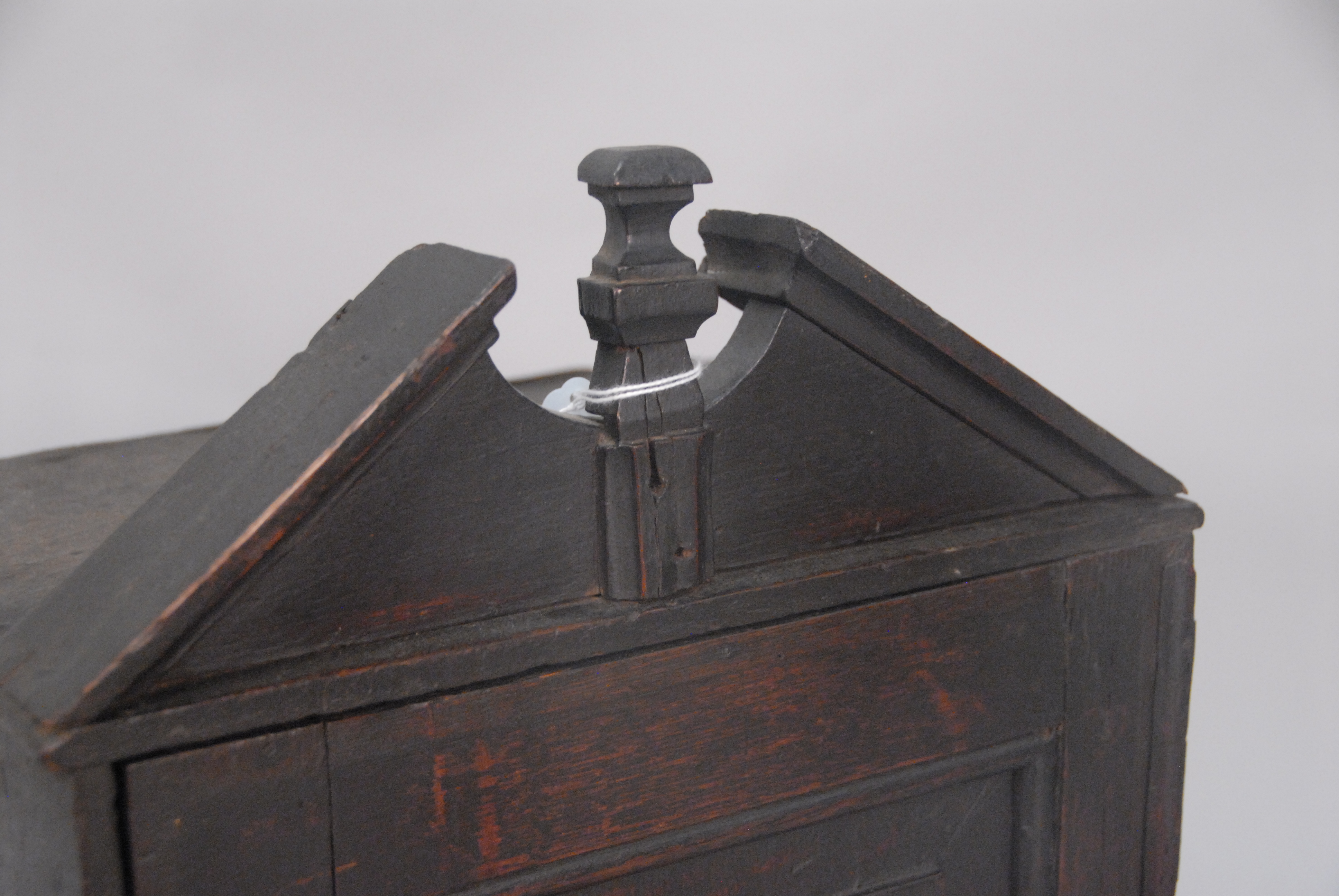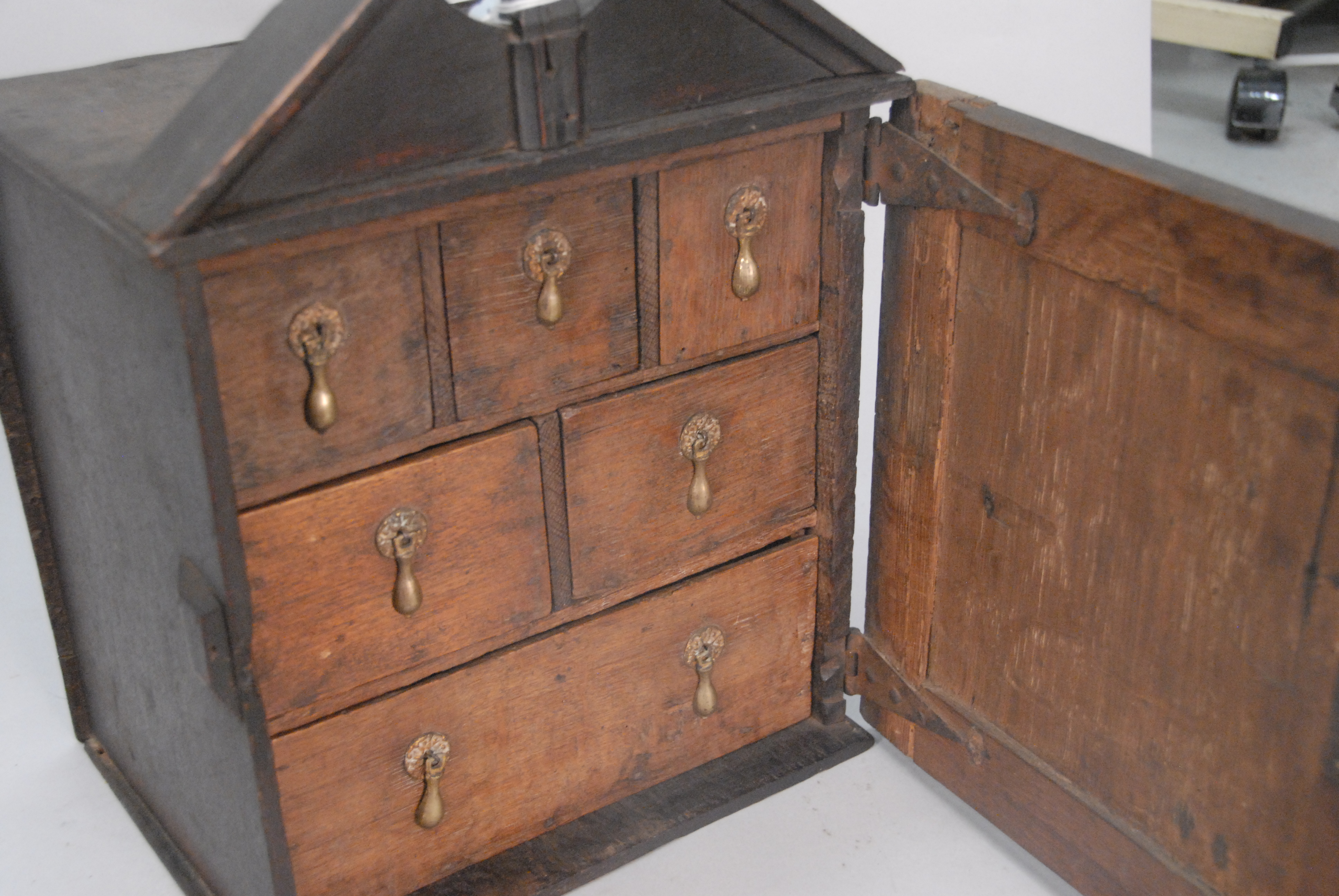 Lot 301: George II oak spice cabinet having one door opening to reveal six drawers with early brass pulls. ht. 17in., wd. 11 3/4in.