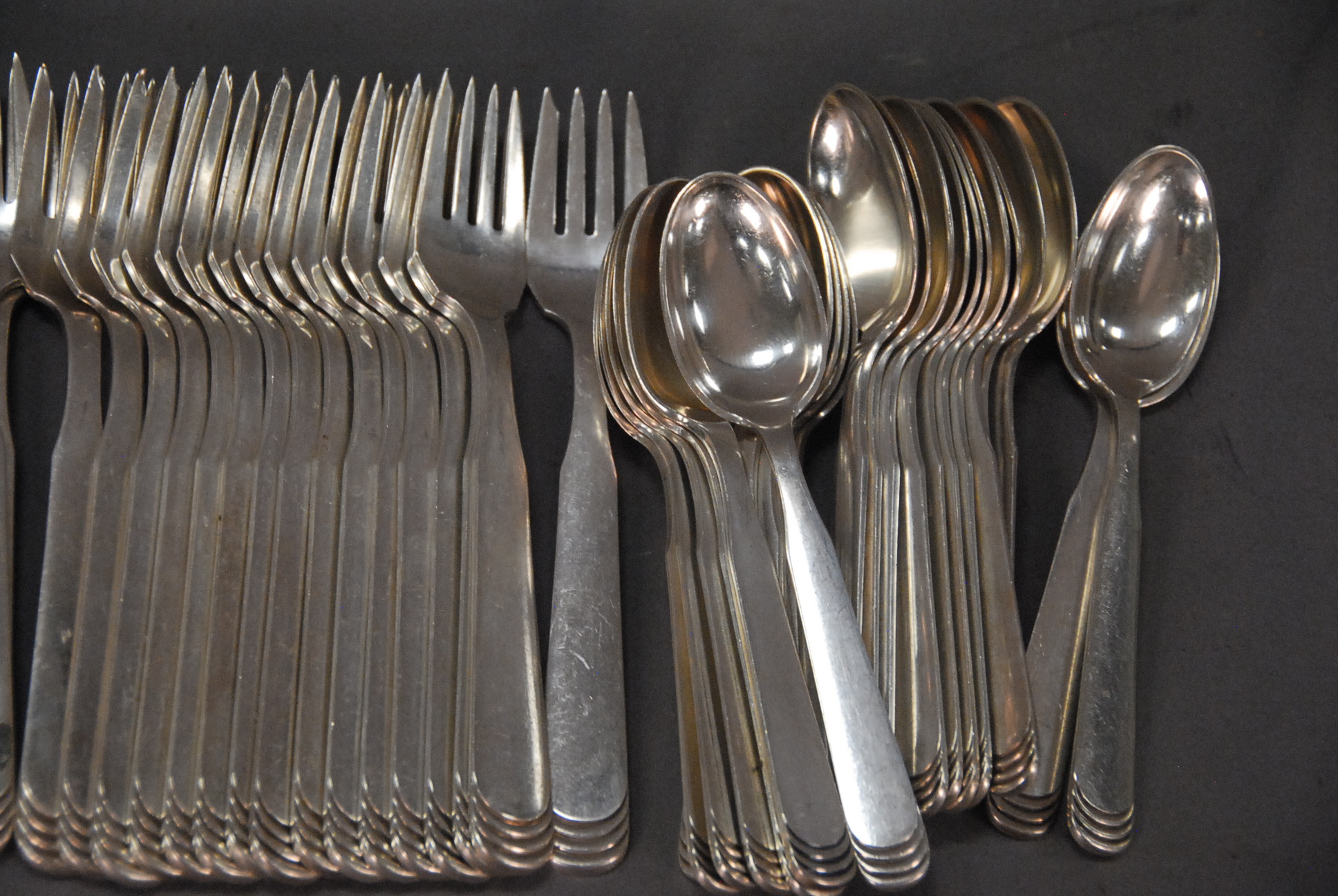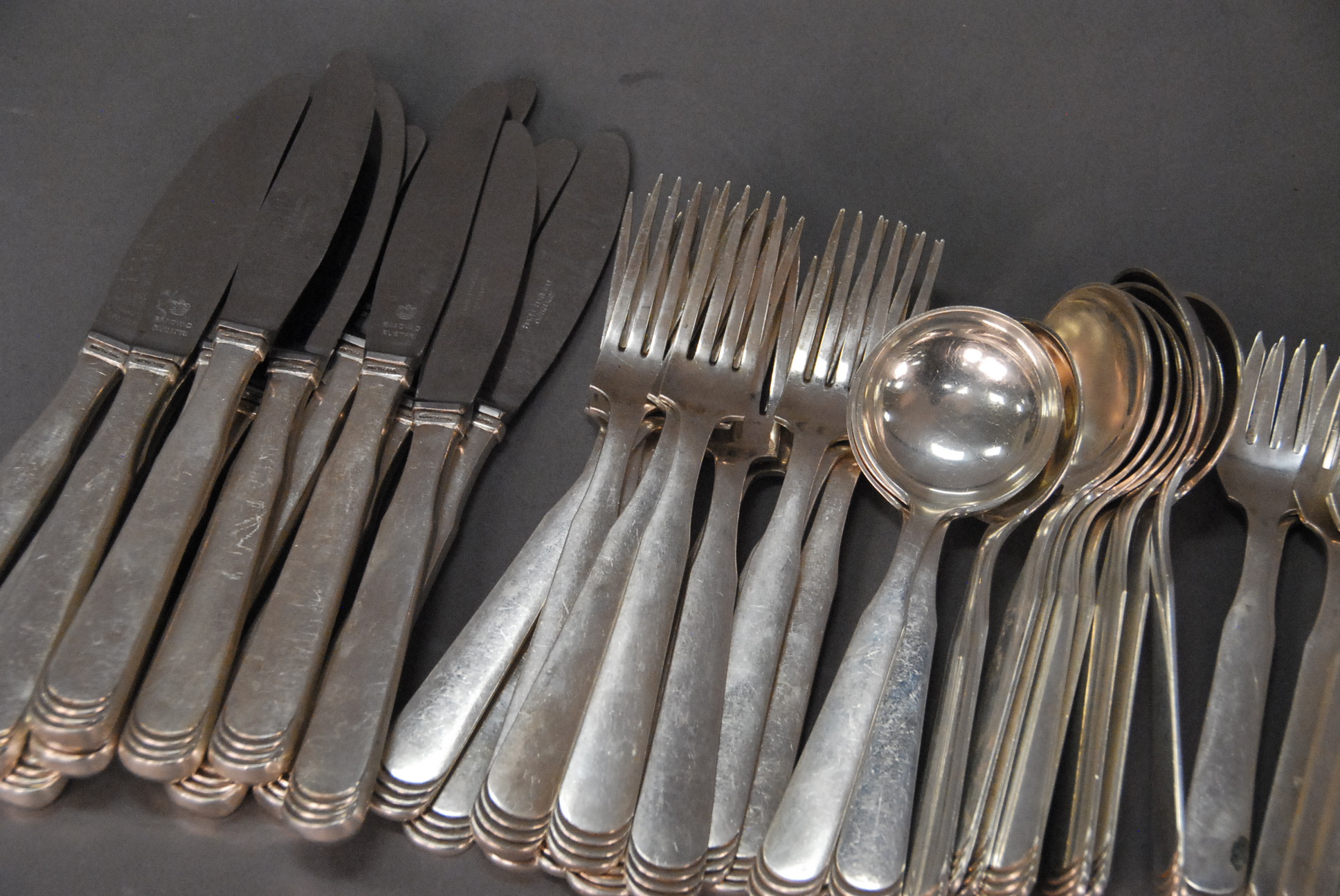 Lot 301: Hans Hansom Danish sterling silver flatware set including 12 dinner forks, 12 dinner knives, 12 soup spoons, 24 teaspoons, 18 luncheon forks, 11 hors d’oeuvre forks, 12 butter knives, and 11 serving pieces, 112 pieces in total. 143 t oz. plus