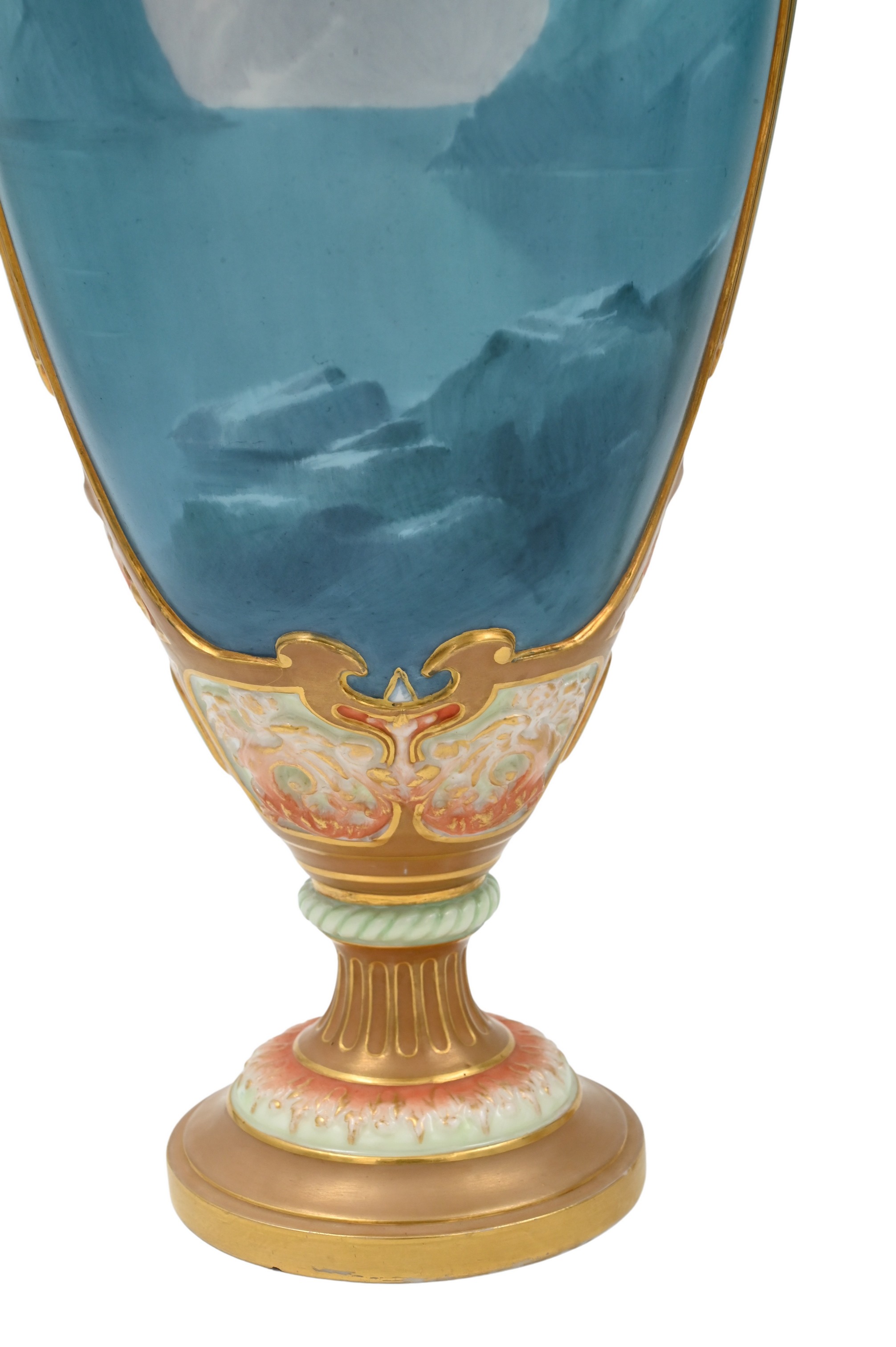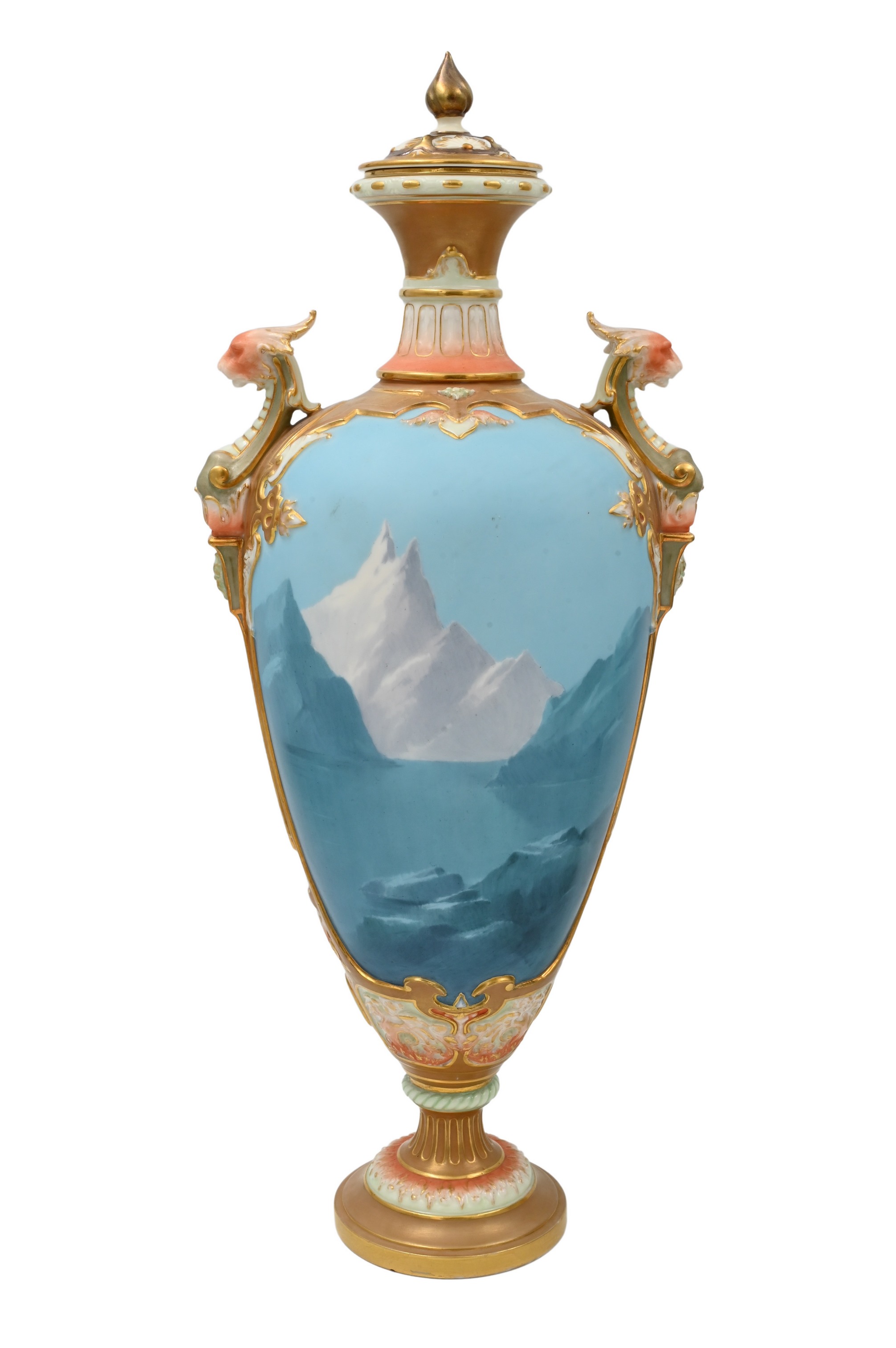 having a continuous icelandic scene with two polar bears, two peach and gilt colored griffin handles, having gilt flame finial on lid, signed lower right “H. Davis”, purple Worcester mark on base, model number 240969, marked 1764