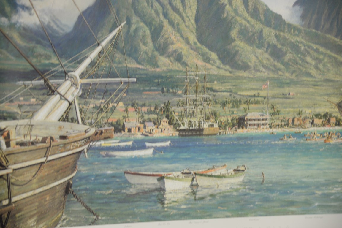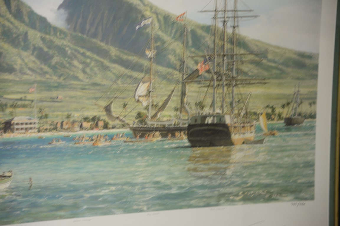 Lot 301: John Stobart 1929 print Lahaina The Whaling Brig Isabella arriving to a warm welcome in 1865 signed lower right in pencil Stob…
