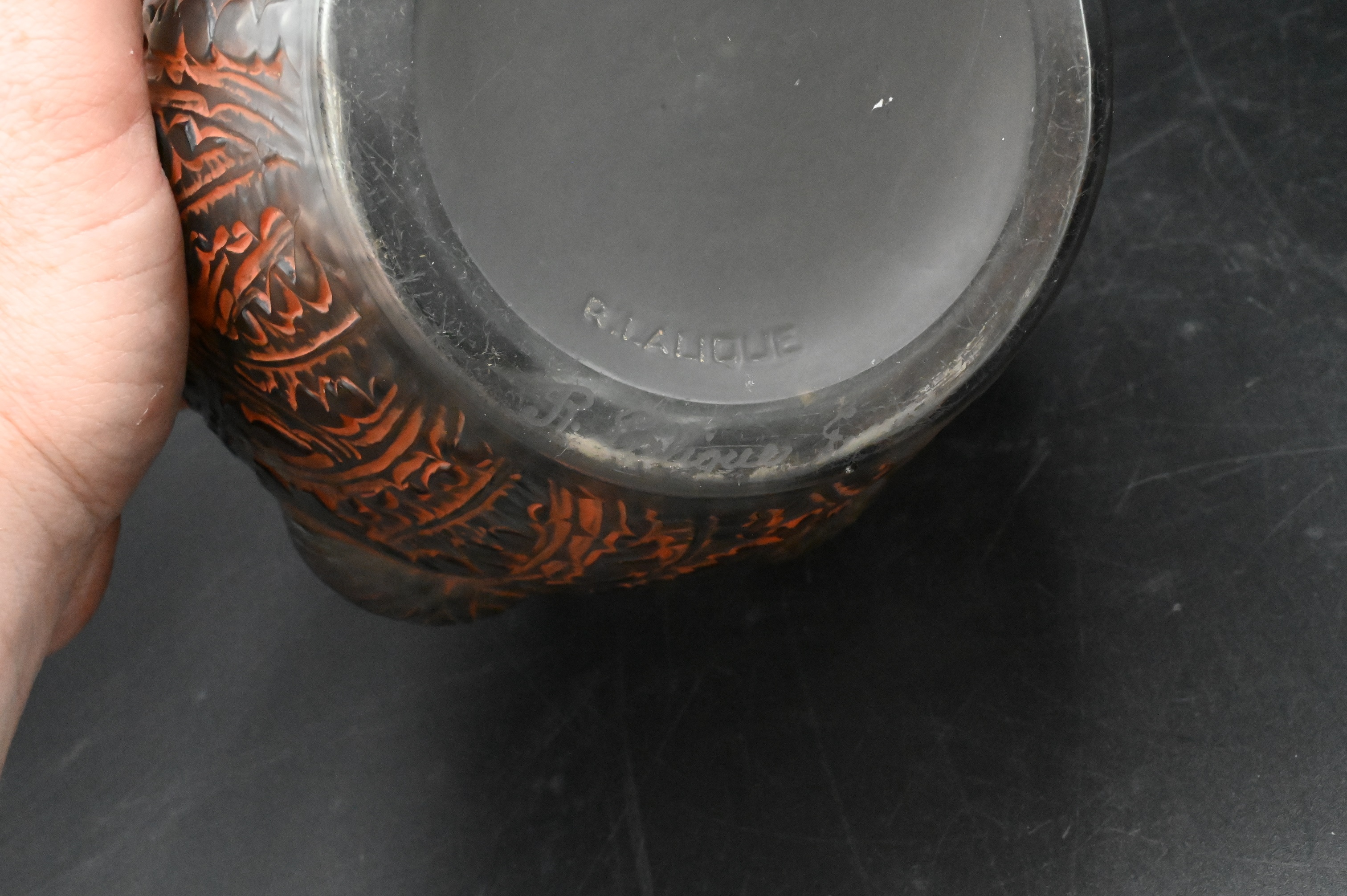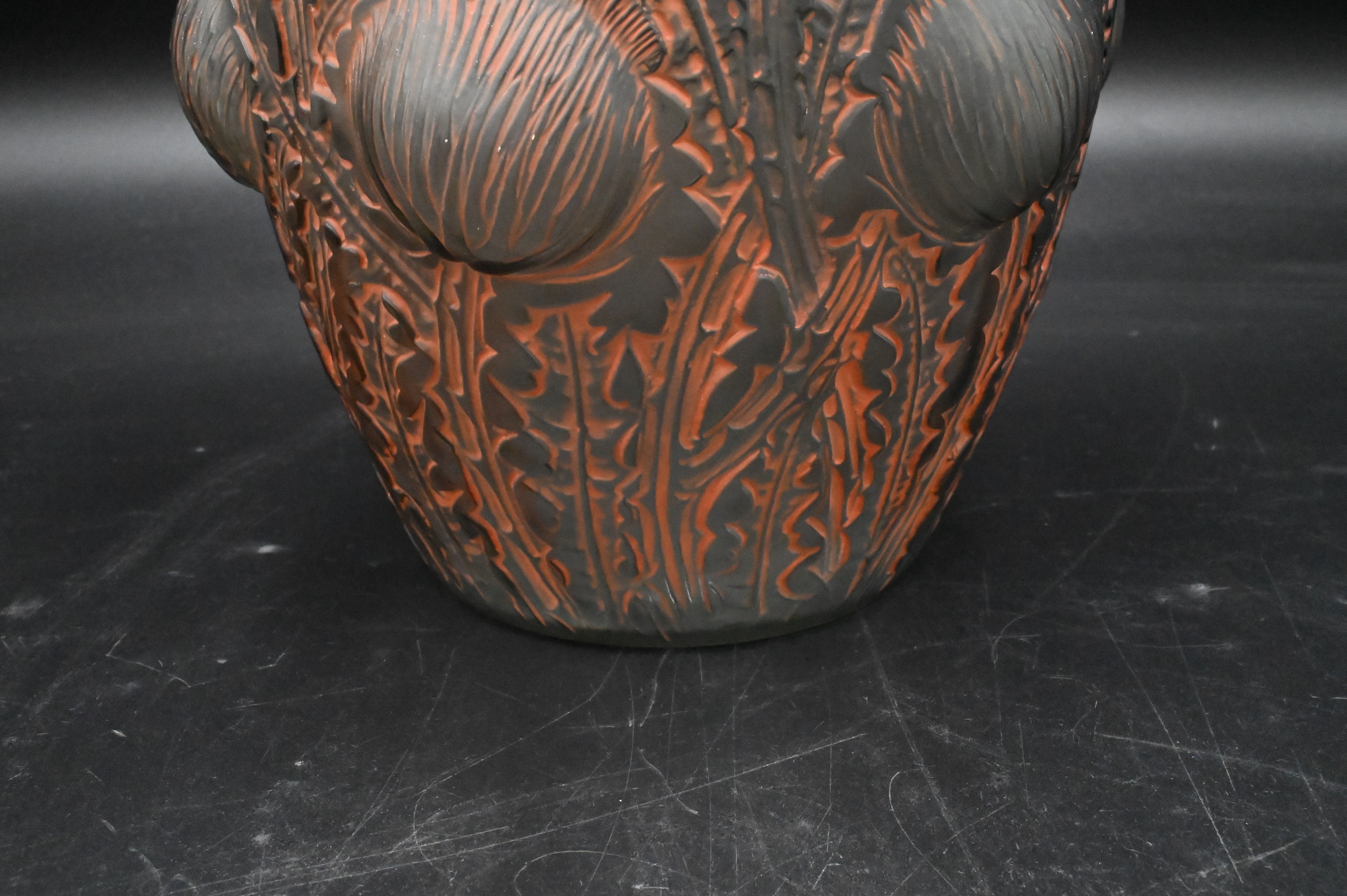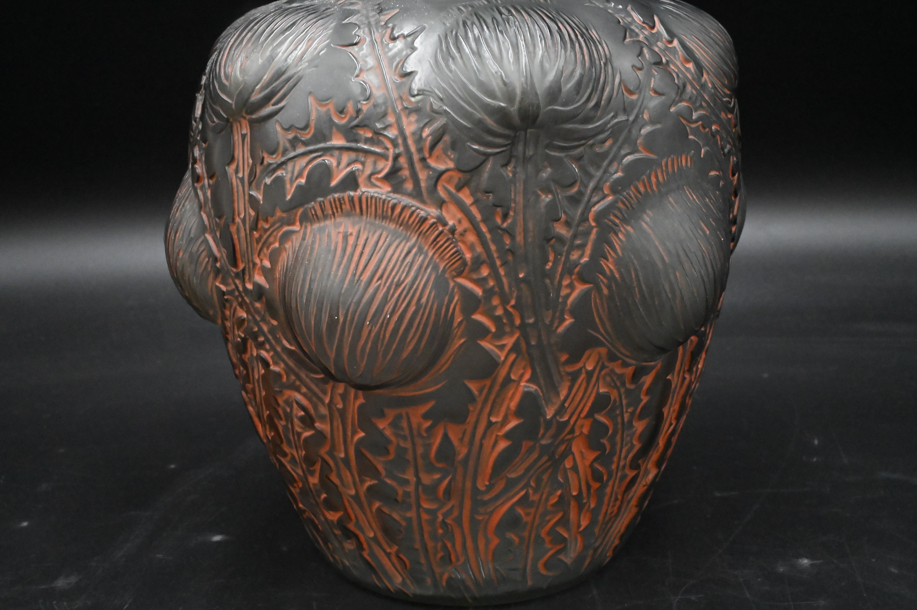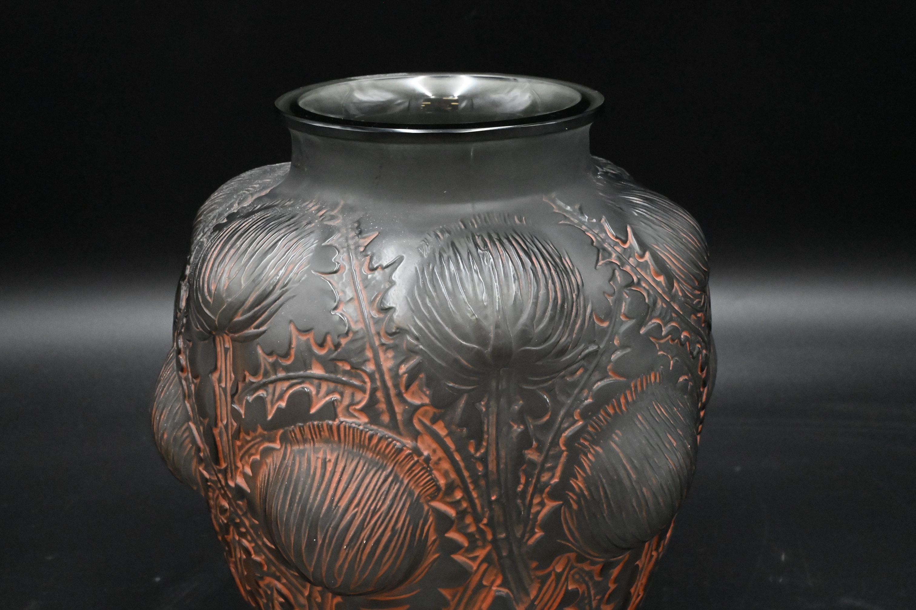 Lalique “Domremy” Smokey Topaz Glass Vase, of urn shaped form, having thistle and leaf pattern in relief with patinated orange highlights, stamped and signed “R. Lalique France” on bottom, in block letters and in script, height 8 1/2 inches, diameter 7 1/2 inches
