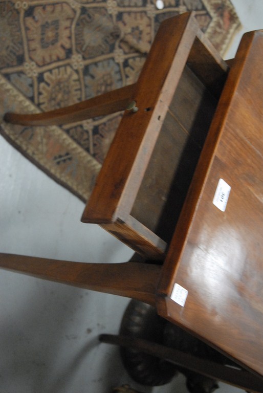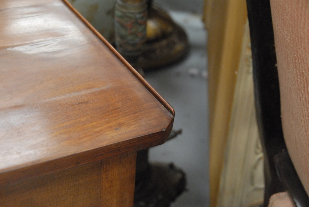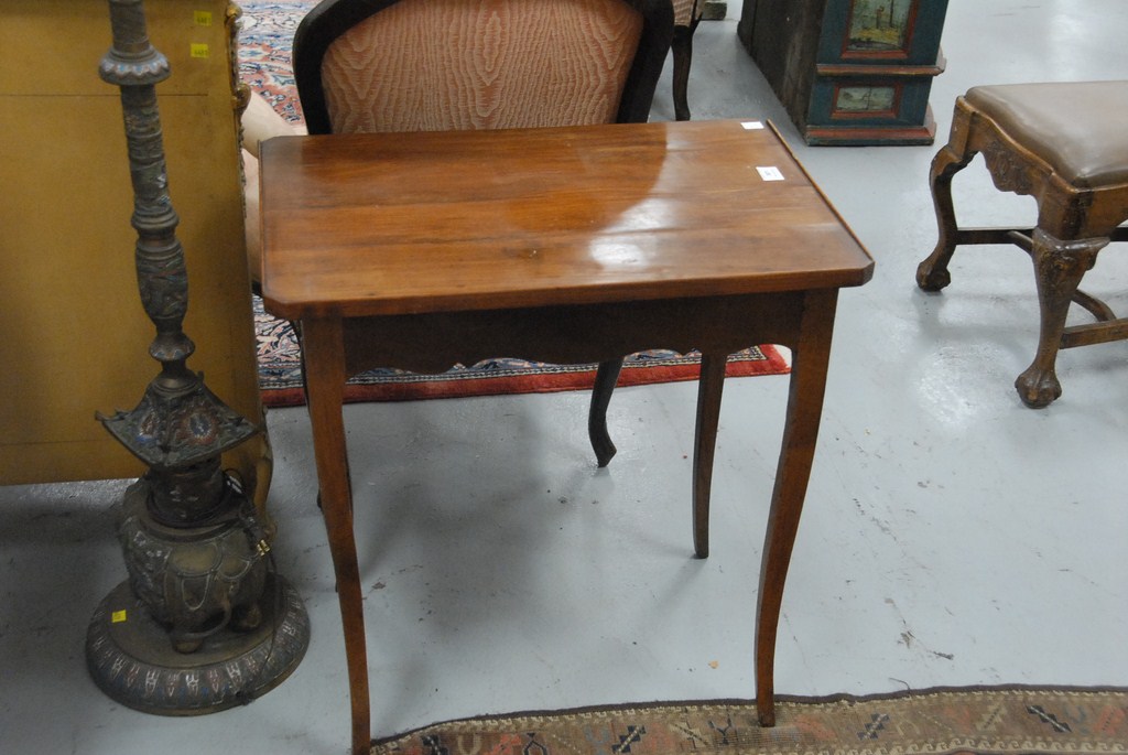Lot 301: Louis XV fruitwood small table desk with single side drawer and molded rectangular wood top with canted corners surrounded by three-…