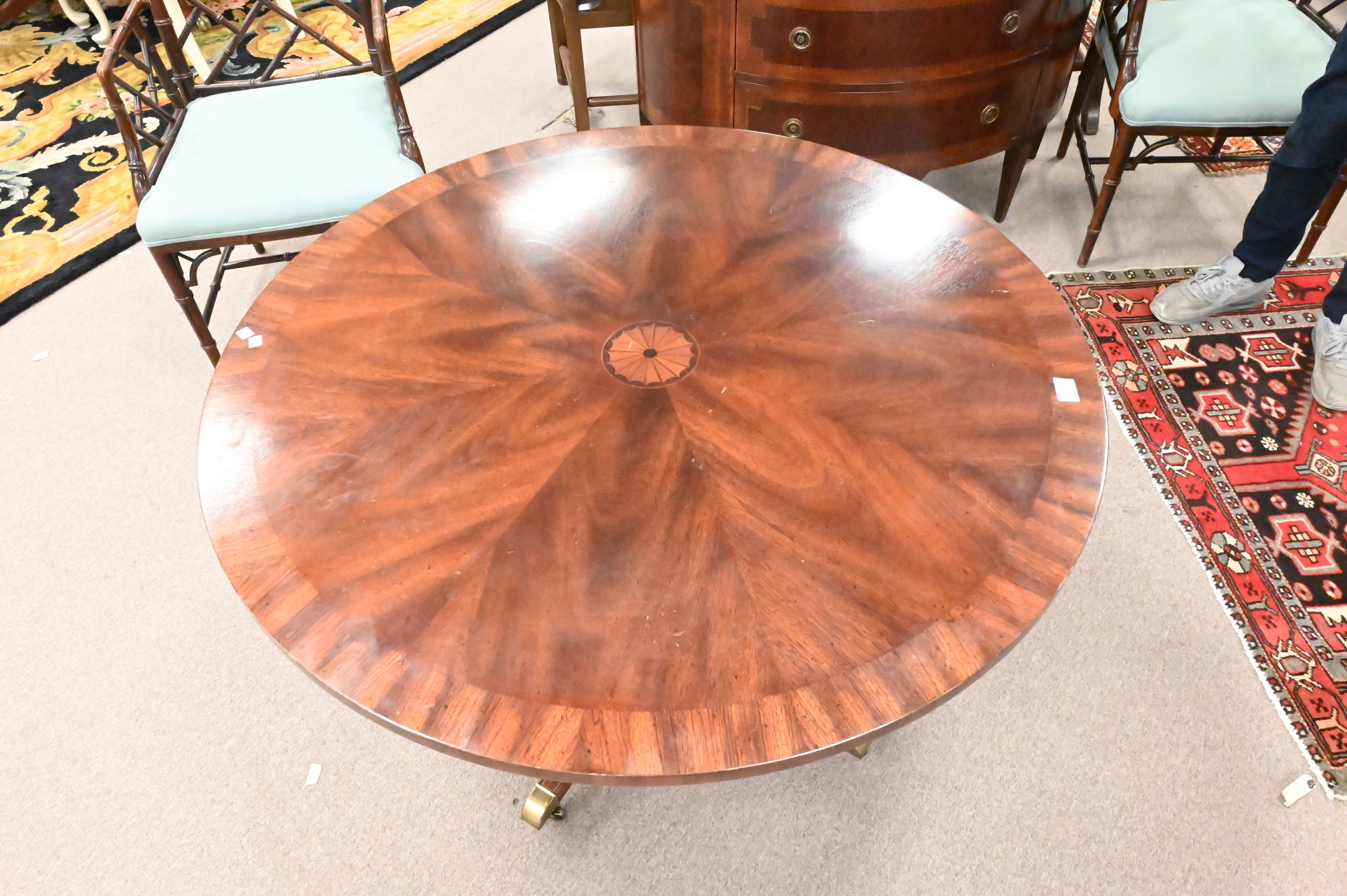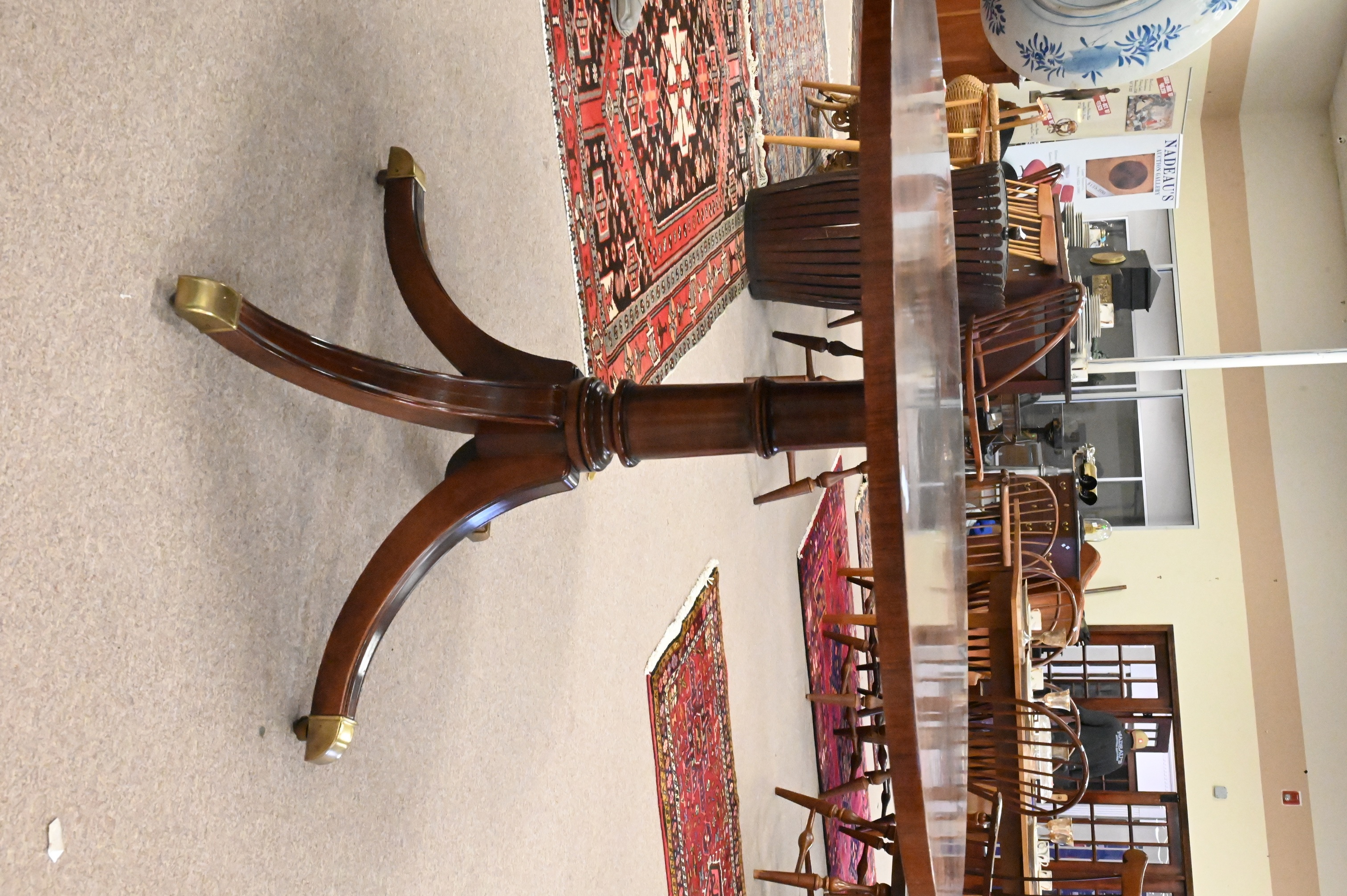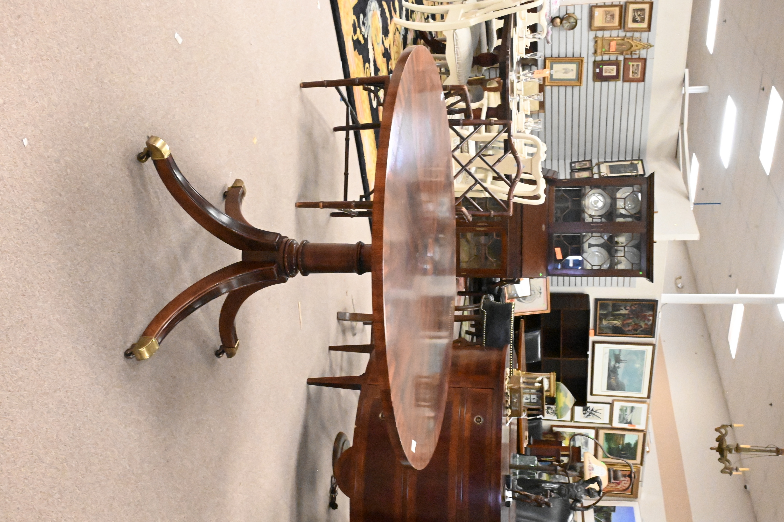 set on pedestal base terminally in four members set on brass capped feet and castors