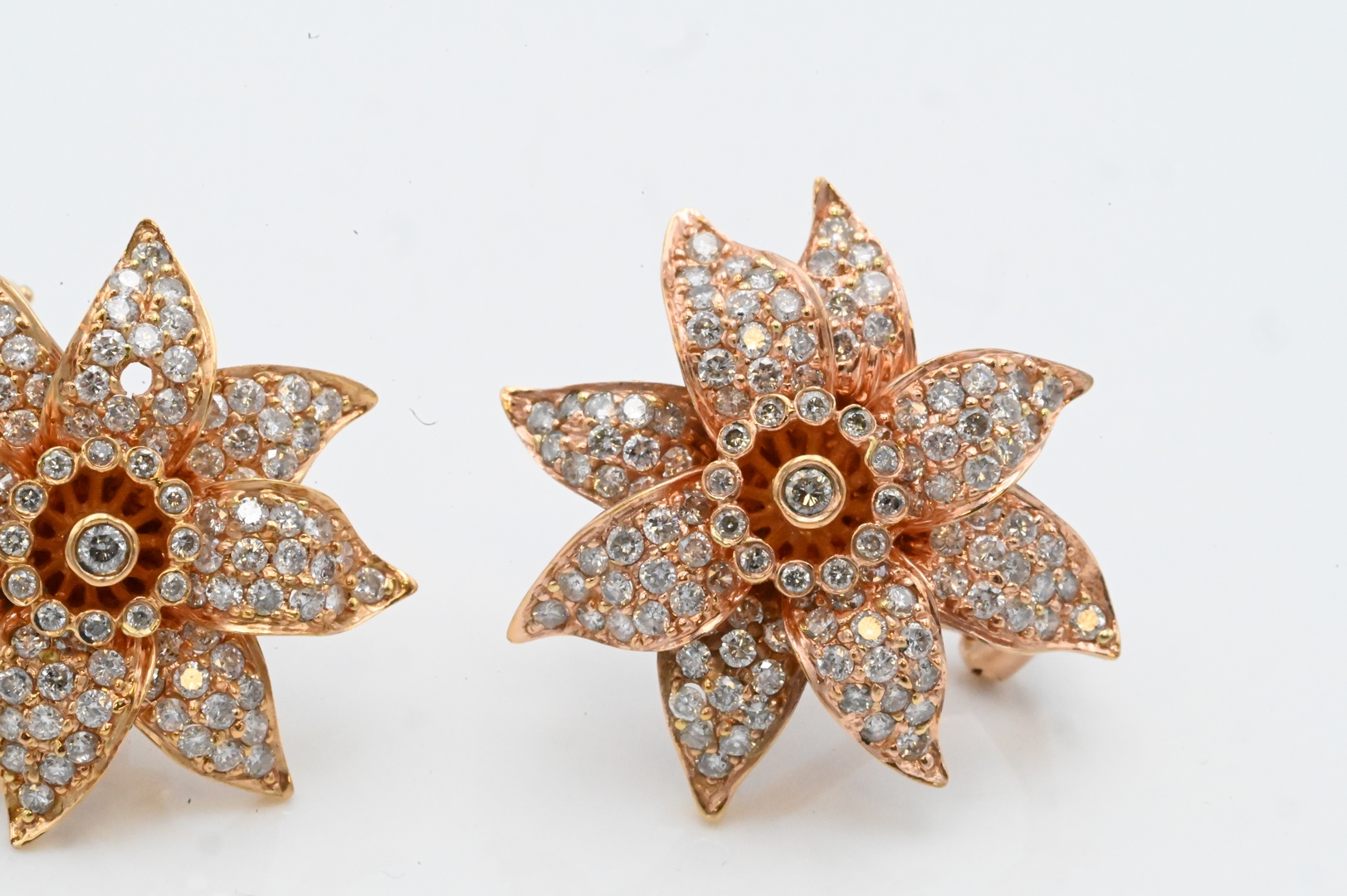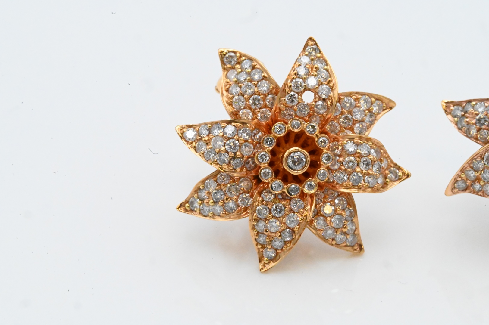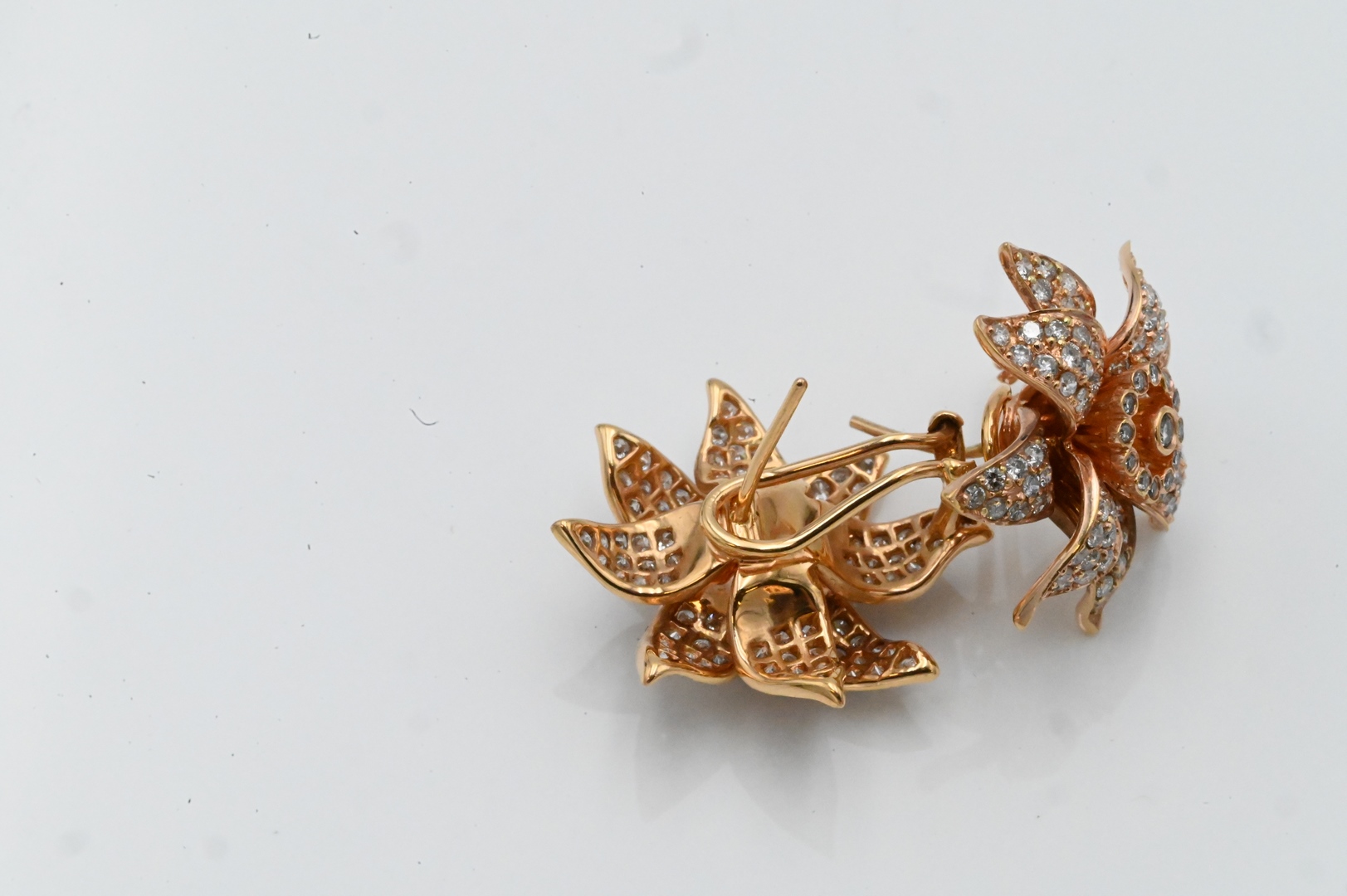 Pair of 18 Karat Yellow Gold Earrings in form of eight flower petals set with diamonds, pierced earrings diameter 7/8 inch, 11.6 grams