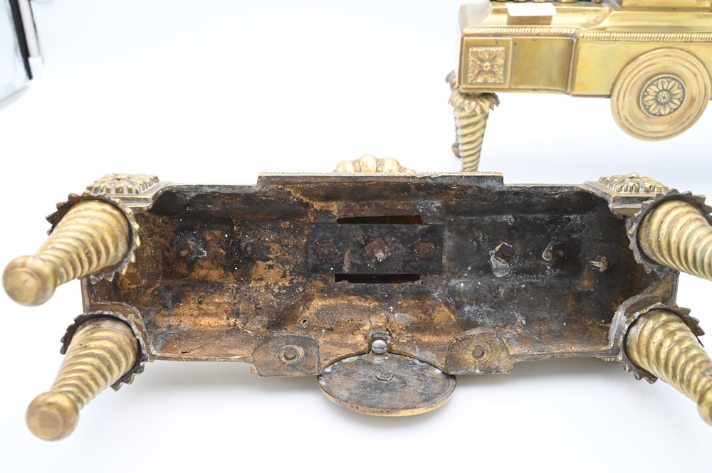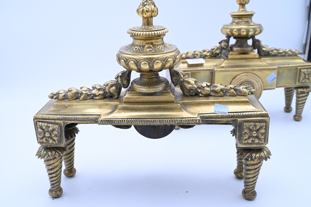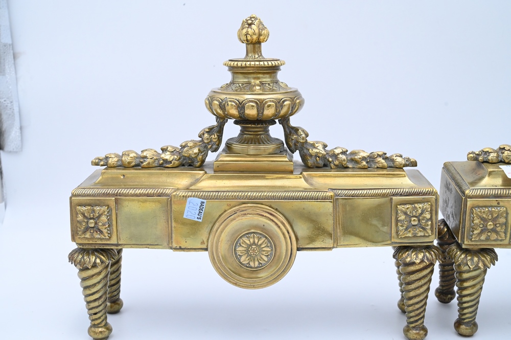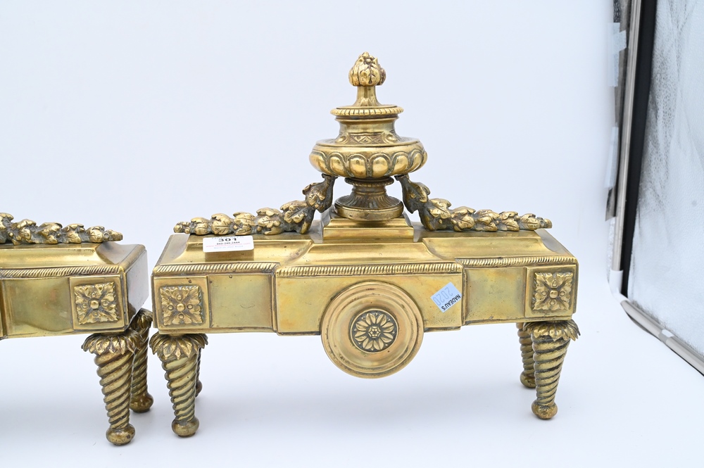 Lot 301: Pair of Brass Neoclassical Chenets, with urns and wreathing, height 12 inches, width 13 1/2 inches.