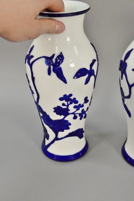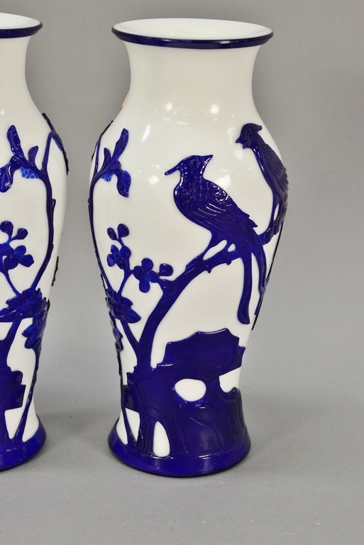 Pair of Chinese Peking glass vases, blue over white glass, decorated with birds and flowering branches.