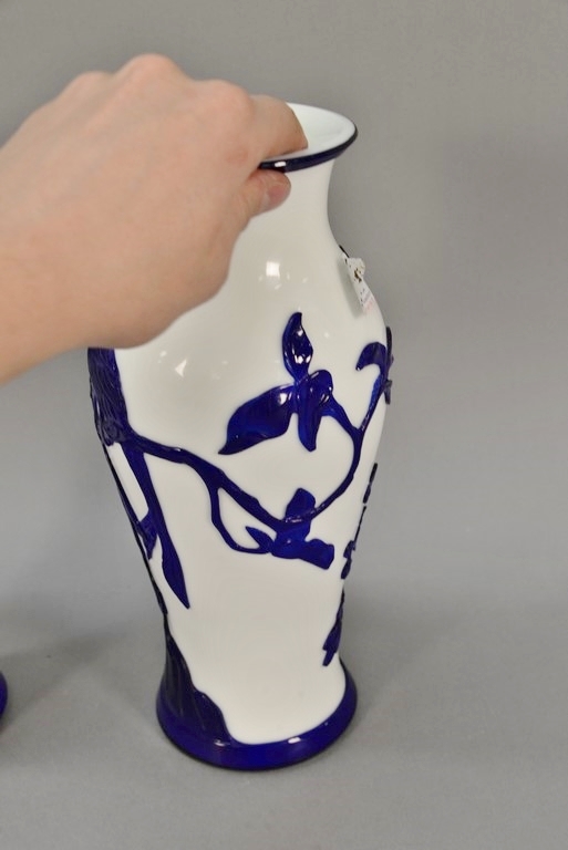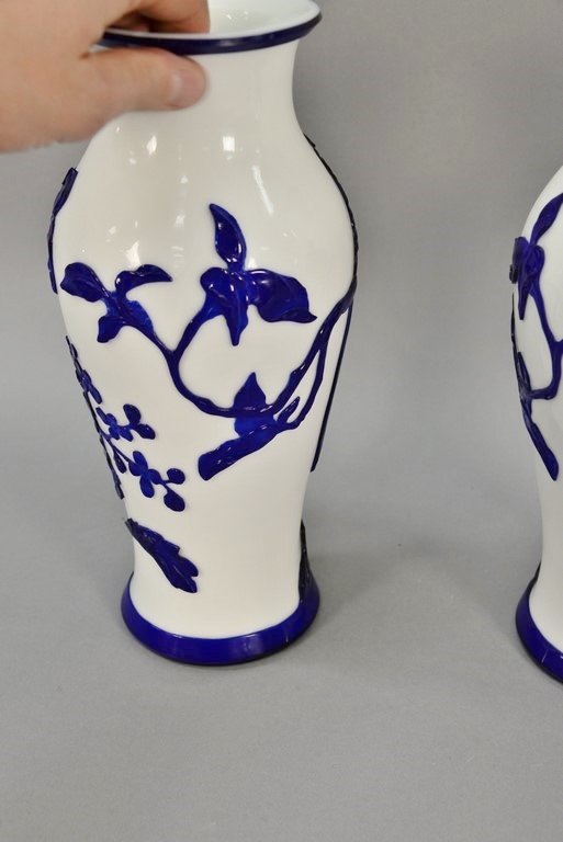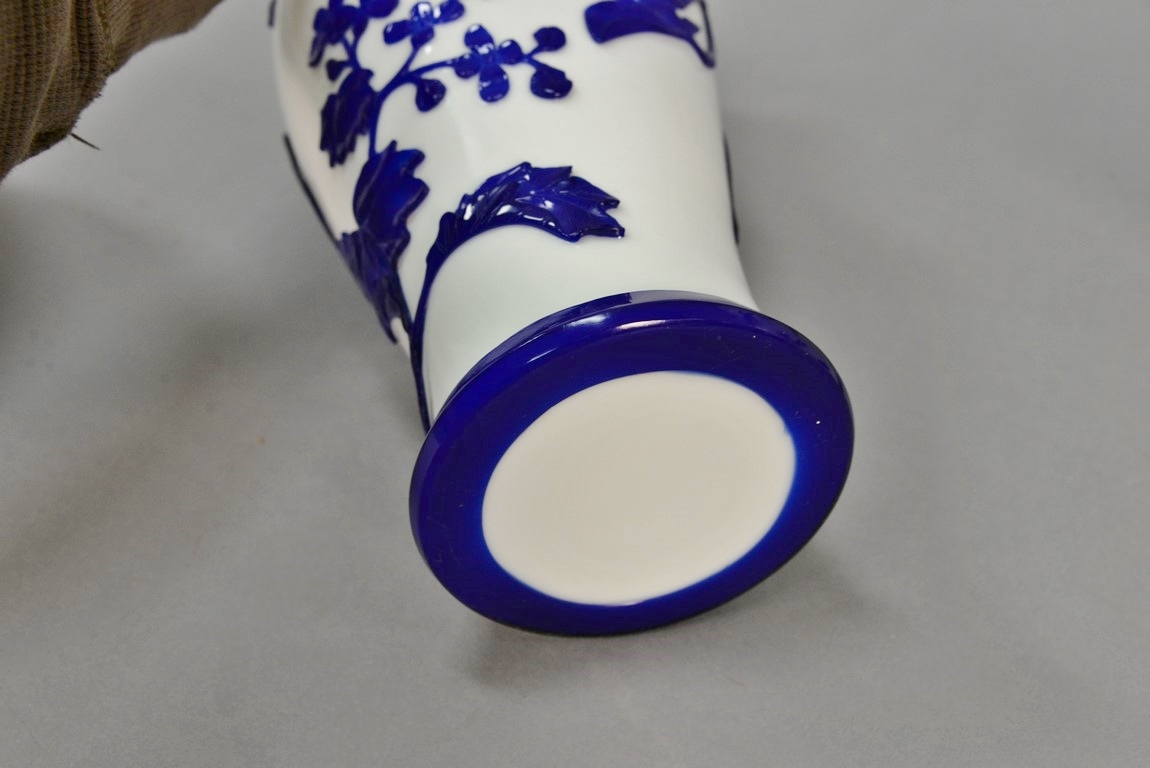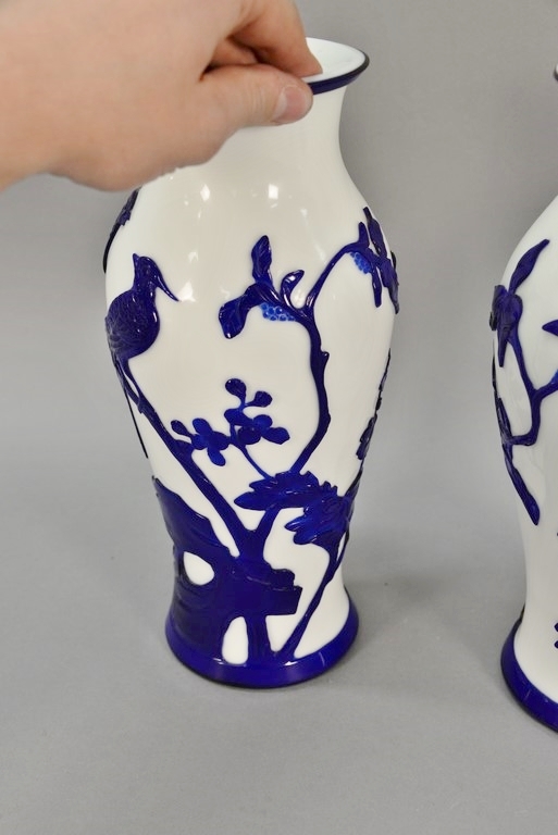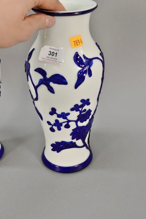 Lot 301: Pair of Chinese Peking glass vases, blue over white glass, decorated with birds and flowering branches. ht. 12 in.