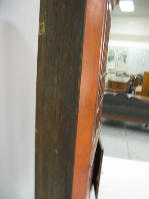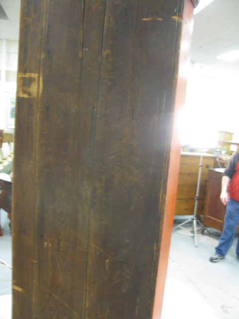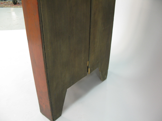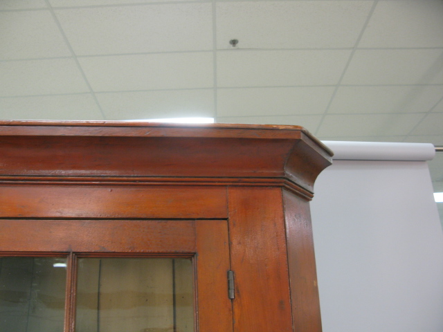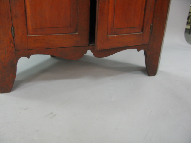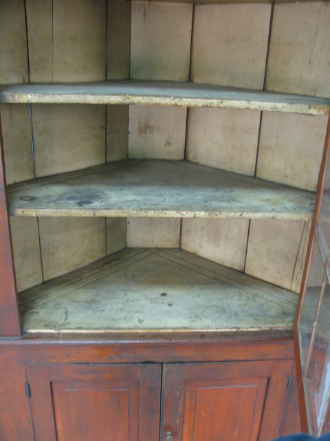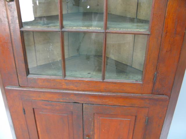 Primitive corner cupboard with large cornice molding over single door with twelve glass panel door over two raised panel doors all set on cutout bracket base, 18th century.