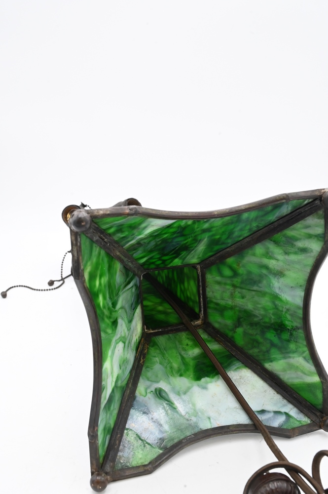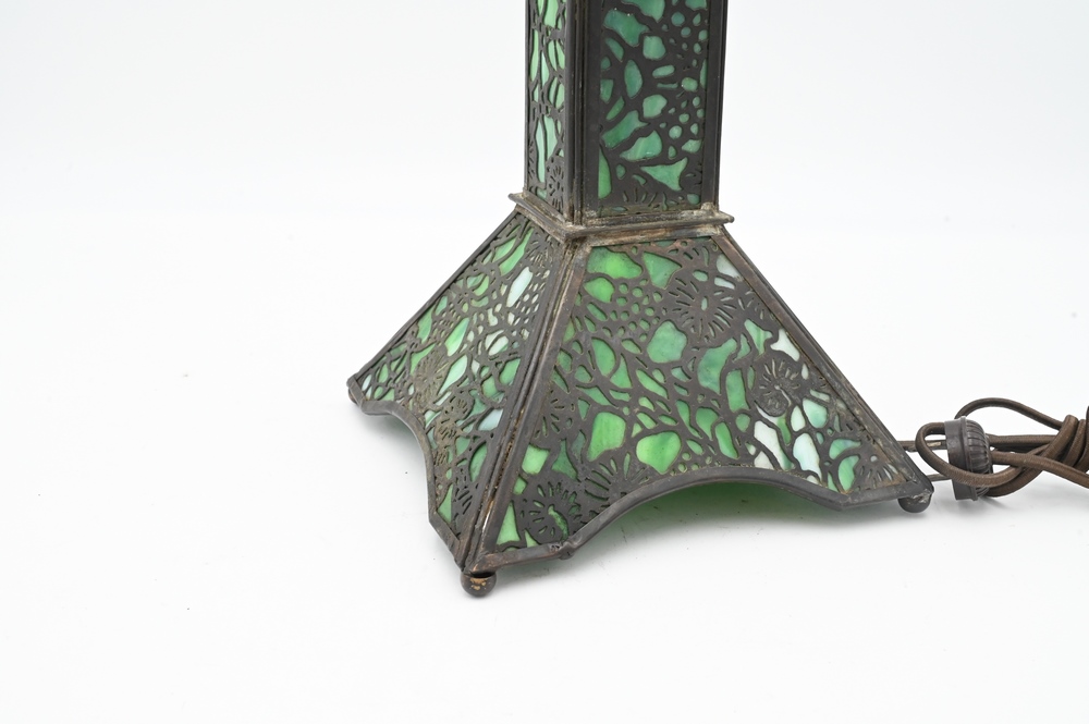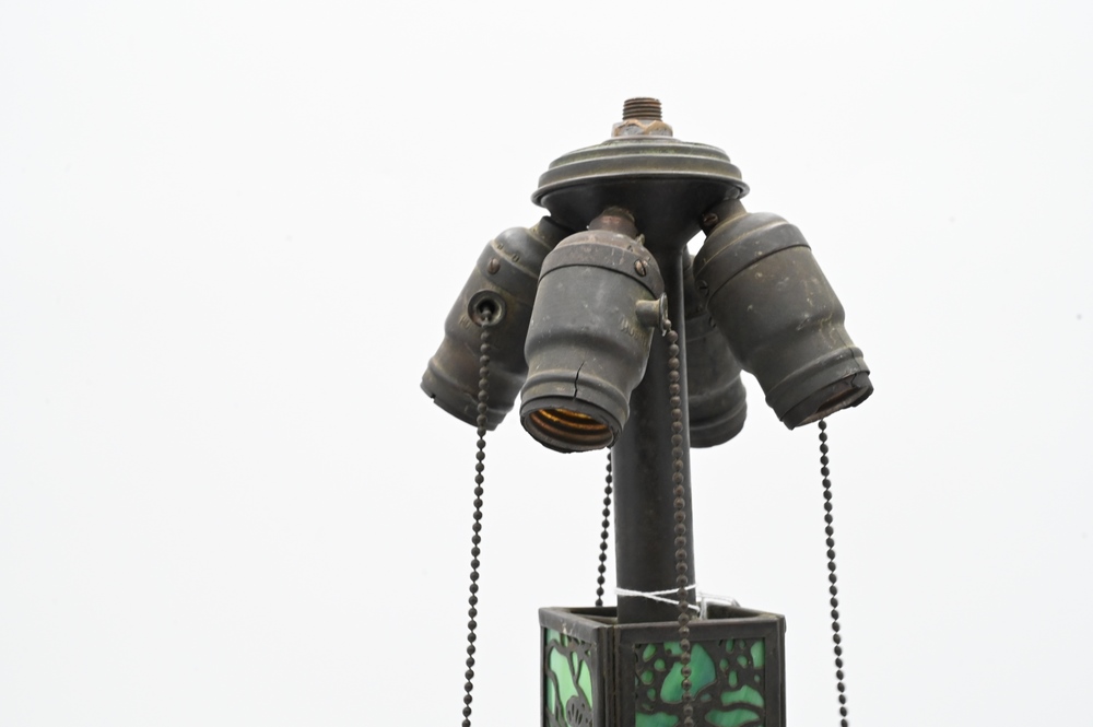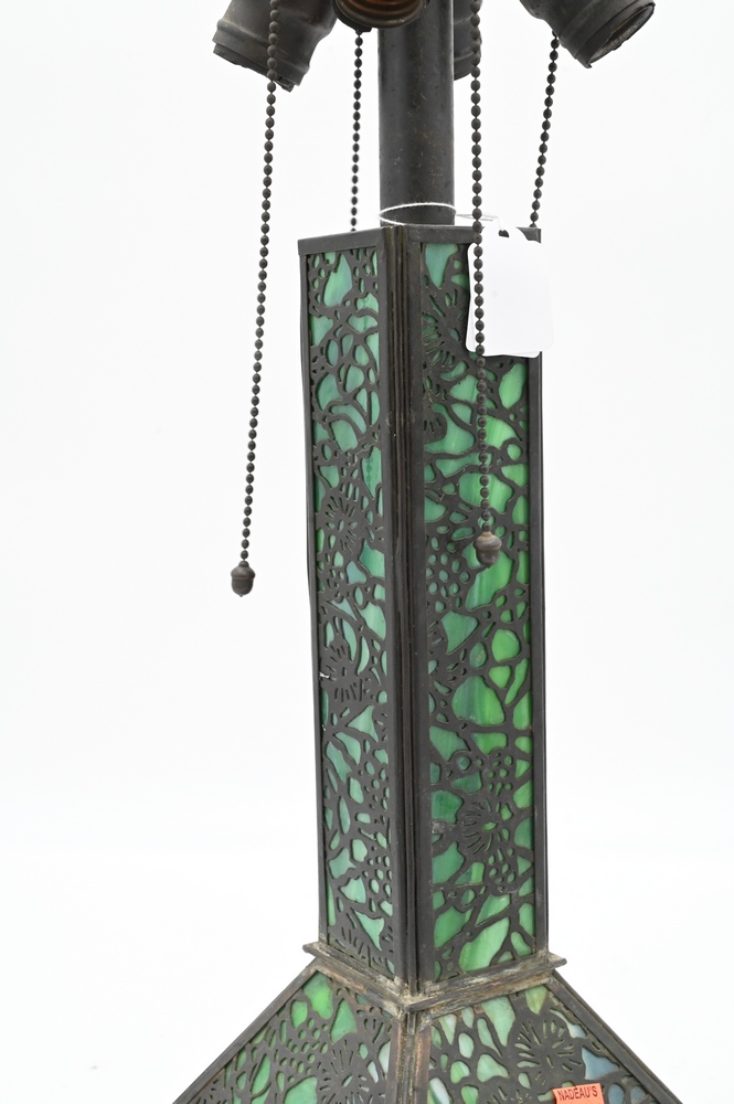 Riviere Studios Grapevine Overlay Table Lamp Base, having four sockets on green slag glass base, having grapevine design, height 21 inches.