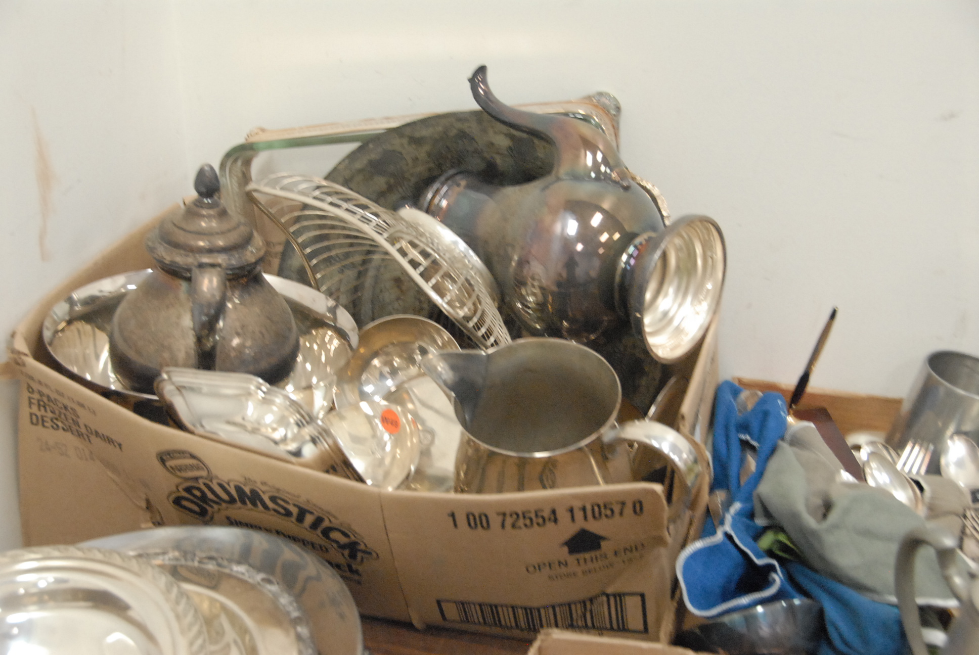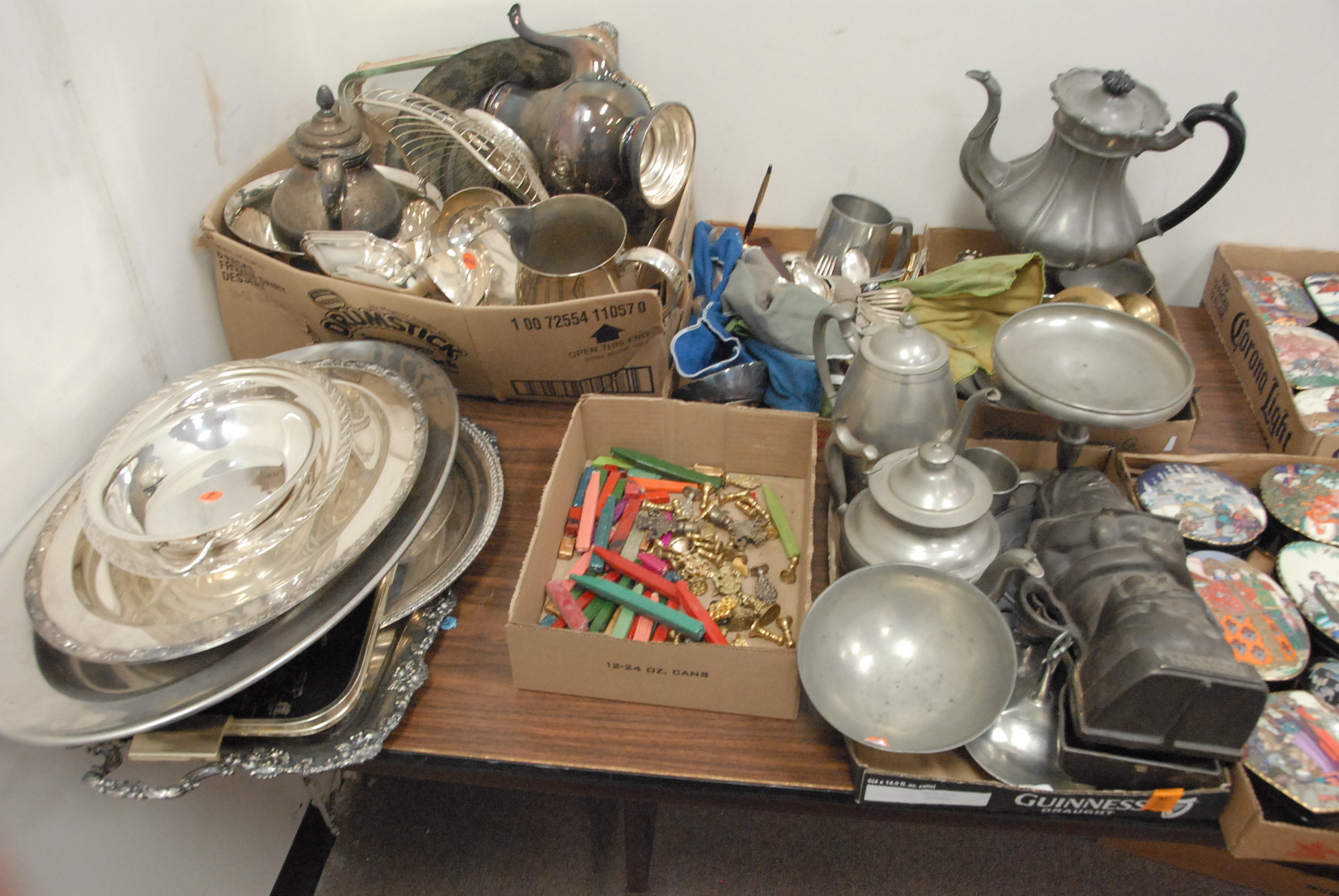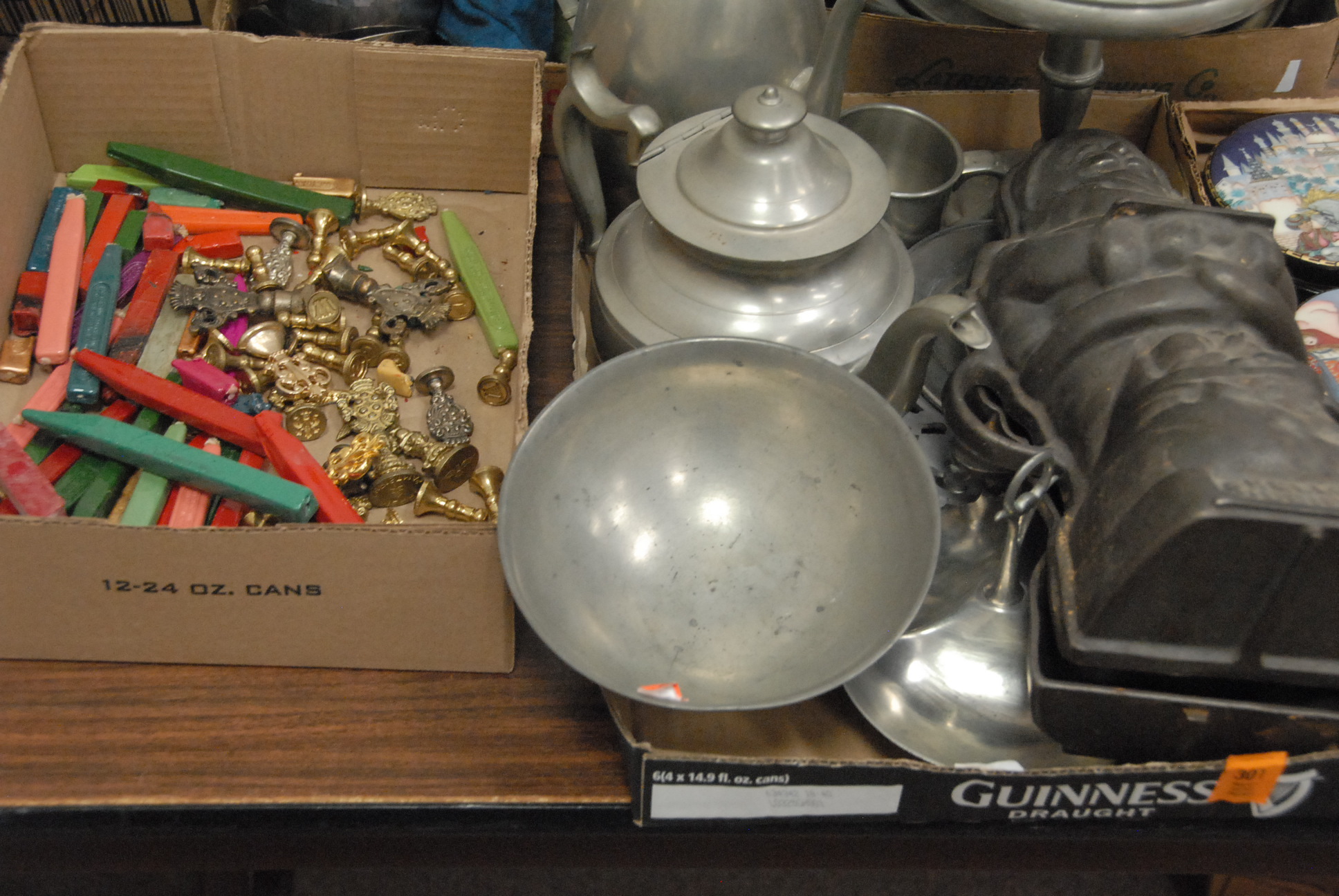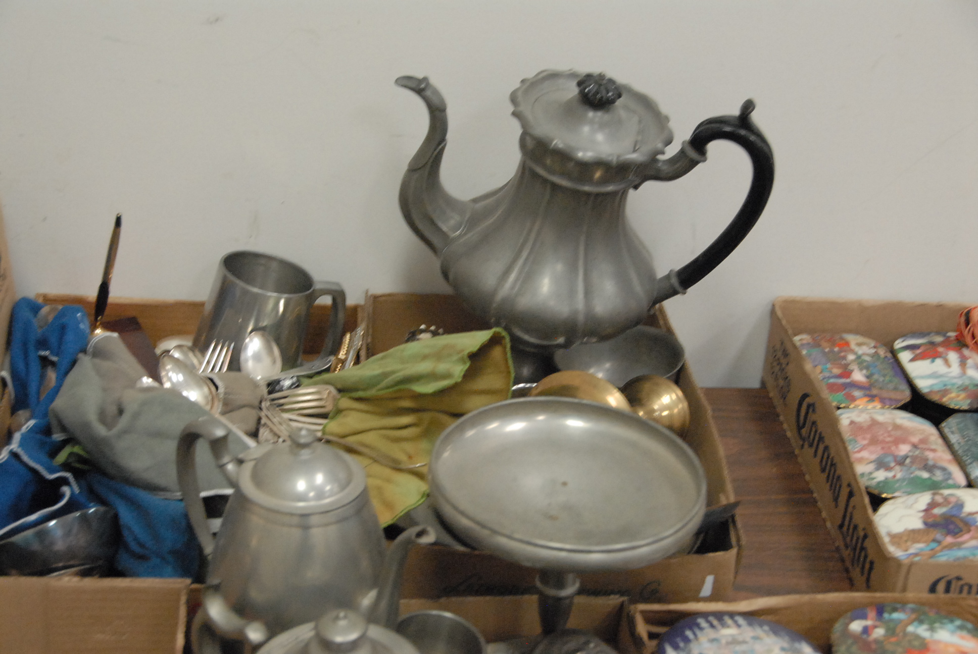 Six box lots to include pewter, Santa Claus mold, silver plate, and small brass items.