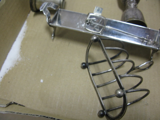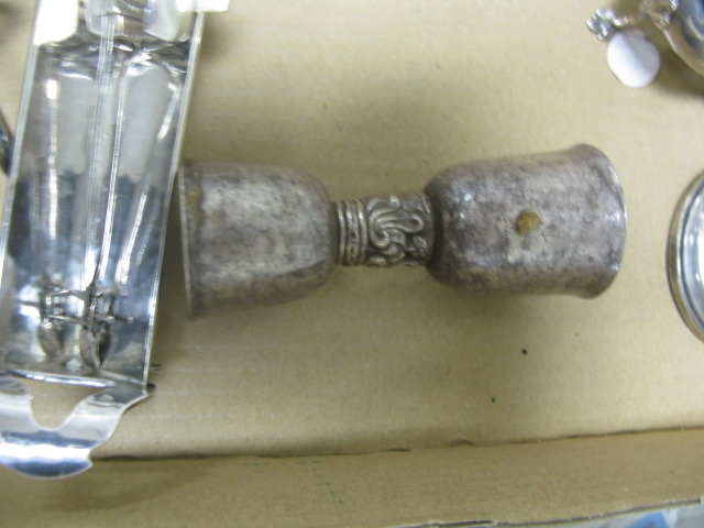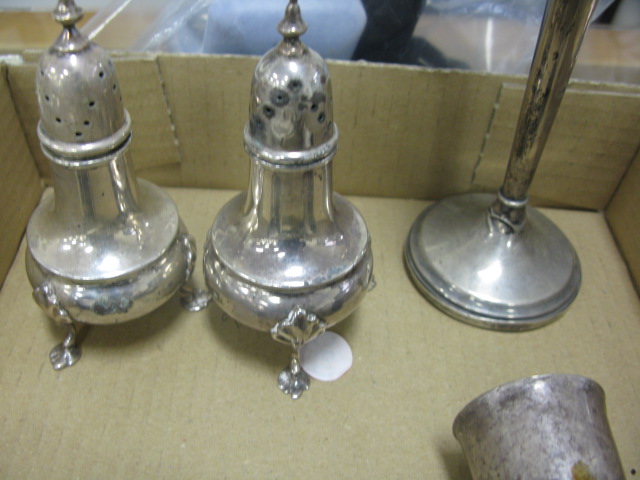 Sterling silver lot to include salt and pepper shaker, small mug, toast holder, shot glass, banjo shaker, weighted sterling vase