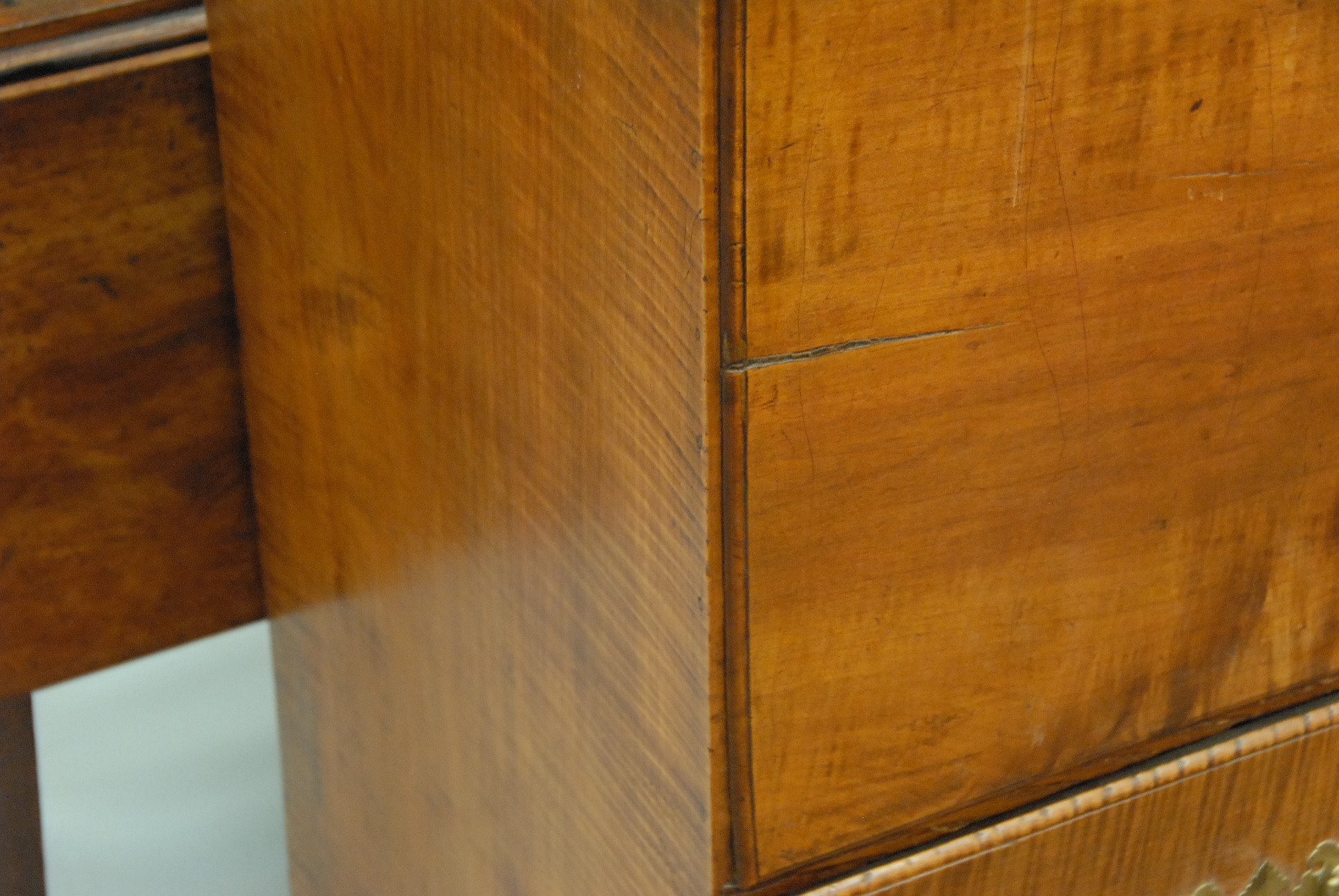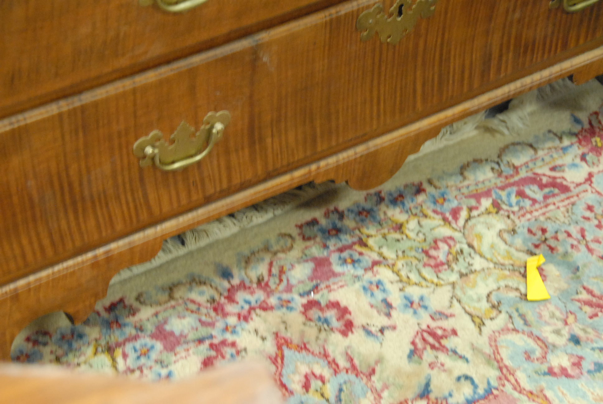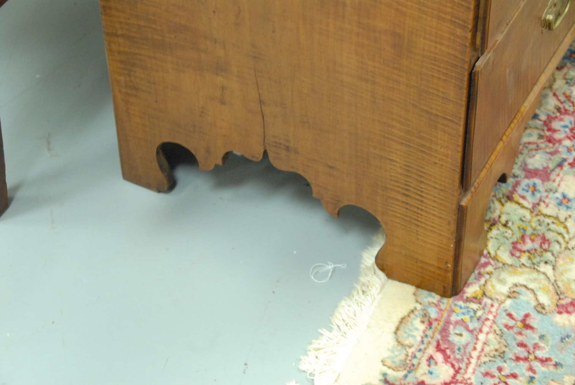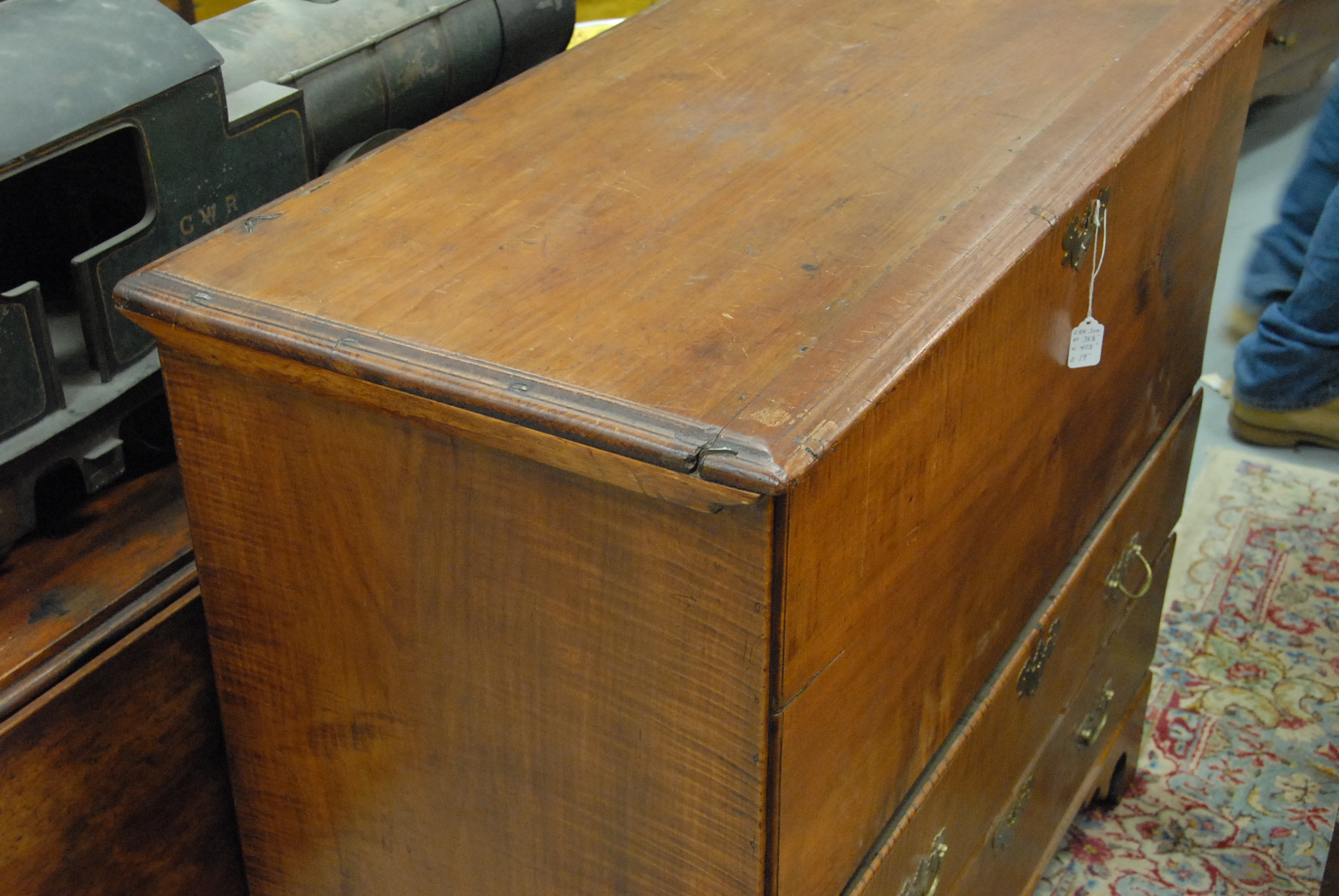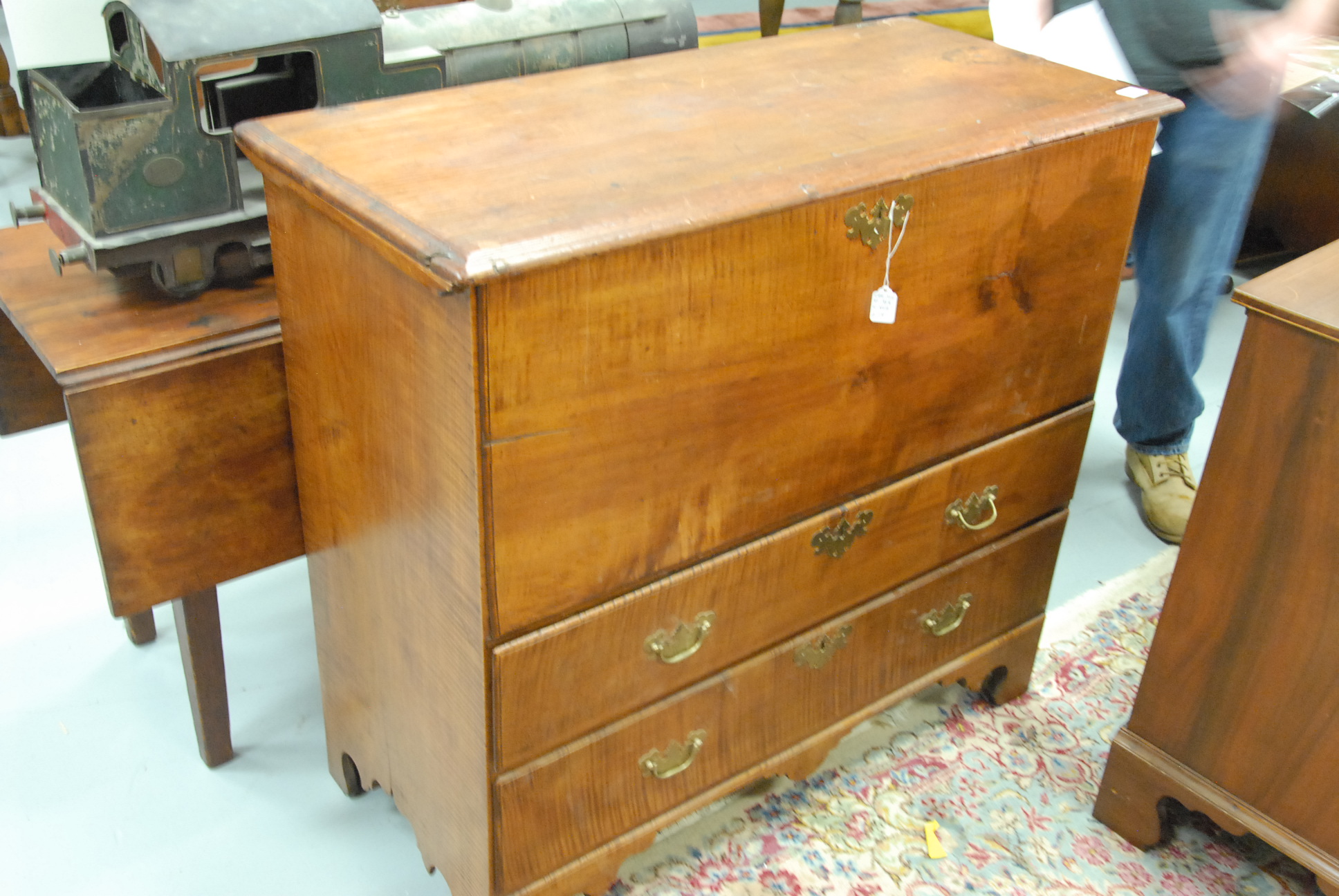 Tiger maple blanket chest with two drawers on bracket base.