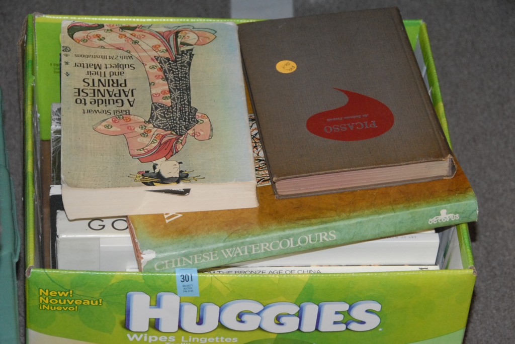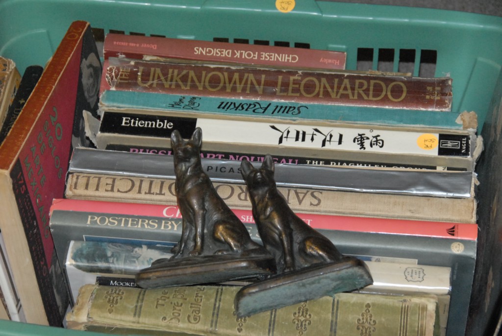 Two box lots of books mostly of Japanese ceramics, Japanese art, and various reference books along with pair of dog door stops.