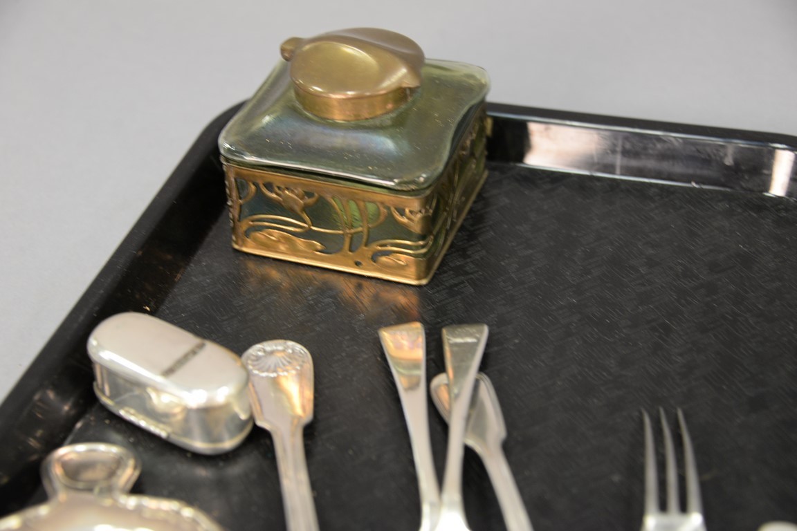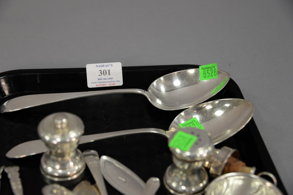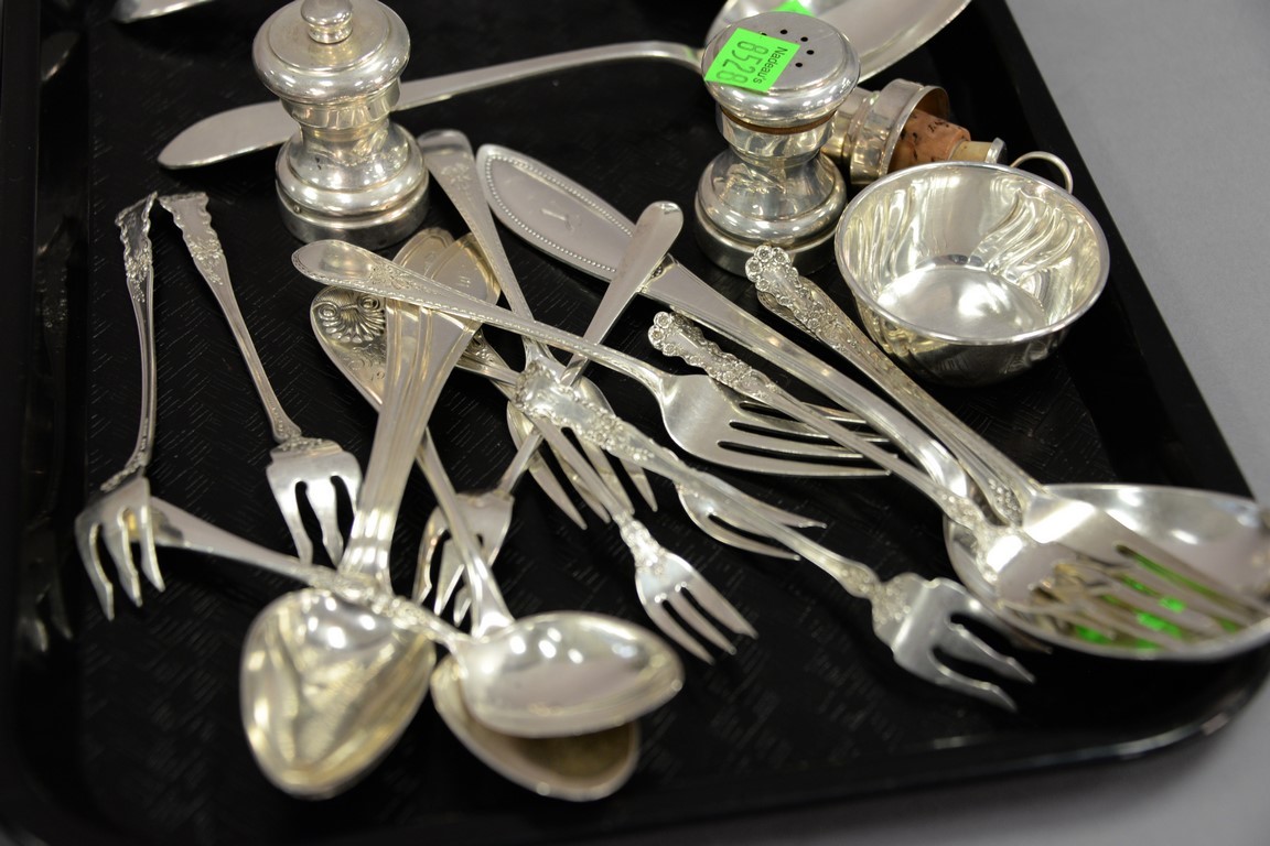 Lot 301: Two tray lots of sterling silver flatware and serving pieces along with silverplated items and an Art Nouveau inkwell missing inser…