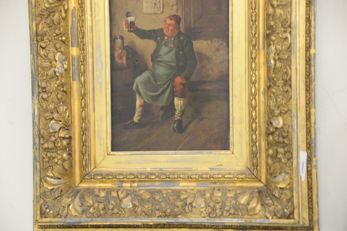 19th Century oil on canvas Dutch interior scene of man seated with stein of beer in gilt Victorian frame, signed lower right P. Ge., 10 x 7.