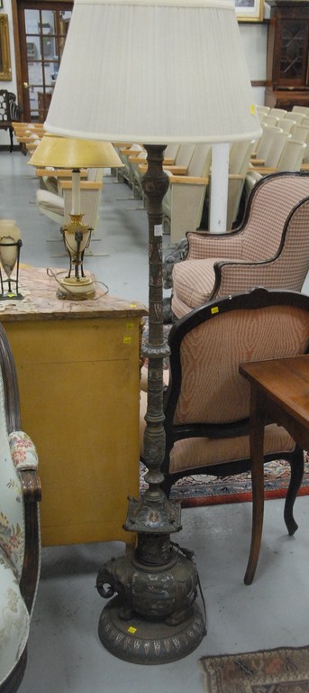 Lot 302: Brass and enameled floor lamp with pagoda style roof over elephant on round base all highlighted with blue, red, and white enameling…