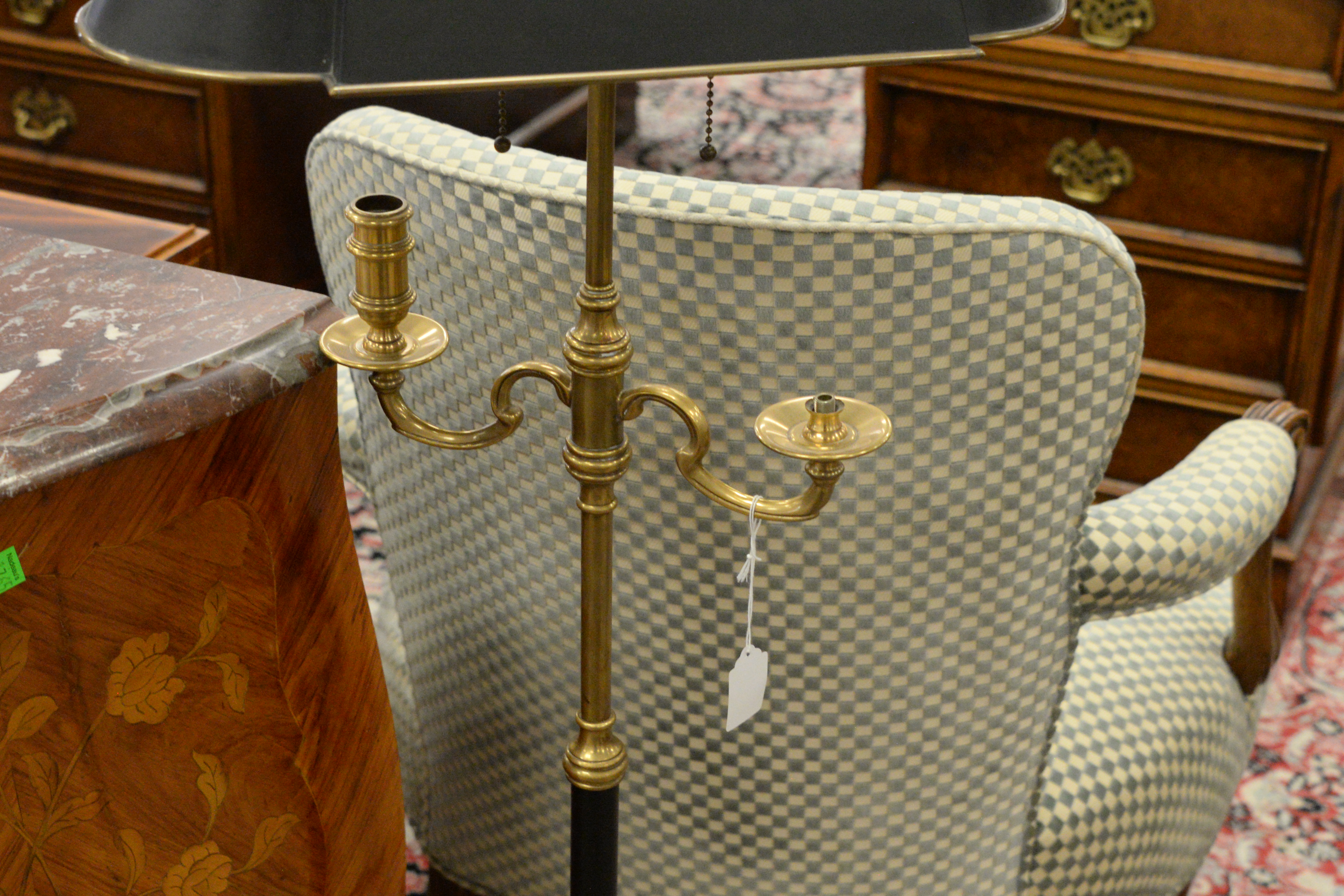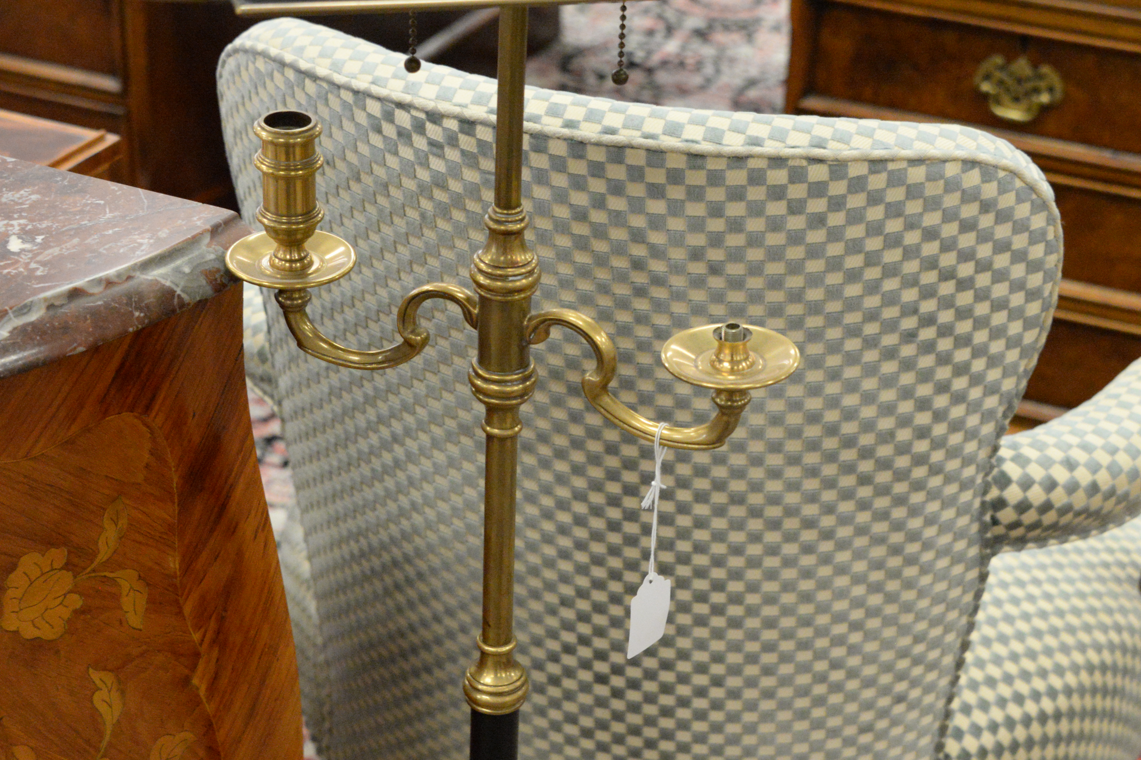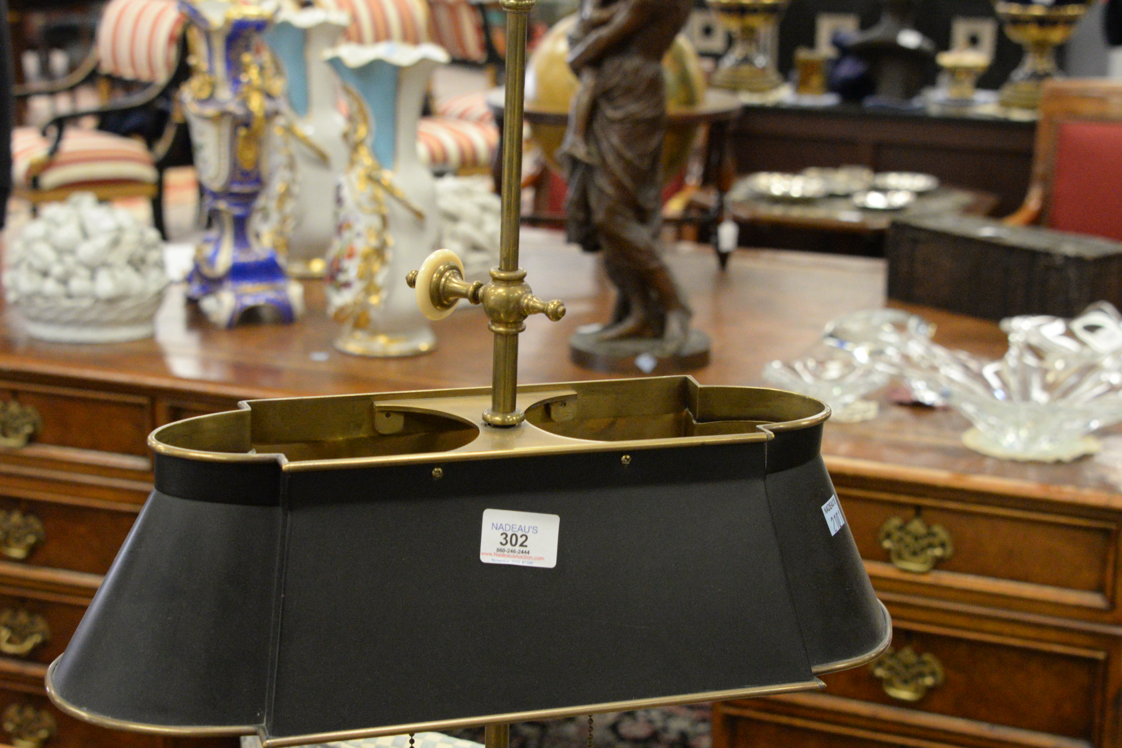 Lot 302: Brass Two Arm Standing Floor Lamp With Tole Shade
