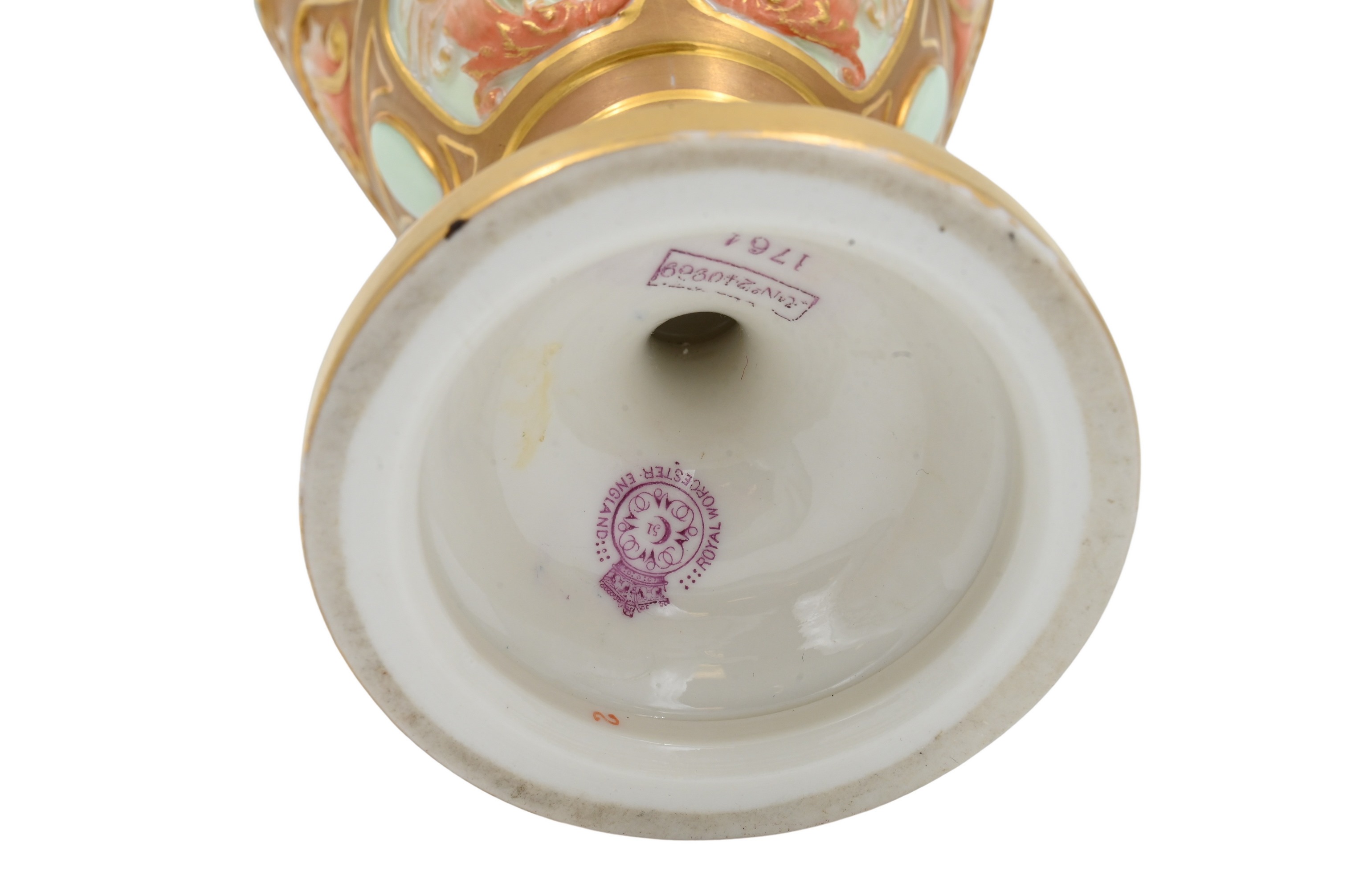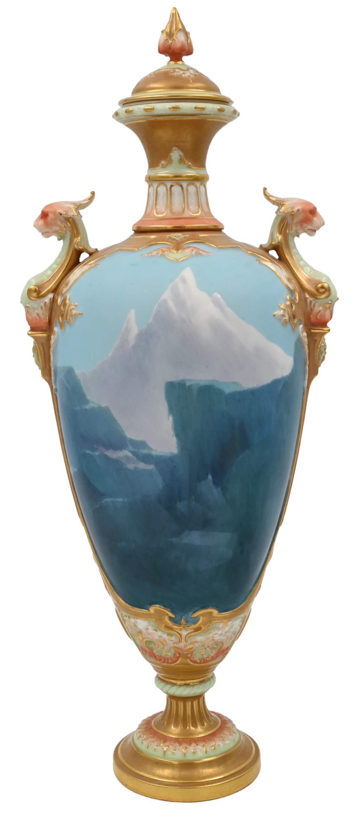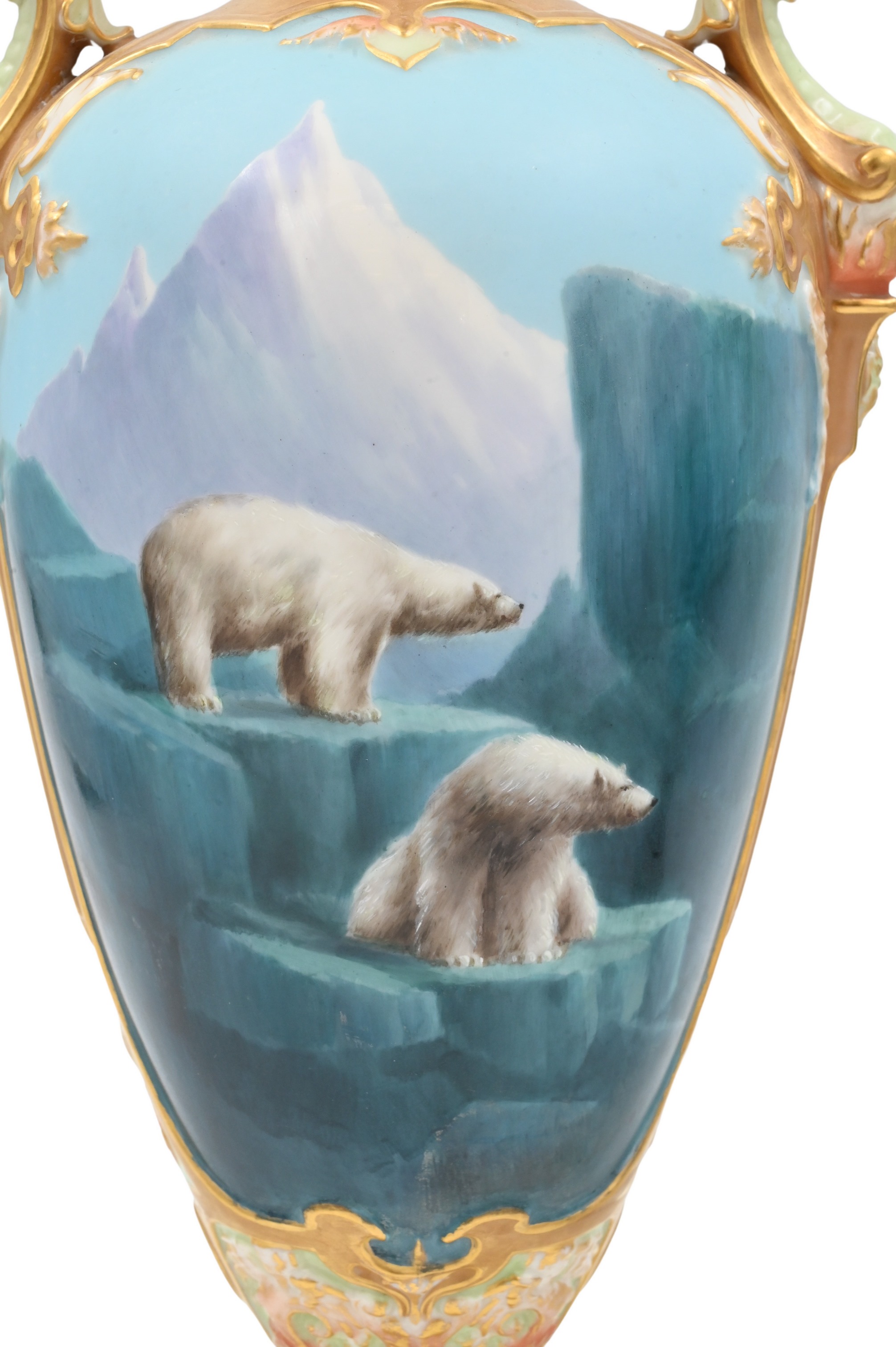 having a continuous icelandic scene with two polar bears, two peach and gilt colored griffin handles, having flame finial on lid, signed lower left “H. Davis”, purple Worcester mark on base, model number 240989, marked 1764