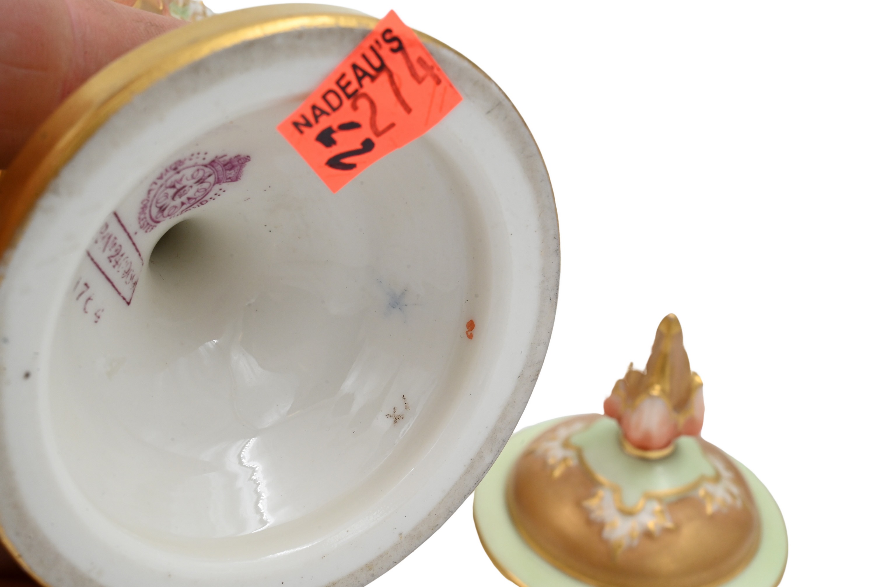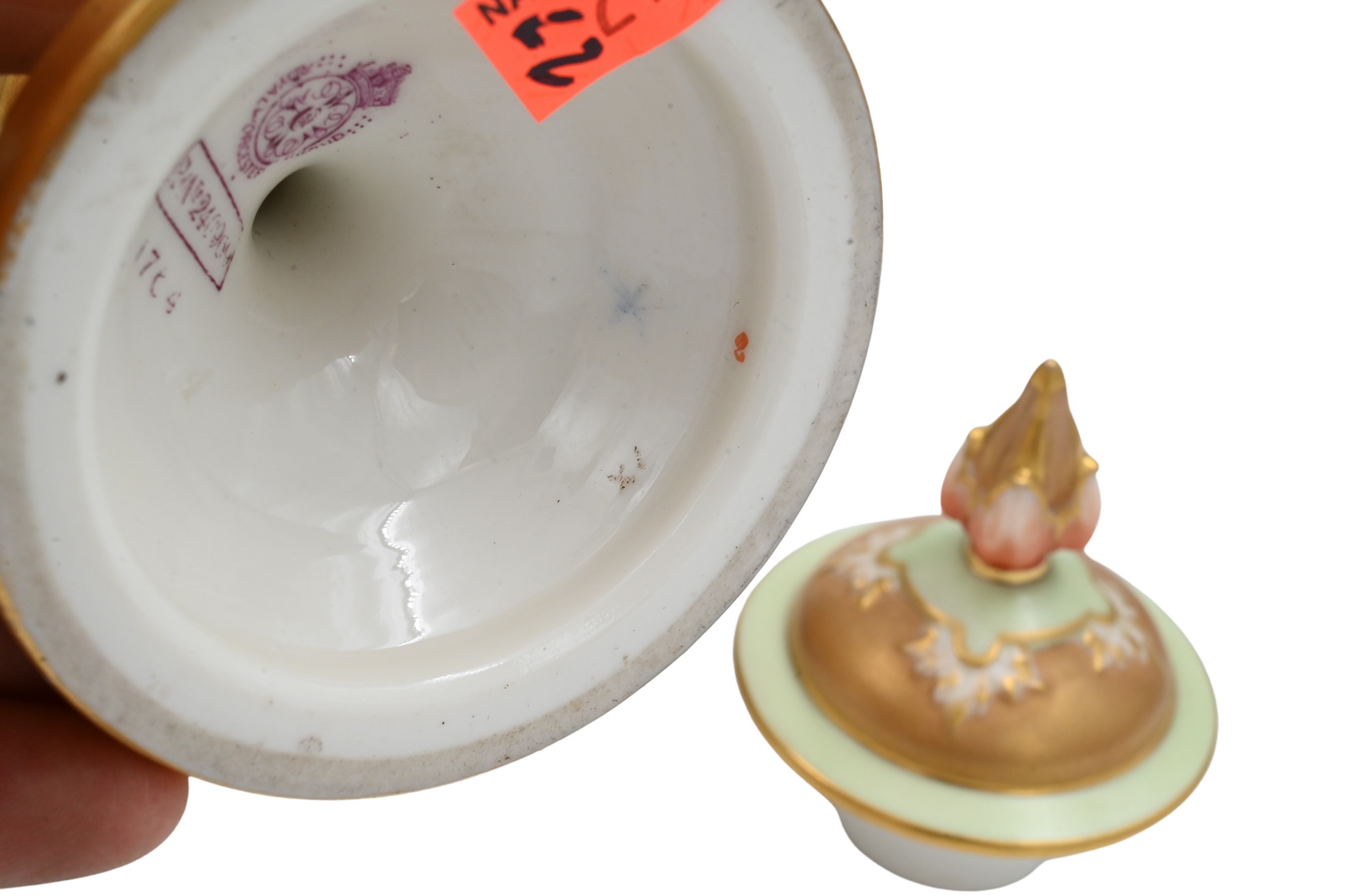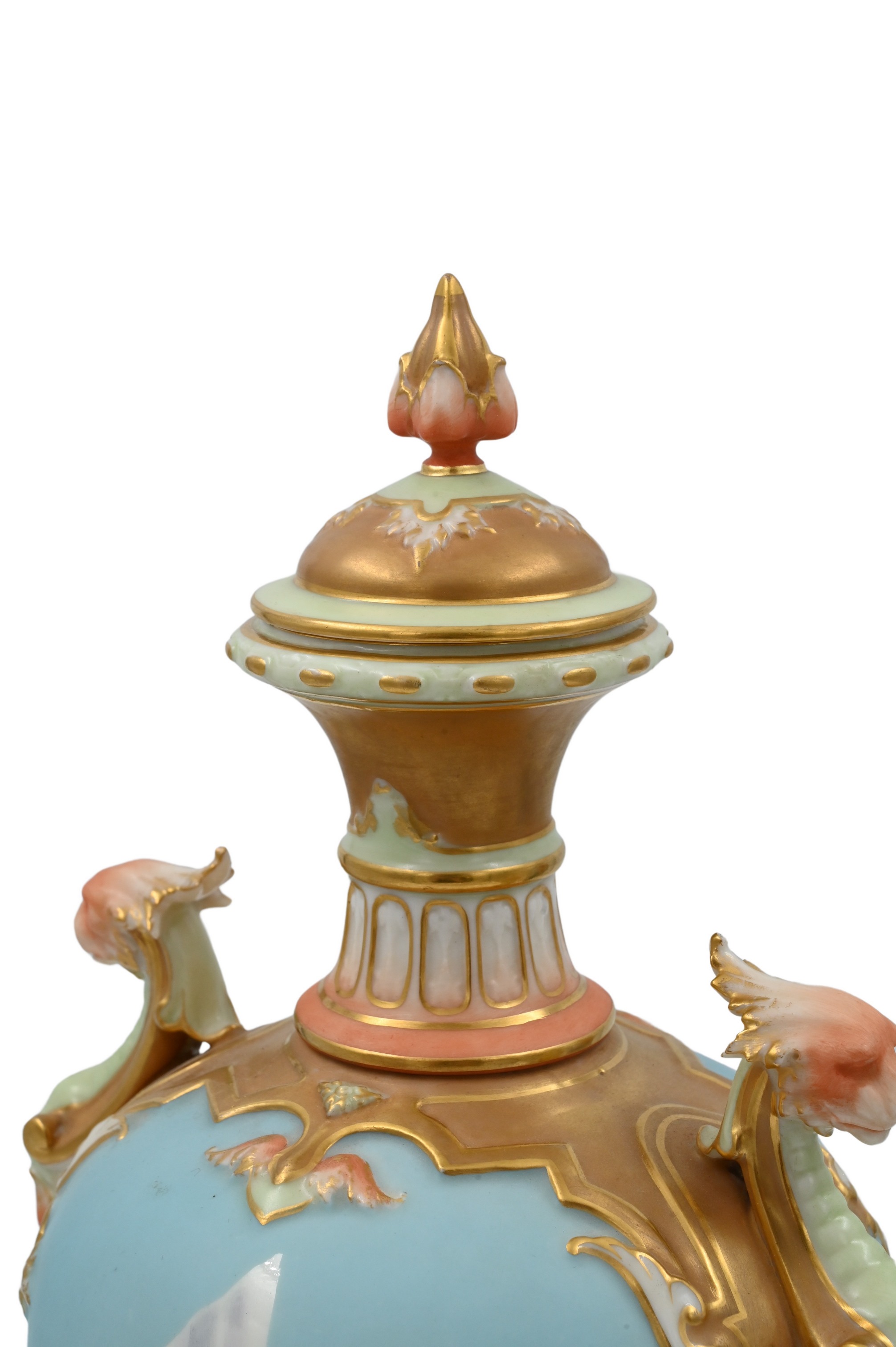 having a continuous icelandic scene with two polar bears, two peach and gilt colored griffin handles, having flame finial on lid, signed lower left “H. Davis”, purple Worcester mark on base, model number 240989, marked 1764