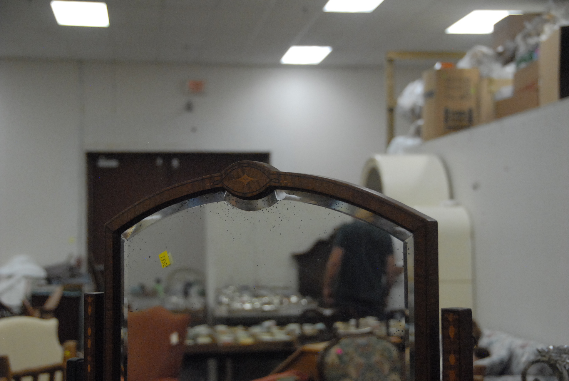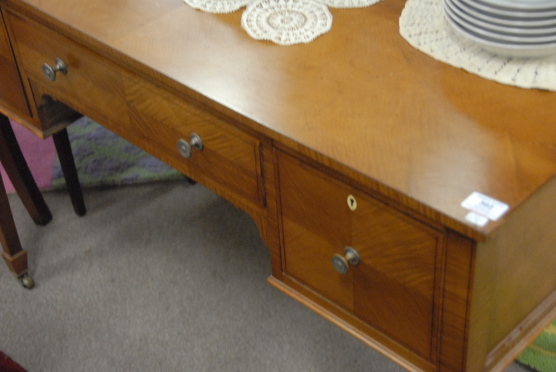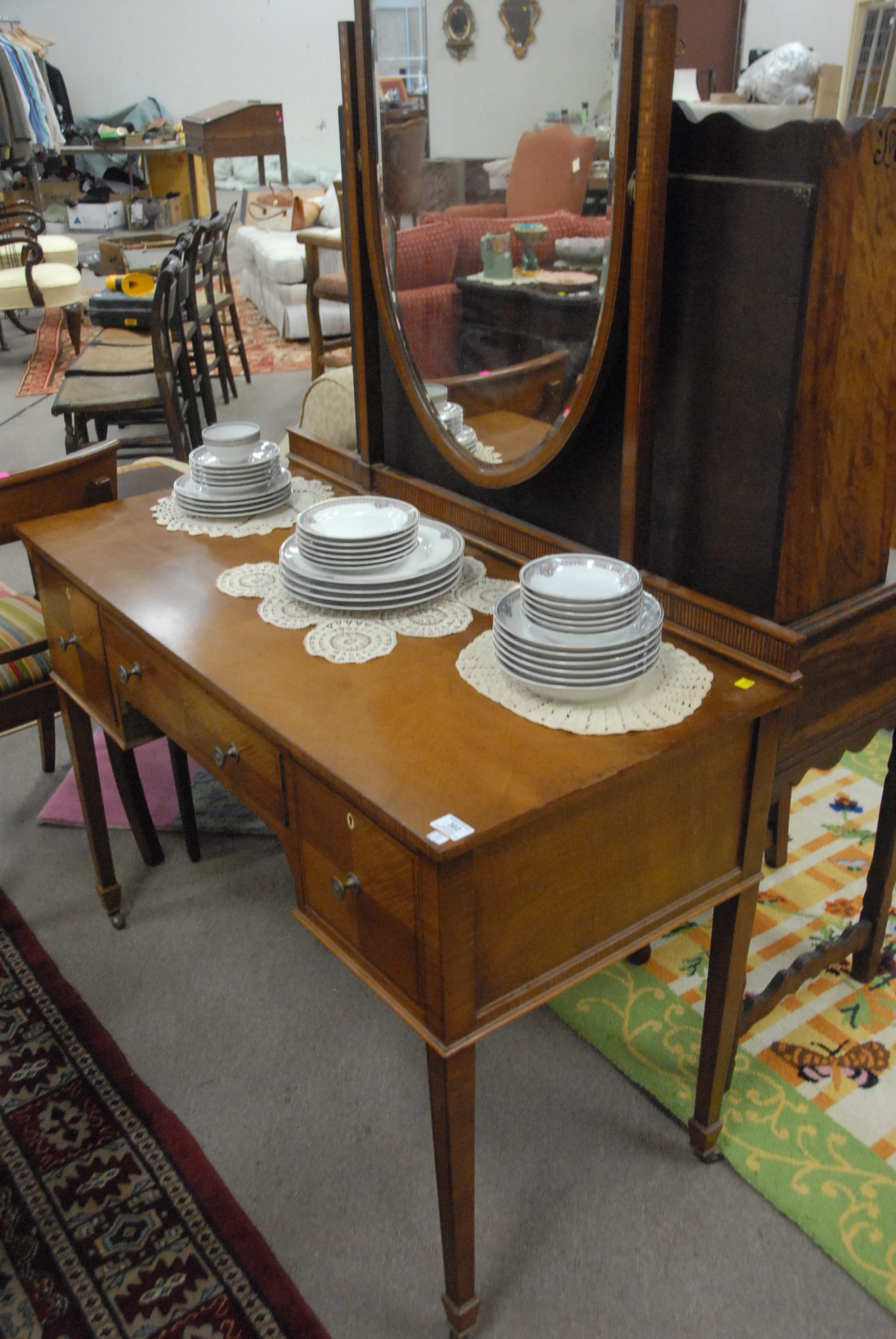 Inlaid three drawer vanity with shield form inlaid mirror, wd. 45 in.