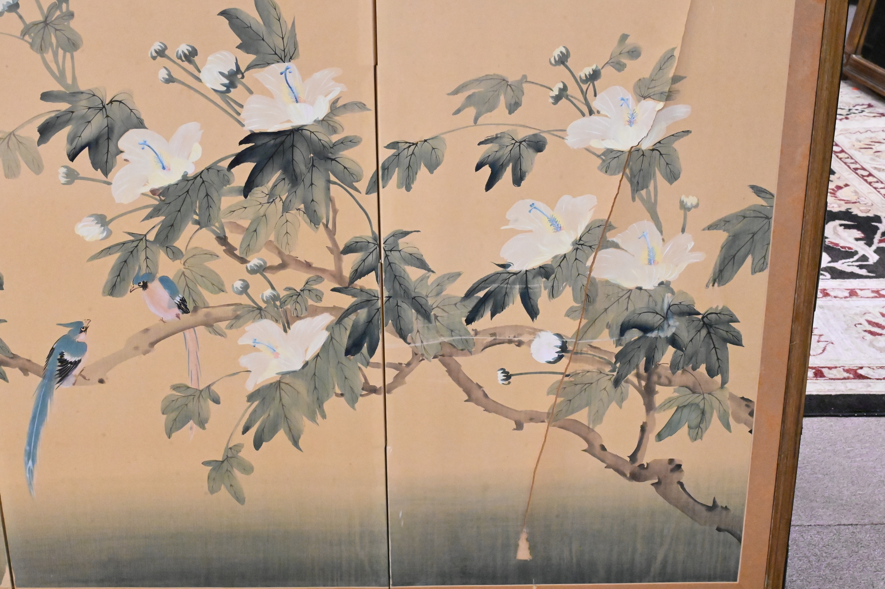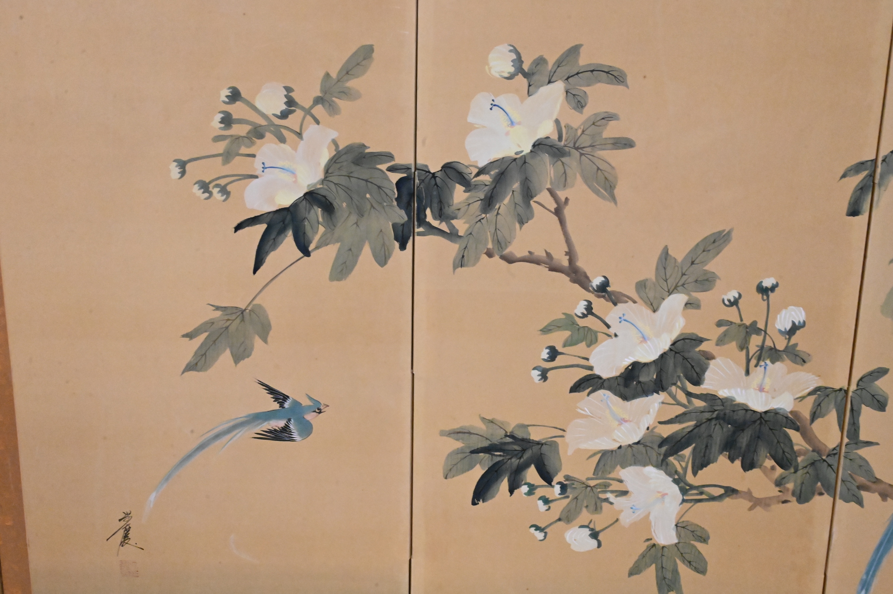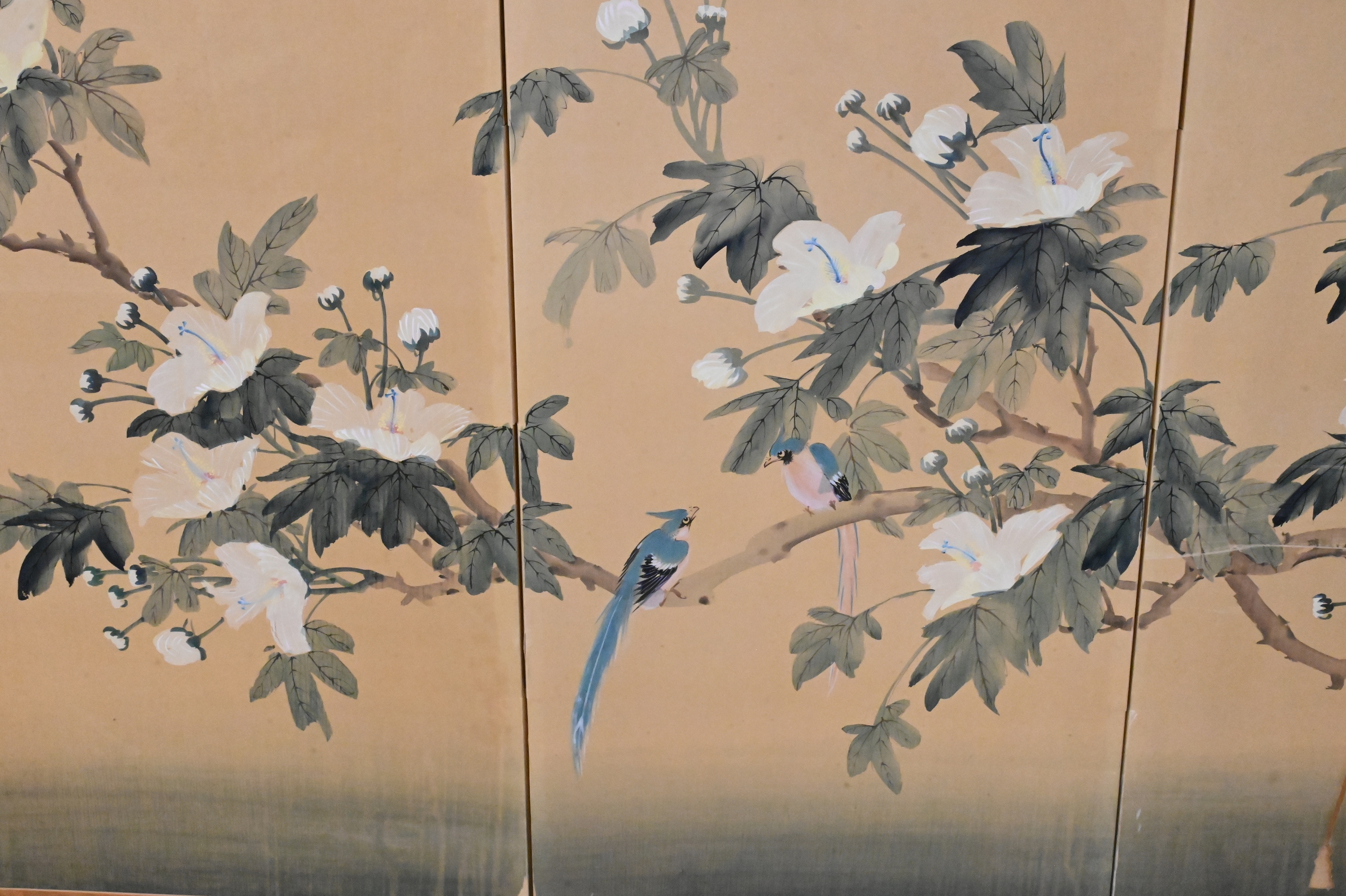 Each panel decorated in ink and color on yellow ground depicting flowering branches and birds, mounted within a wood frame, character mark lower left