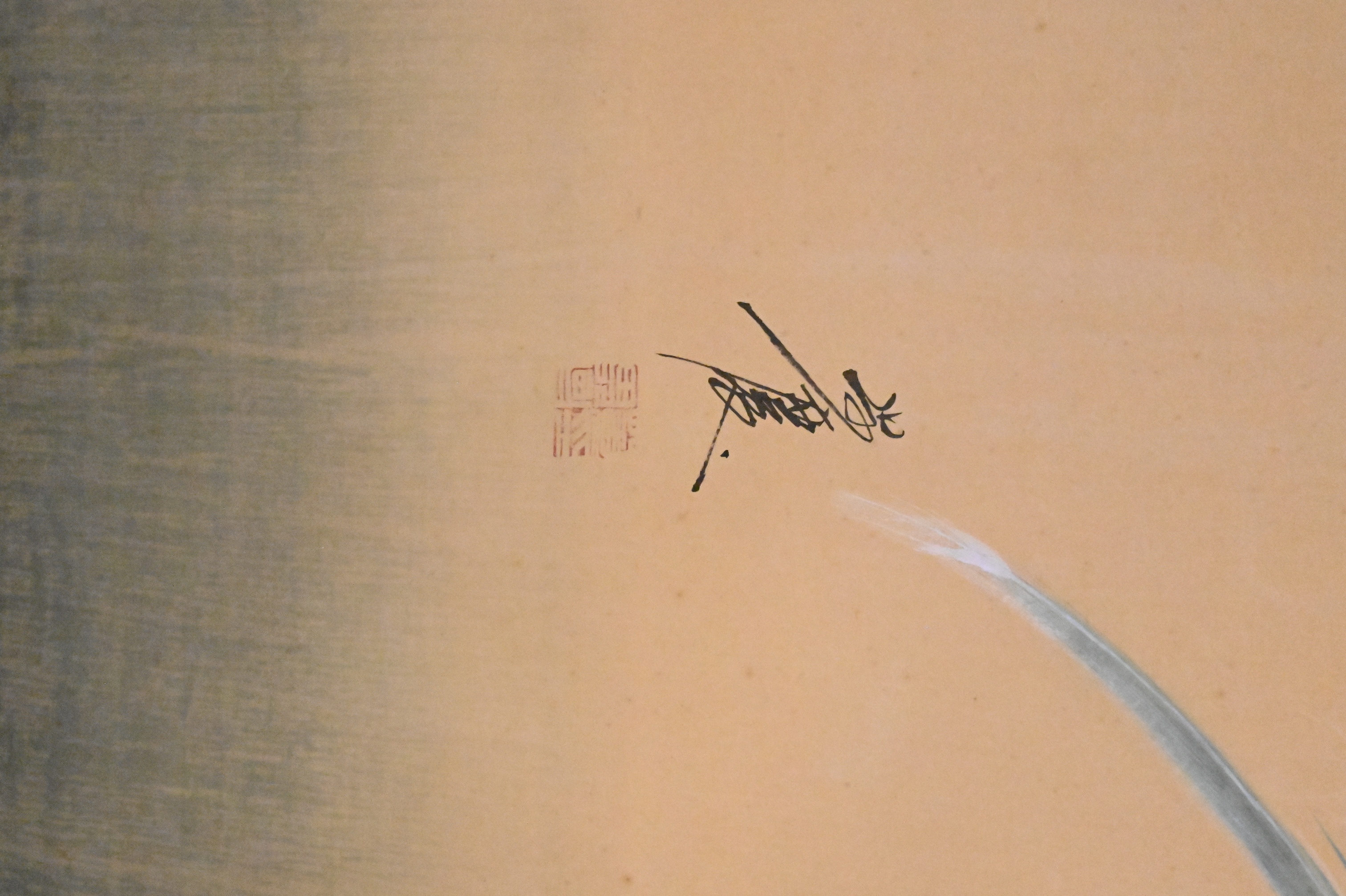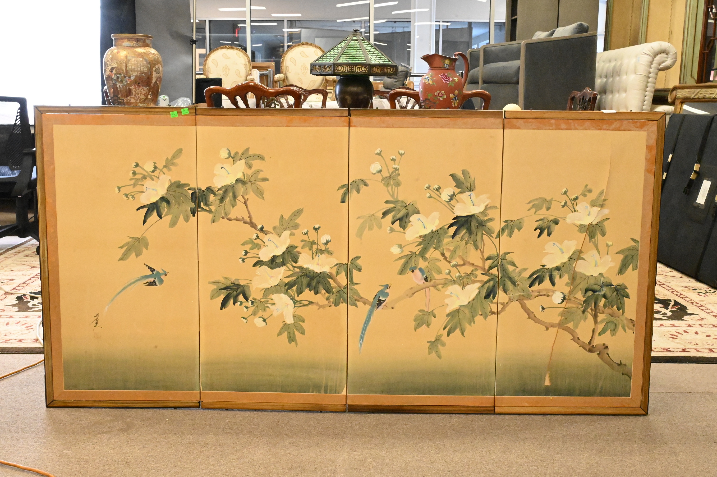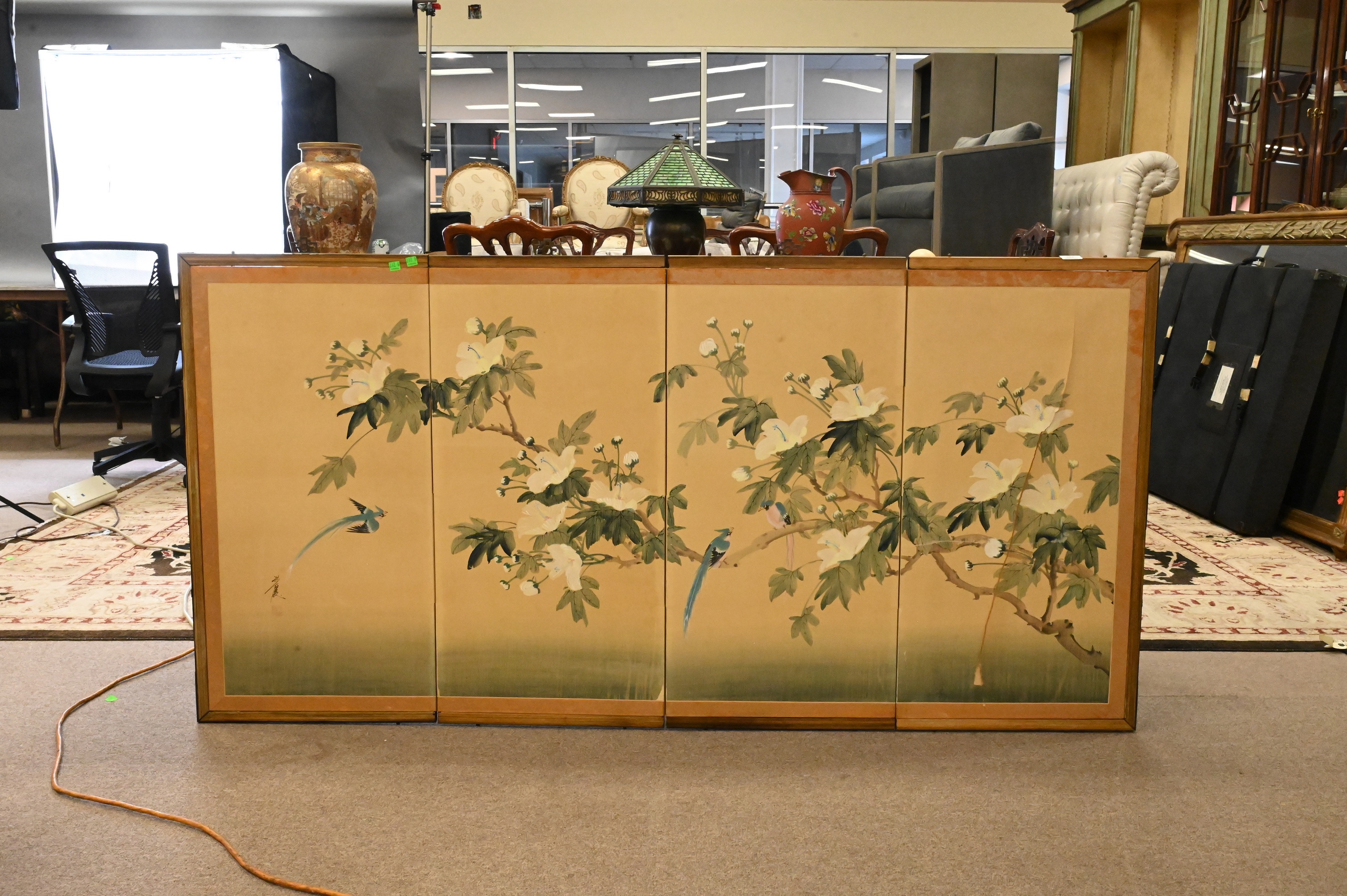 Each panel decorated in ink and color on yellow ground depicting flowering branches and birds, mounted within a wood frame, character mark lower left