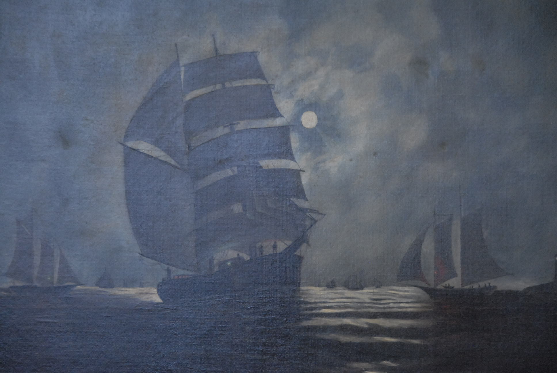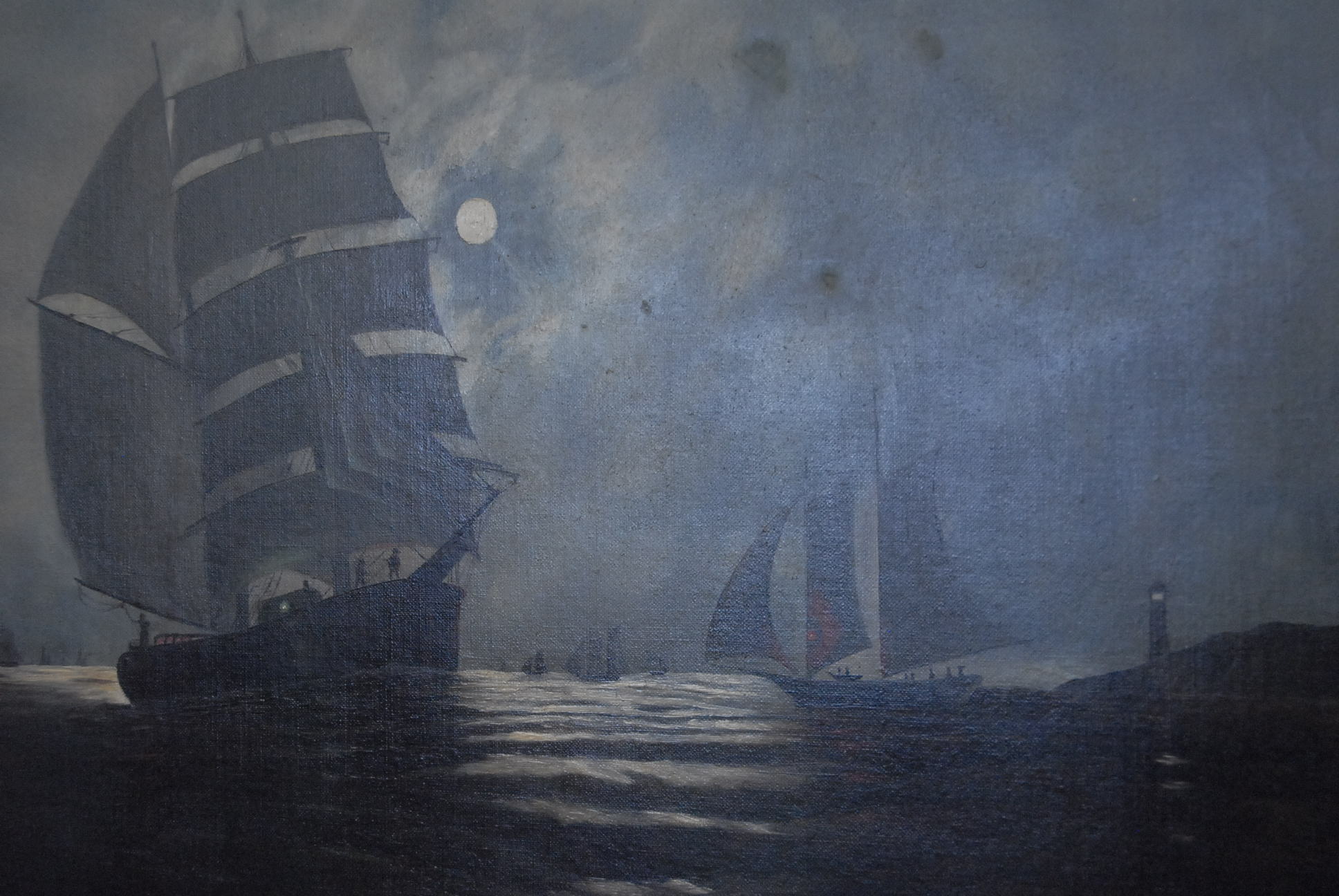Oil on canvas of nocturnal scene of sailboats